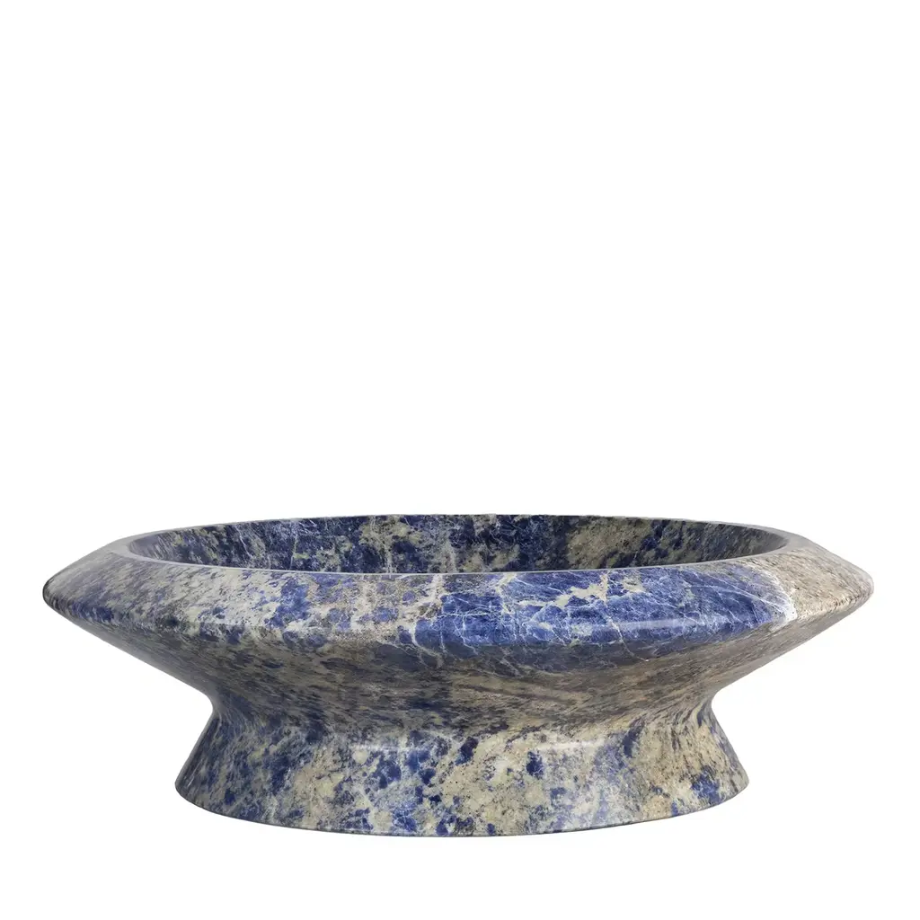 Centrepiece in Blue Sodalite marble, designed by Ivan Colominas - available in other marble colours.Mmairo loves wining and dining, good food and entertaining and, it loves marble. In the kitchen it is the perfect material: pure, smooth and easy to clean. Far from the monumentality by which it can be defined, this luxurious material has been shaped for an elegant table and impeccable service, into creative and unambiguous forms by the imagination of Spanish designer Ivan Colominas. The collection is a tribute to one of Italy’s great masters of design and architecture: Angelo Mangiarotti, creator of symbolic, marble design pieces, who is closely connected to the Apuan region and its craftsmen. The essential is visible, with a collection that offers infinite applications: serving, decorating, presenting, containing, tasting. The “material is served”, flawless and delectableSculptural, well-defined and multi-fold. Colominas has created a table service inspired by Angelo Mangiarotti’s soft lines, exalting the shape and structure of objects that characterize the exploration of one of the greatest pleasures afforded us, food. Size: 36.5 x 10 cm, polished finishing. Commercial name: Amaltea, Materia e Tavola Collection by the Spanish Designer Ivan Colominas. Available also in black Marquina, white Michelangelo, white Arabescato, green Guatemala, white onyx, black Portoro marbles. Made in Italy, hand finished.