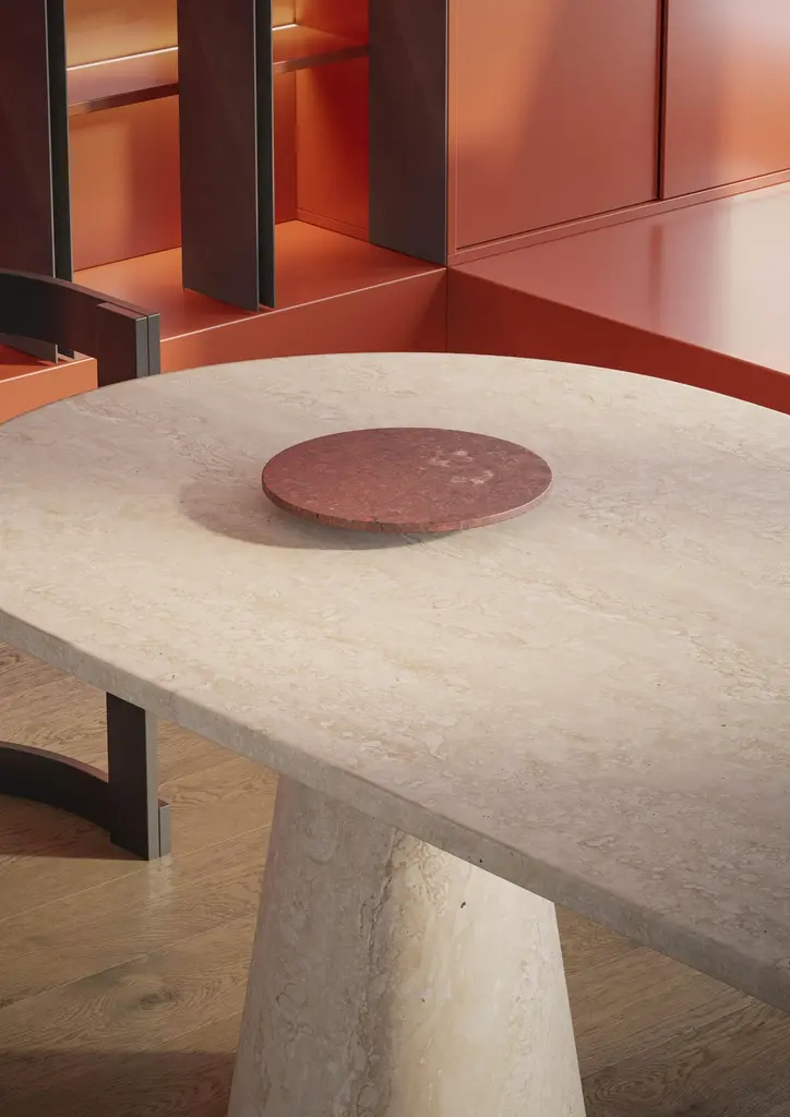 Karen Chekerdjian expands her iconic Inside Out collection with the new Large Dining Table—a bold yet essential centerpiece for contemporary interiors. This new iteration introduces two rotating accessories: a tray with a subtle raised edge, and a flat plate, both designed to move gracefully across the surface.The new Tray and Plate (made in Travertine Red and Travertine Silver) join the existing interchangeable candle holder and fruit basket, available also as standalone objects. A seamless fusion of function and poetry, Inside Out redefines the dining ritual with elegance and intention.Commercial name: Inside out Large Dining table, by the Lebanese designer Karen Chekerdjian. Travertine NavonaSize: 220 x 100 x 74 cm. 86.6 x 39.4 x 29.1 in Made in Italy, hand finished.