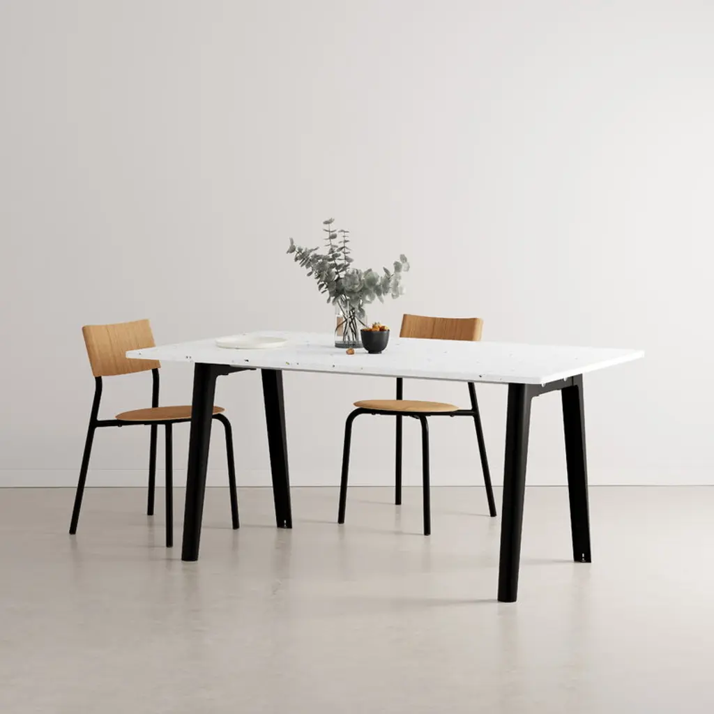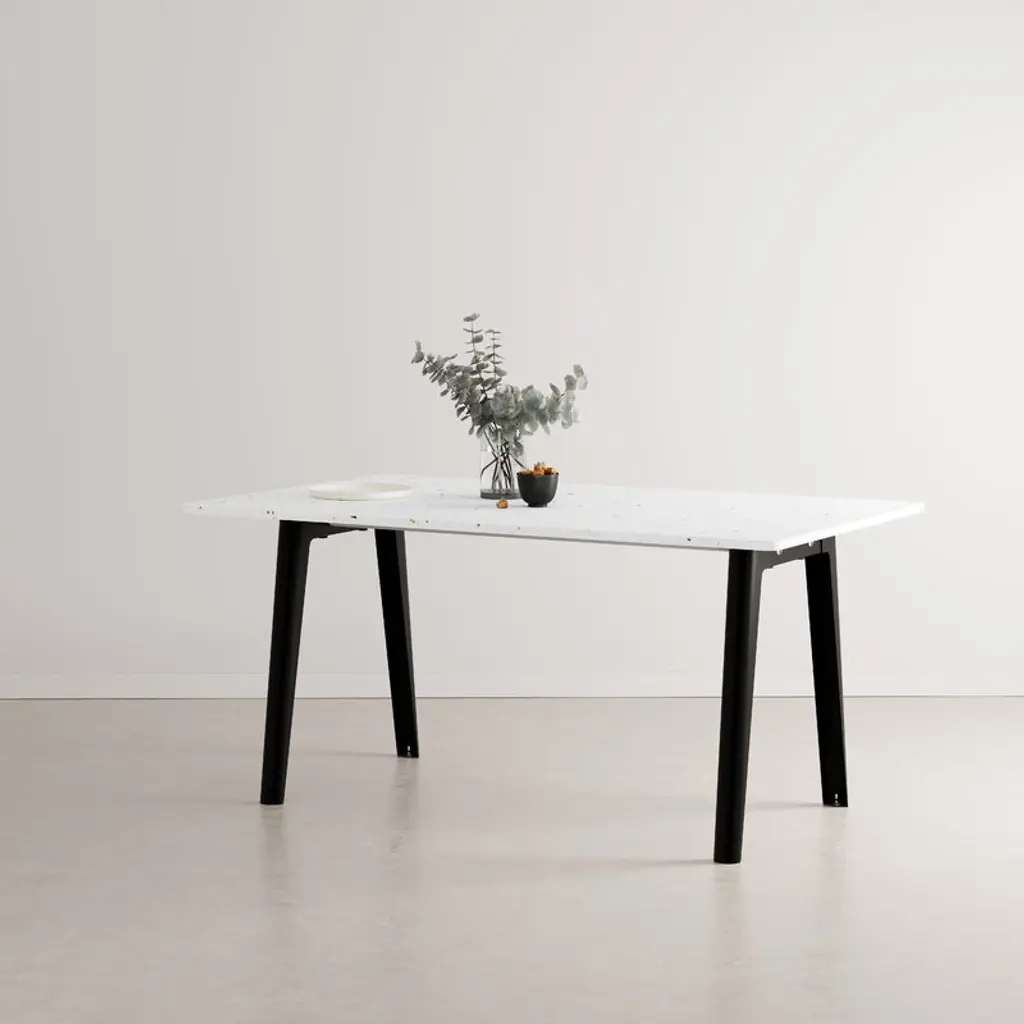 TIPTOE’s New Modern table is composed of a recycled plastic tabletop made from hundreds of yogurt cups – hence the vivid terrazzo-like surface – and a streamlined steel frame, which consists of two pairs of trestle legs. The dining table was designed using as few parts as possible, and each part is made from durable and easily recyclable materials. The New Modern table is quick to assemble and disassemble, and it can be stored in a small space if needed. The name of the New Modern collection is a tribute to the era of modern architecture and design that flourished especially in the mid-20th century. The tables share a beautiful, functional and minimalist appearance that reinterprets the ideals of modernist esthetics, and the sturdy, modular structure and multiple color options make them well suited for a wide range of spaces and styles. All parts of the New Modern tables are manufactured in Europe, and the final assembly is carried out in France in a center that promotes the social and work integration of persons with disabilities.