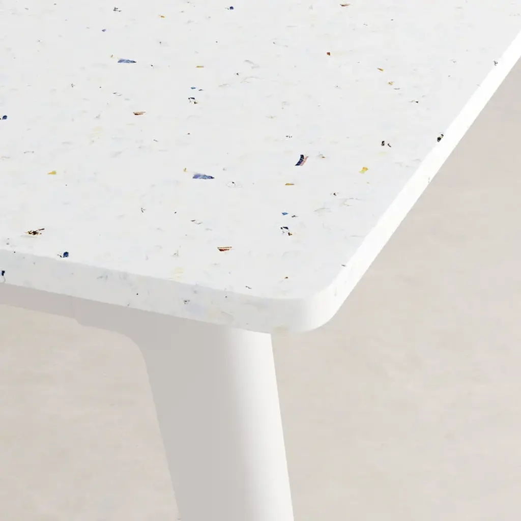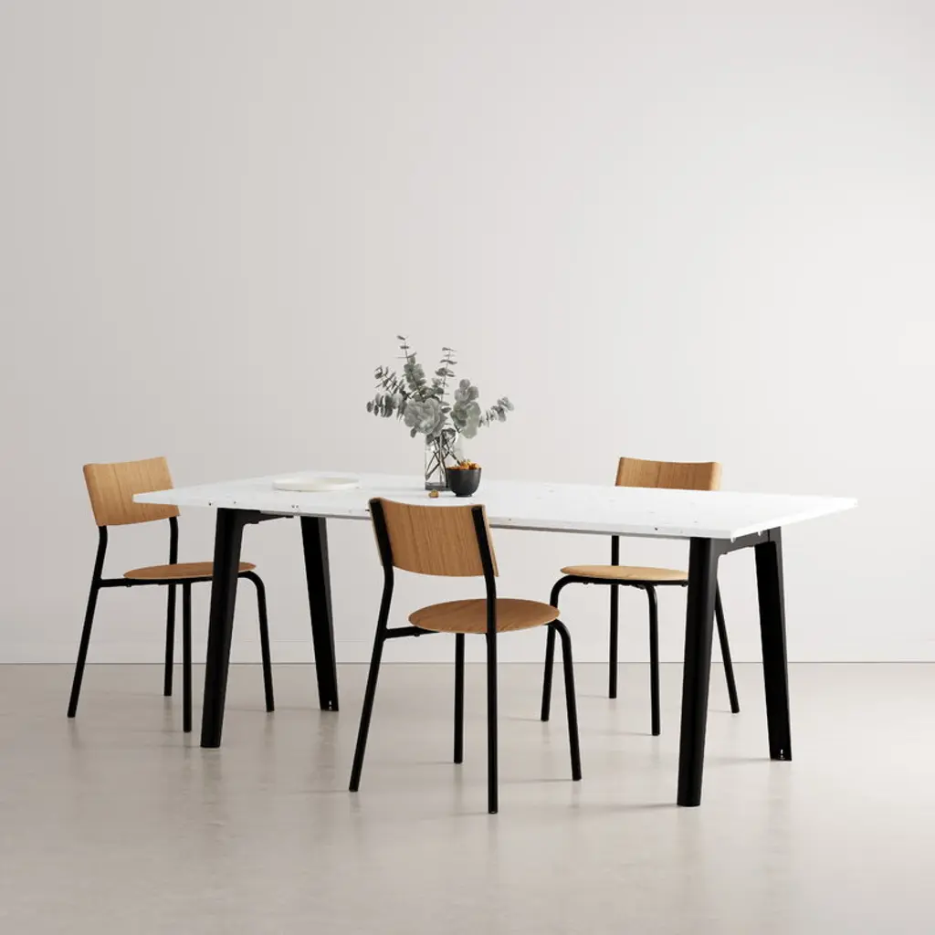 TIPTOE’s New Modern table is composed of a recycled plastic tabletop made from hundreds of yogurt cups – hence the vivid terrazzo-like surface – and a streamlined steel frame, which consists of two pairs of trestle legs. The dining table was designed using as few parts as possible, and each part is made from durable and easily recyclable materials. The New Modern table is quick to assemble and disassemble, and it can be stored in a small space if needed. The name of the New Modern collection is a tribute to the era of modern architecture and design that flourished especially in the mid-20th century. The tables share a beautiful, functional and minimalist appearance that reinterprets the ideals of modernist esthetics, and the sturdy, modular structure and multiple color options make them well suited for a wide range of spaces and styles. All parts of the New Modern tables are manufactured in Europe, and the final assembly is carried out in France in a center that promotes the social and work integration of persons with disabilities.