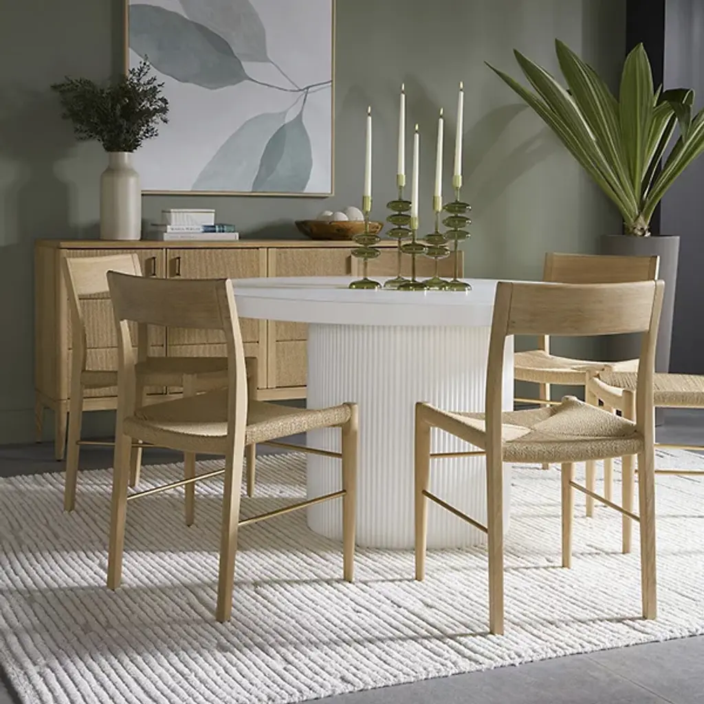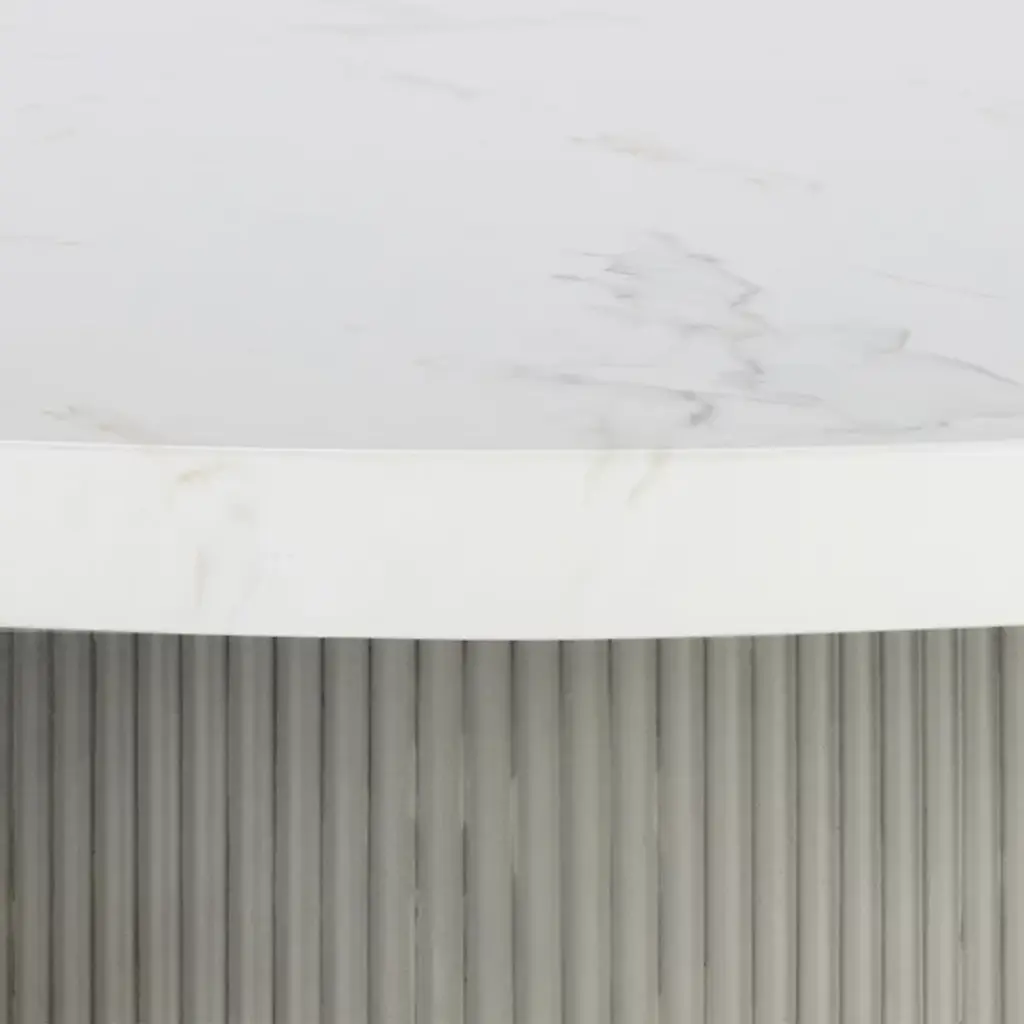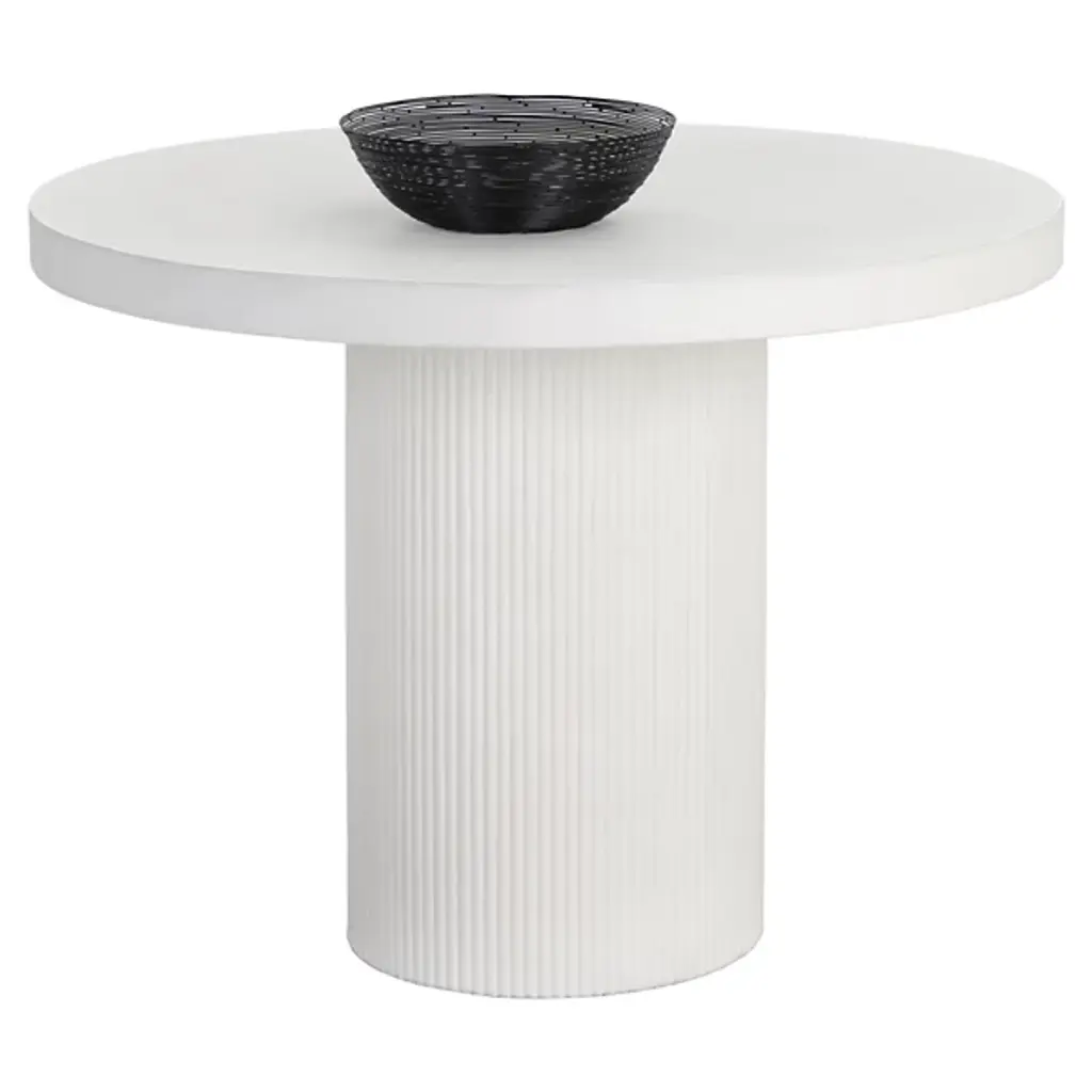 The Nicolette Outdoor Dining Table from Sunpan features a contemporary and refined design, making it a stylish addition to any space. It features an elegant fluted table base that enhances its modern aesthetic. Crafted from a natural concrete mix, each piece is unique, with variations in color, texture, imperfections, surface scratches, and non-structural hairline cracks that are inherent and valued qualities of the material. This table combines durability with distinctive charm and is suitable for indoor and covered outdoor spaces.