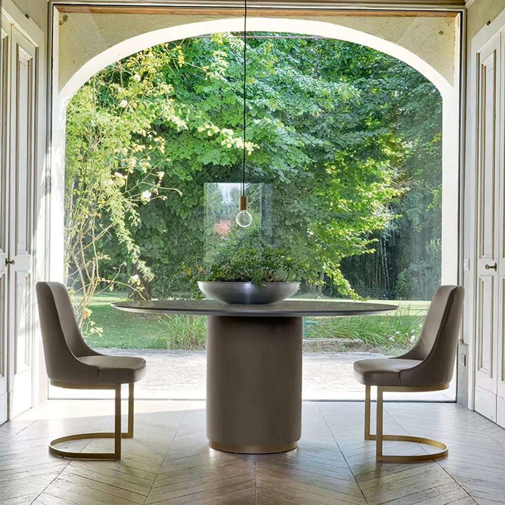 This round table features a top crafted from Sycamore wood with a frisé pattern, finished in a sophisticated "Lupo opaco" grey stain. The leg is elegantly wrapped in Asphalt leather and complemented by burnished Brass details, offering a refined contrast. The combination of materials creates a striking balance between natural wood, sleek leather, and metal accents. This table can be fully customized with a range of alternative woods and finishes.