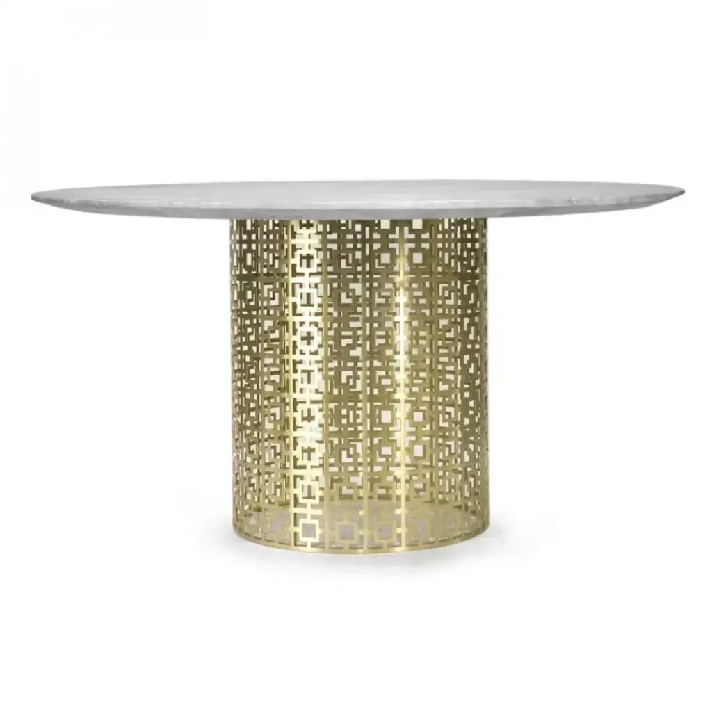 Graphic Glamour. Comfortably seats six or moonlights as an ideal game table for an unused corner of your living room. Our signature Nixon pattern rendered in polished nickel or brushed brass provides a sophisticated perch for your choice of couture tabletop, including white marble for your Park Avenue penthouse, black marble for your bold bachelor pad, and glossy lacquer for your West Village aerie.