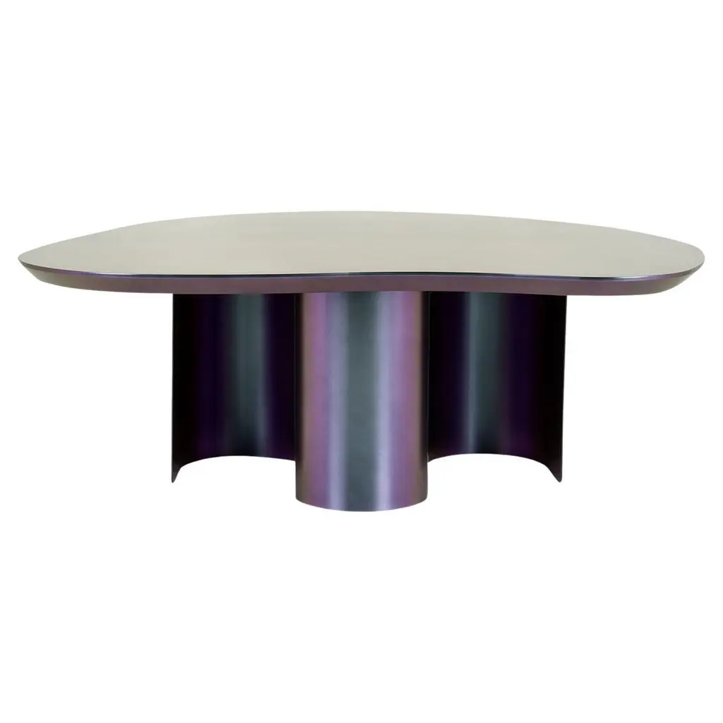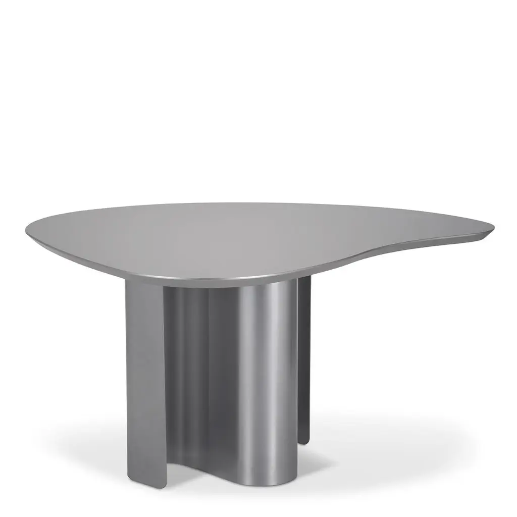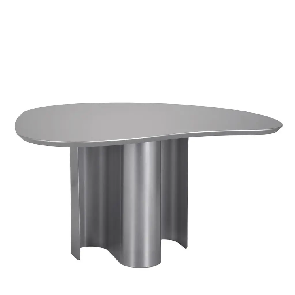 The North Light High Gray Chrome Dining Table features a polished plated chrome tubular metal frame with a distinctive fluid silhouette inspired by the northern skies and aurora borealis. Its organically curved top and sculptural base evoke ethereal luminosity and dynamic movement. Designed by Vladislav Tolochko, this statement table combines artistic expression with functional elegance.