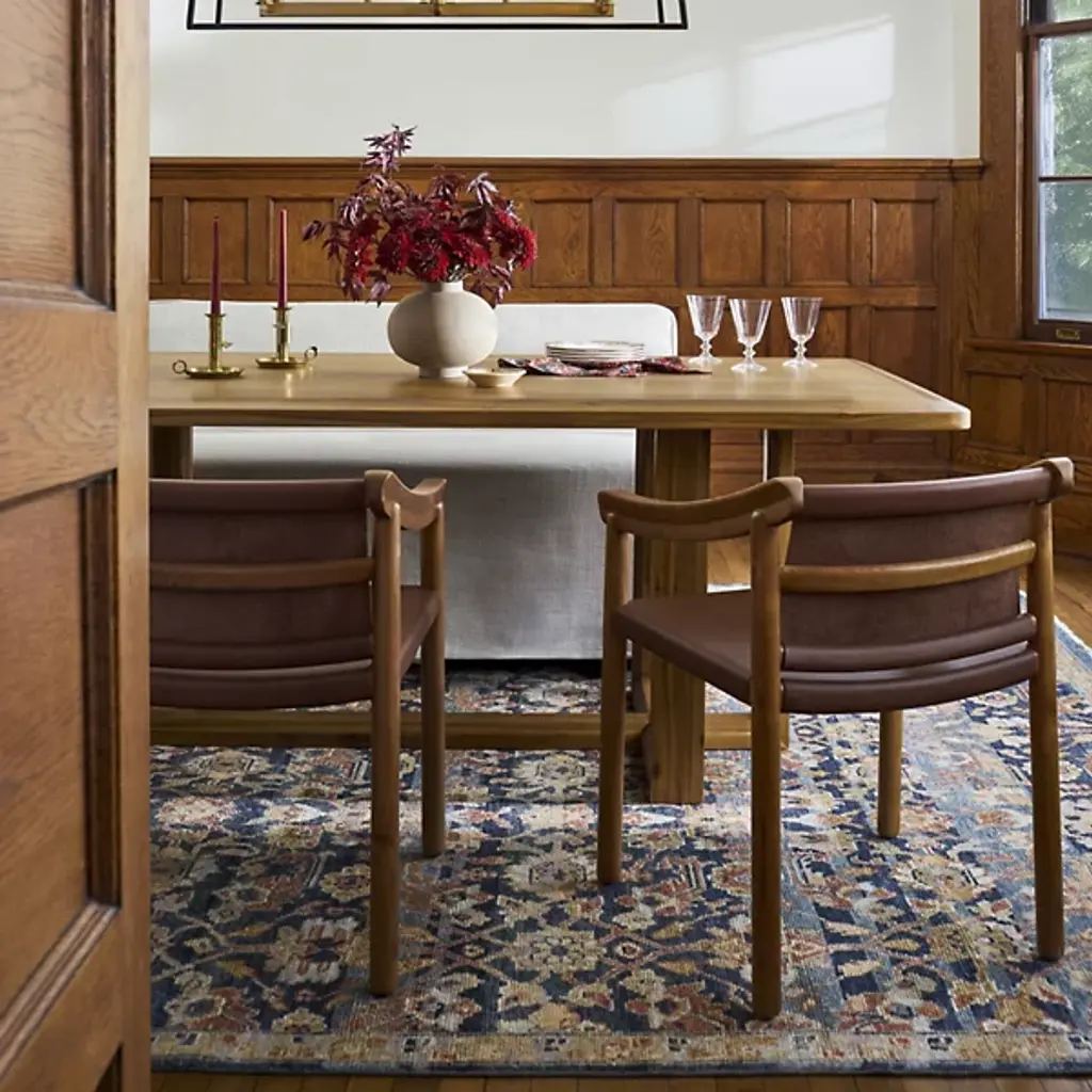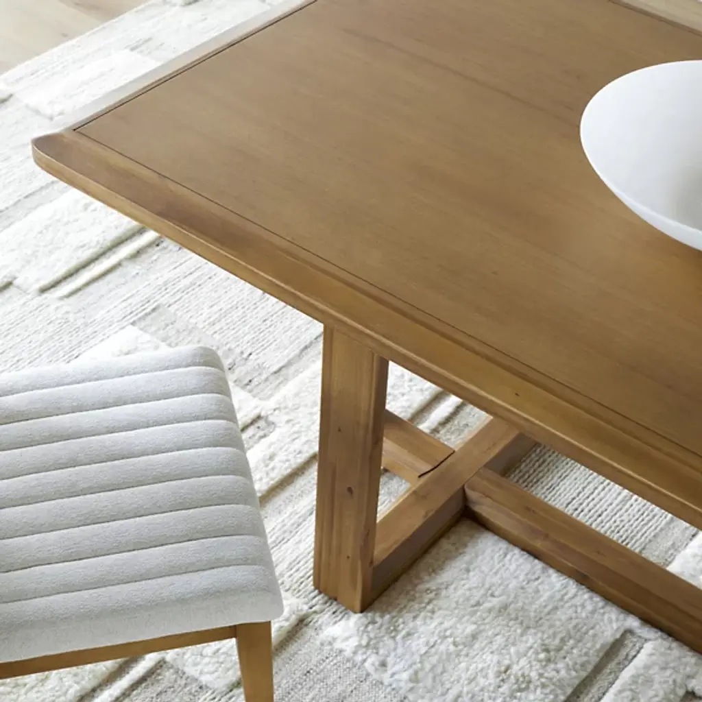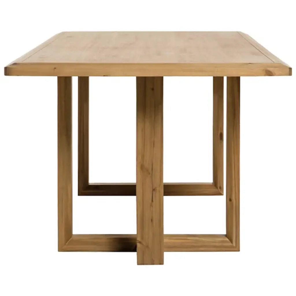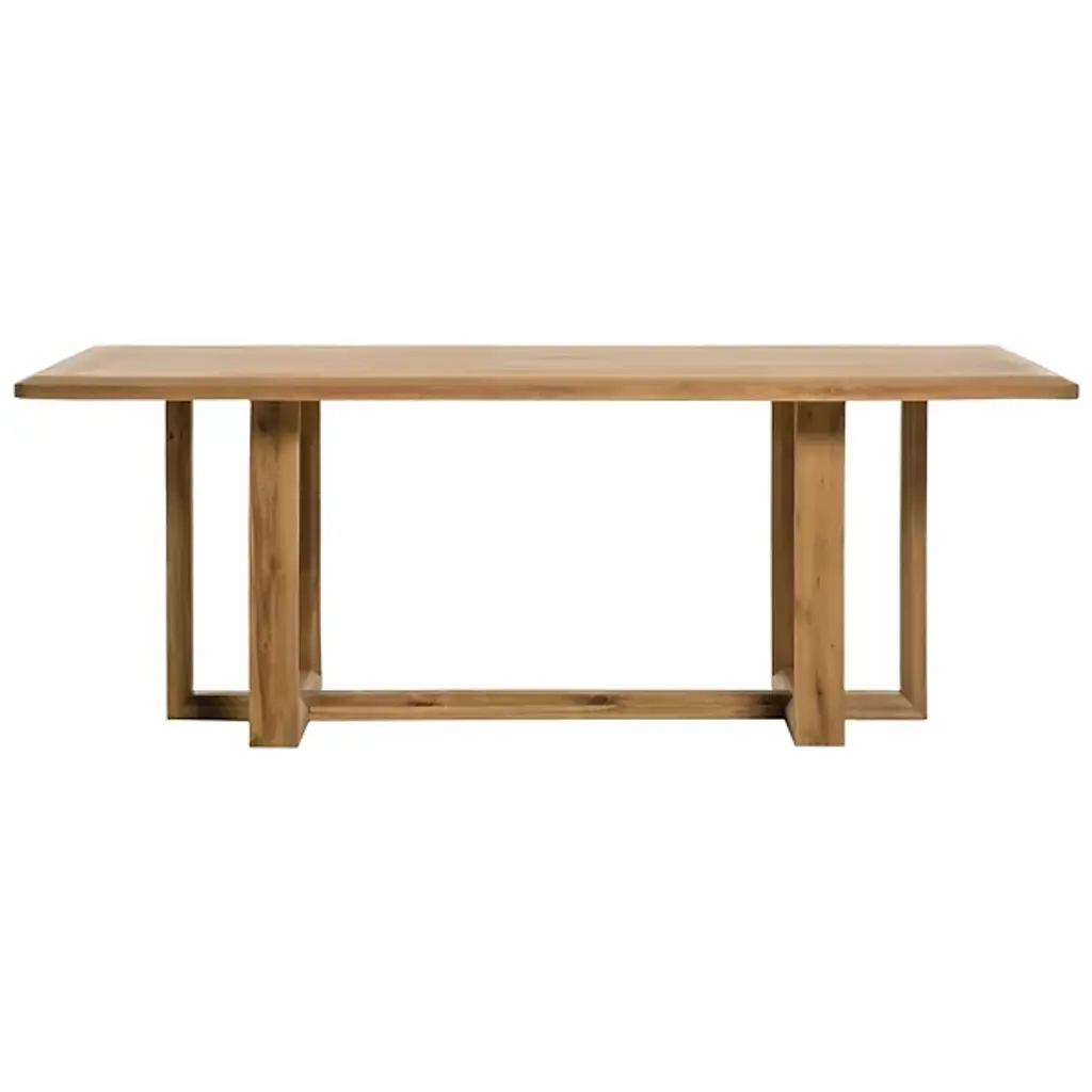 The Northbank Dining Table from Surya combines clean lines and bold geometry for a standout centerpiece. Made from robust and smooth acacia wood with the grain on full display, its rectangular tabletop features beveled edges that add welcome refinement. Below, an angular upturned bracket-style base showcases two short brackets joined by a central beam, creating a striking architectural foundation that provides strength and style. Made in Vietnam, this table merges modern simplicity with contemporary flair, elevating your dining space with its architectural simplicity.