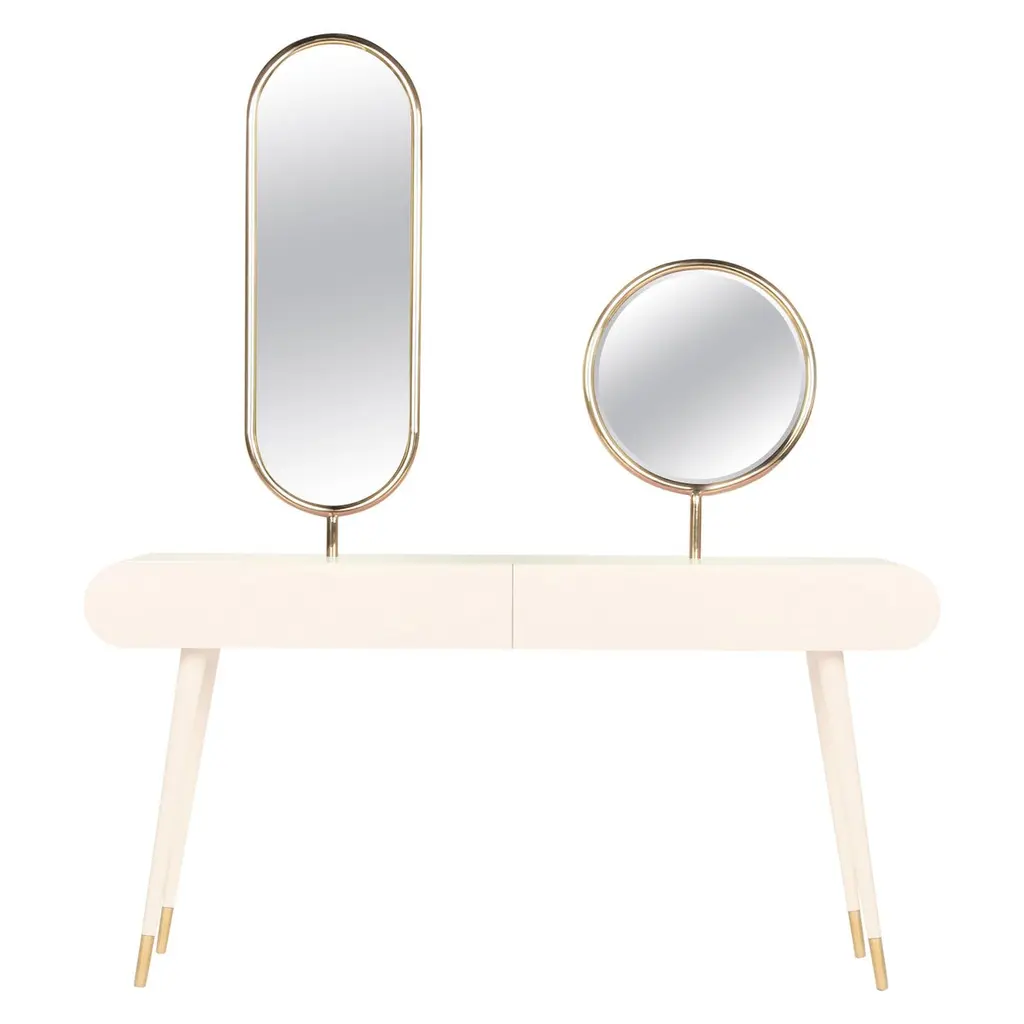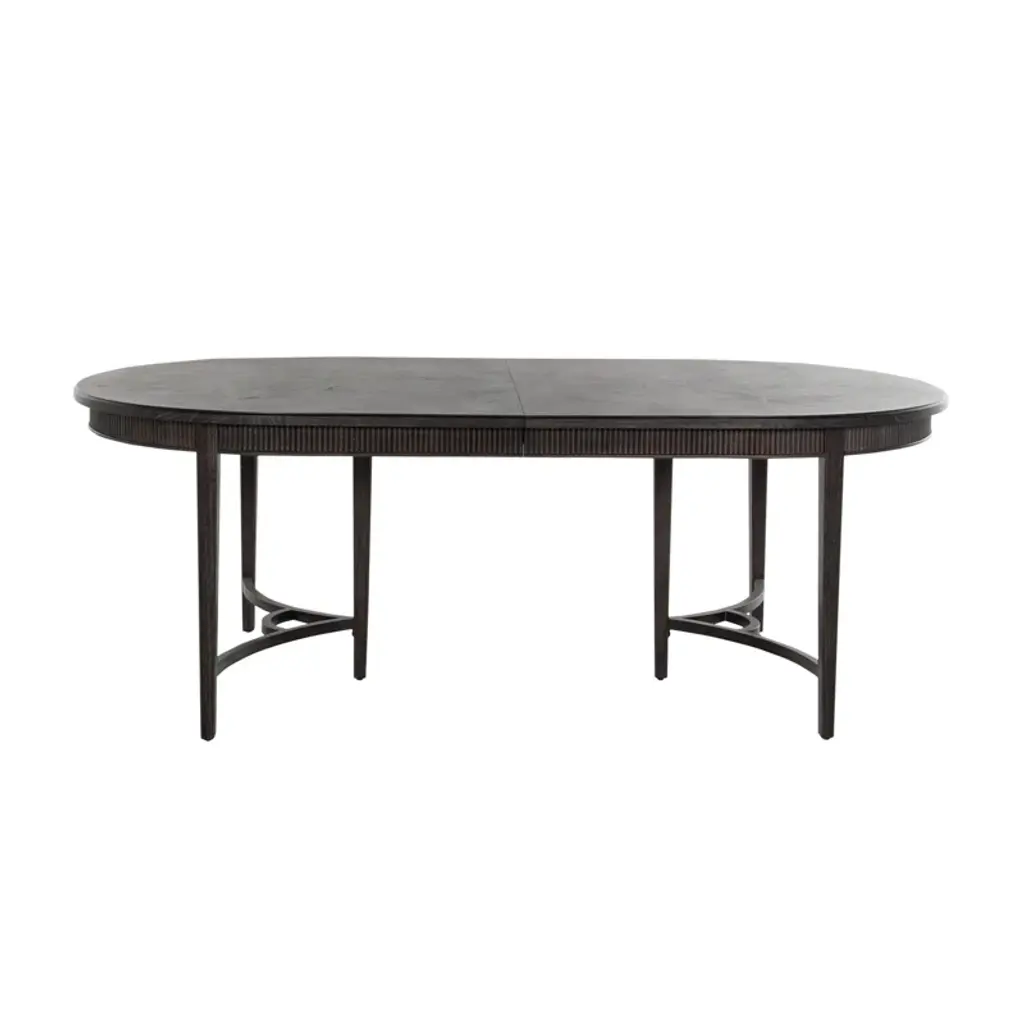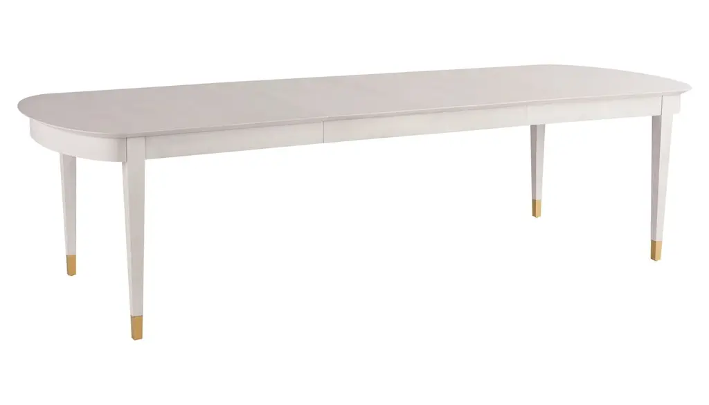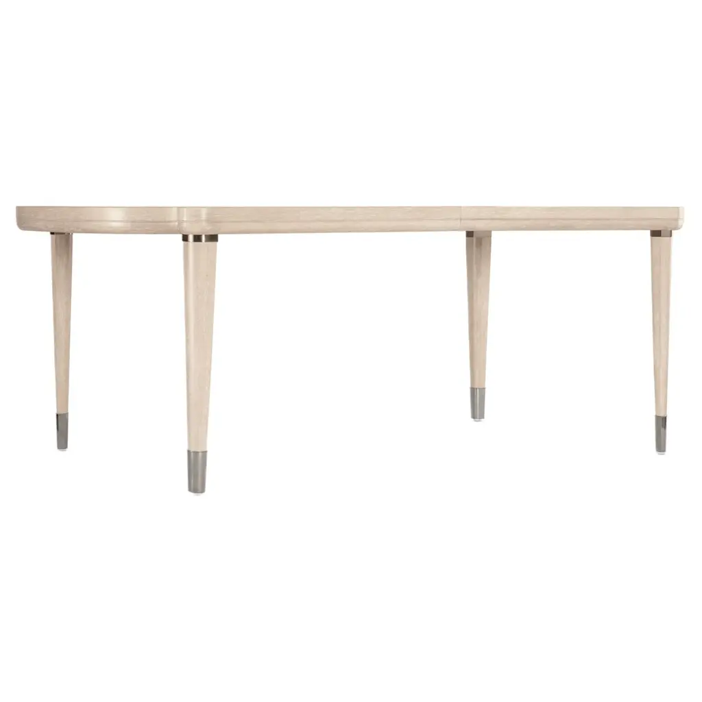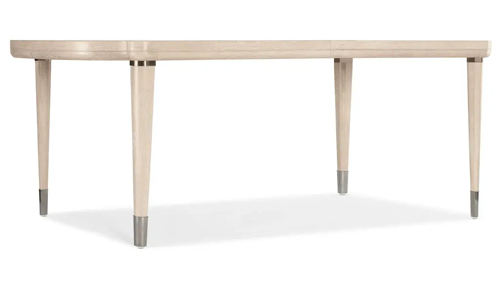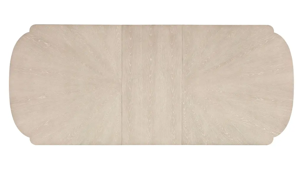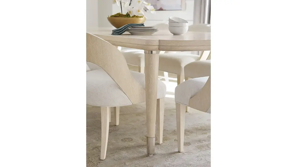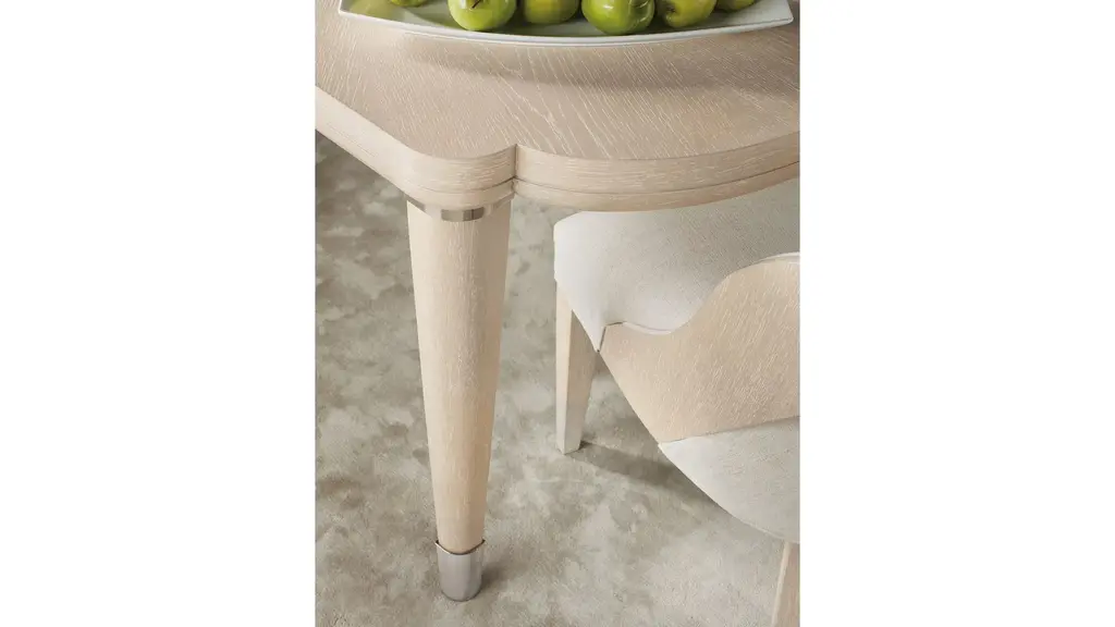 Bring serene style and calm chic to your gatherings with the Nouveau Chic Dining Table. Crafted of Quartered and Cathedral Oak Veneers with light wire brushing to create the Sandstone finish, the table has curved, scalloped ends and metal ferrules on the legs, along with a metal accent at the top of the legs. With one 22-inch leaf, the table extends to 104 inches to accommodate 8 guests and six guests without the leaf.