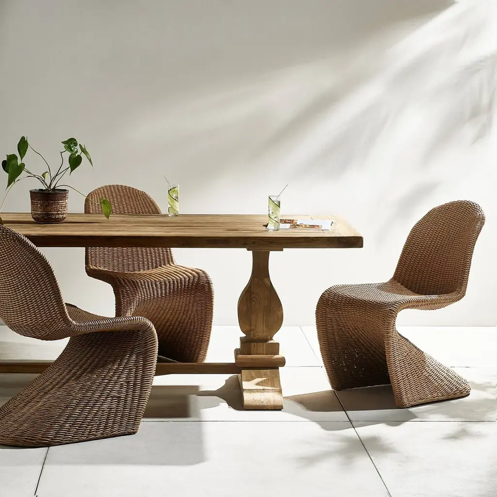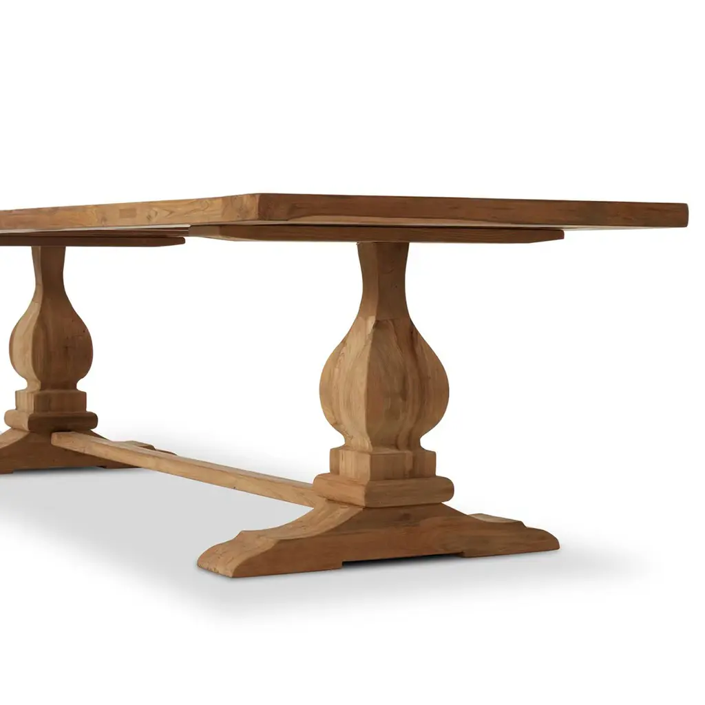 Inspired by vintage French design, reclaimed FSC-certified teak adds character to this sustainably made outdoor dining table. Knots, holes and patches will be present on each piece, adding unique dimension. Cover or store inside during inclement weather and when not in use. In Stock Early August Natural teak construction This image is for illustrative purposes only. The colors shown are accurate within the constraints of lighting, photography, and the color accuracy of your screen.