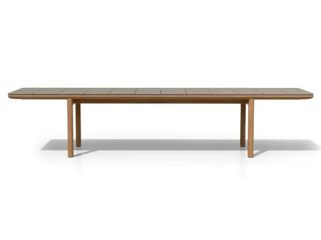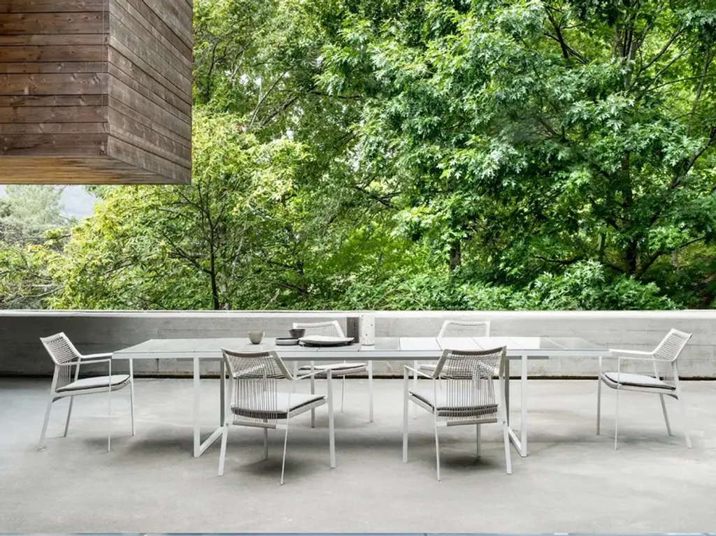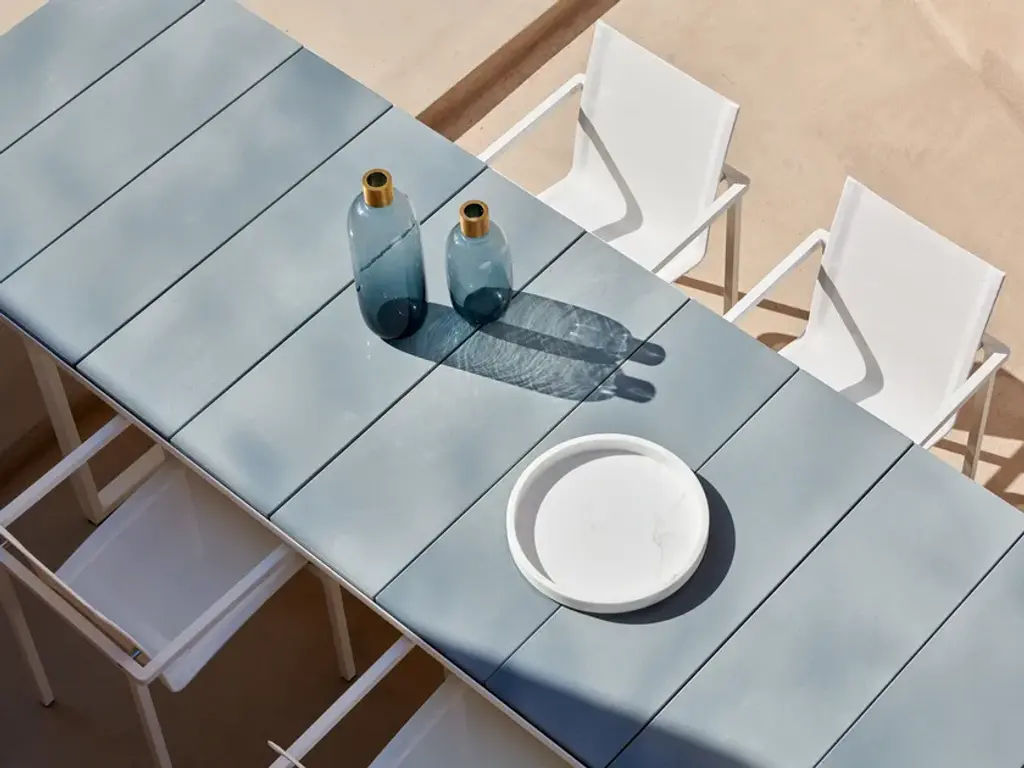 The airy Nodi chair can be excellently combined with the new Nox table that, with its generous length of 3.60 meters, offers space for generous company. The Nox table stands out with its handmade tabletop of glazed lava stone. Because beauty hides in imperfection, Tribù opted for a subtle craquelure effect. No tabletop is the same thanks to the natural imperfections in the reflective lava stone. The enamel layer makes the natural stone water, heat, frost, UV, and stain-resistant. The Nox tabletop rests on strong, slender supports made from powder-coated stainless steel. Thanks to this, the table is surprisingly light and elegant, despite the heavy stone tabletop.https://www.tribu.com/en/collections/nox/dining-table/Materials: Frame: powder coated stainless steel (highly durable lacquer) Tabletop: glazed lava stoneColours: Frame: white or wengé Tabletop: linen or ocean