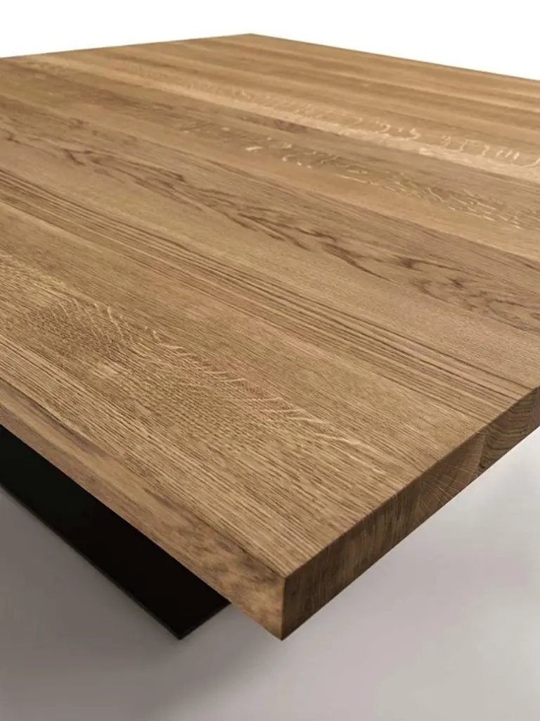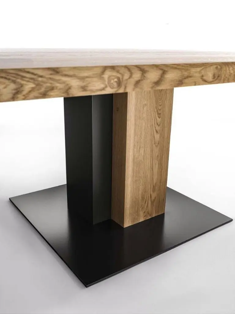 Dining Table oak and iron square in solid natural oak wood and with lacquered iron.Base made in on block of oak wood and made withlacquered iron. Oak treated with natural pine extractswax. Elegant and original piece. Also available in solid walnut wood, on request.