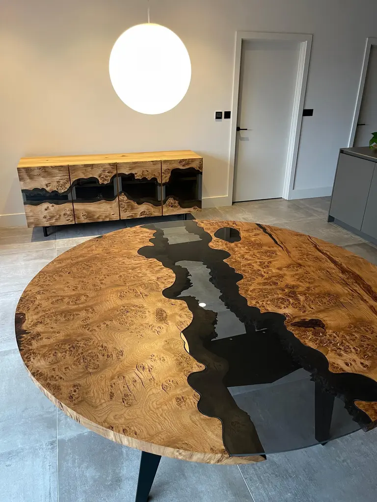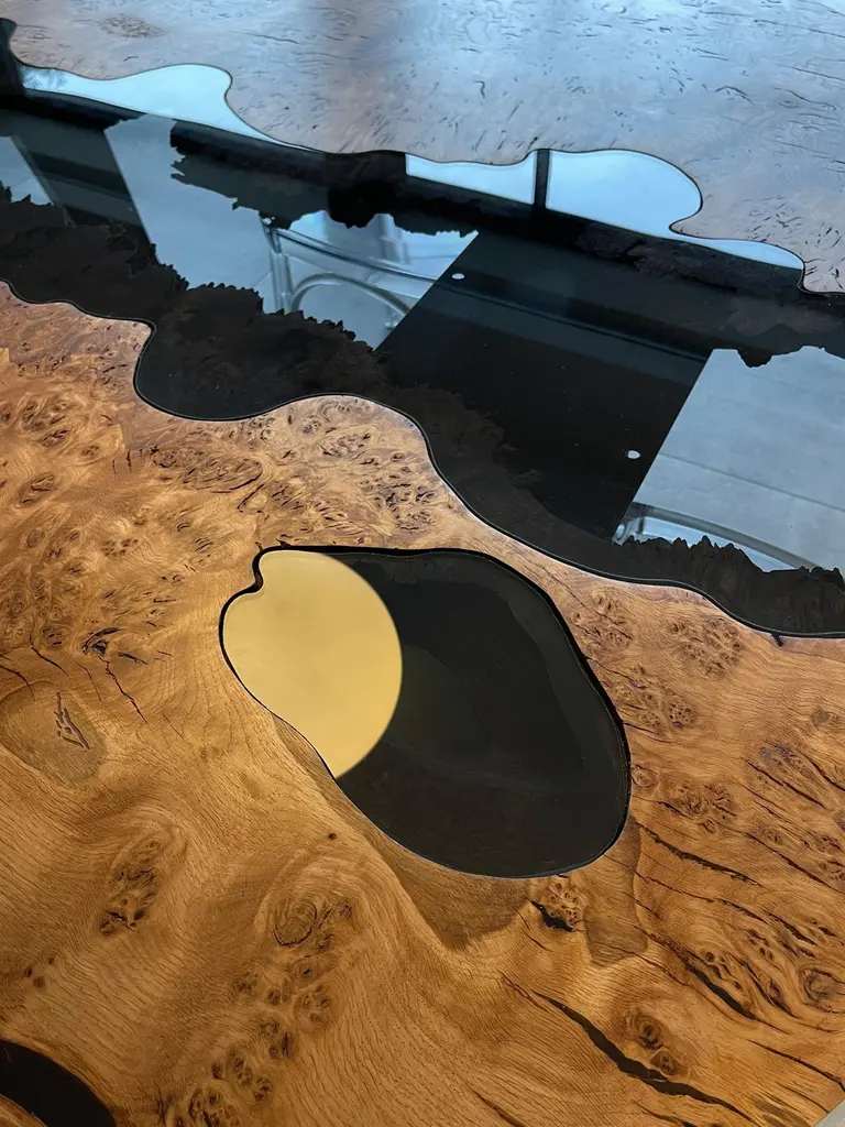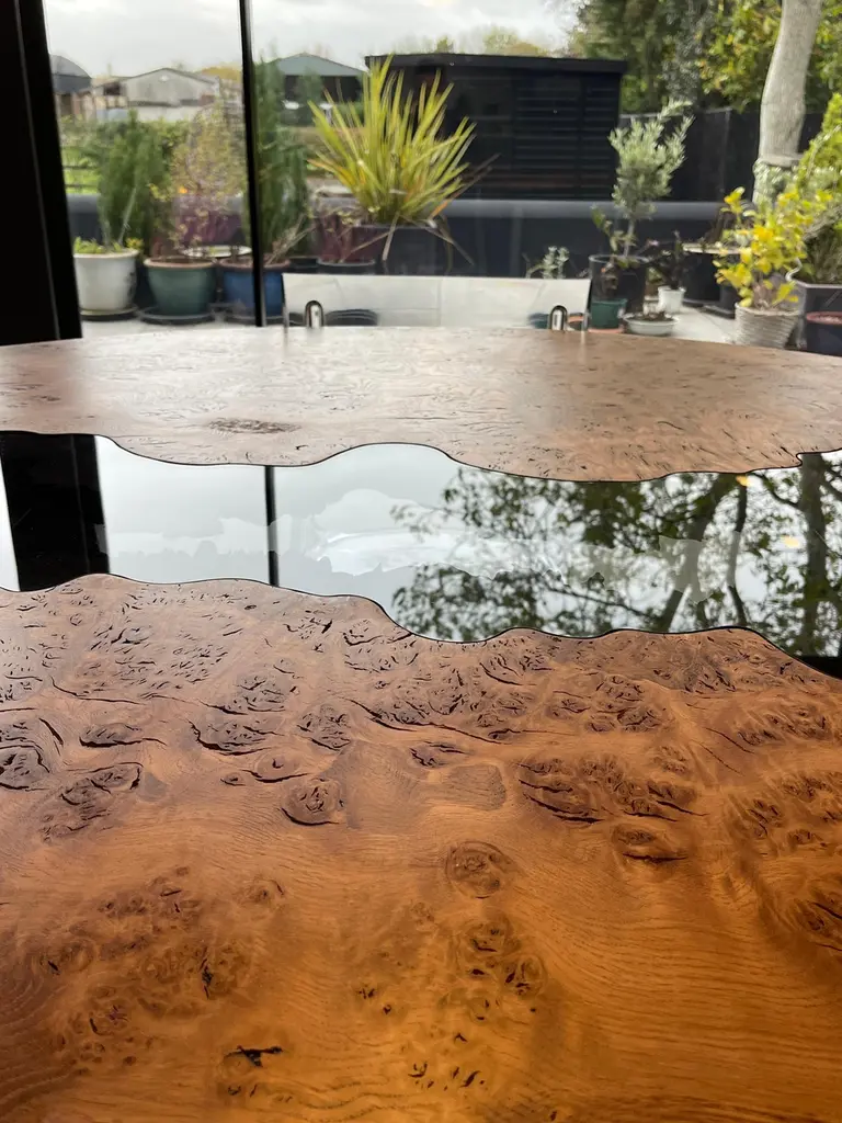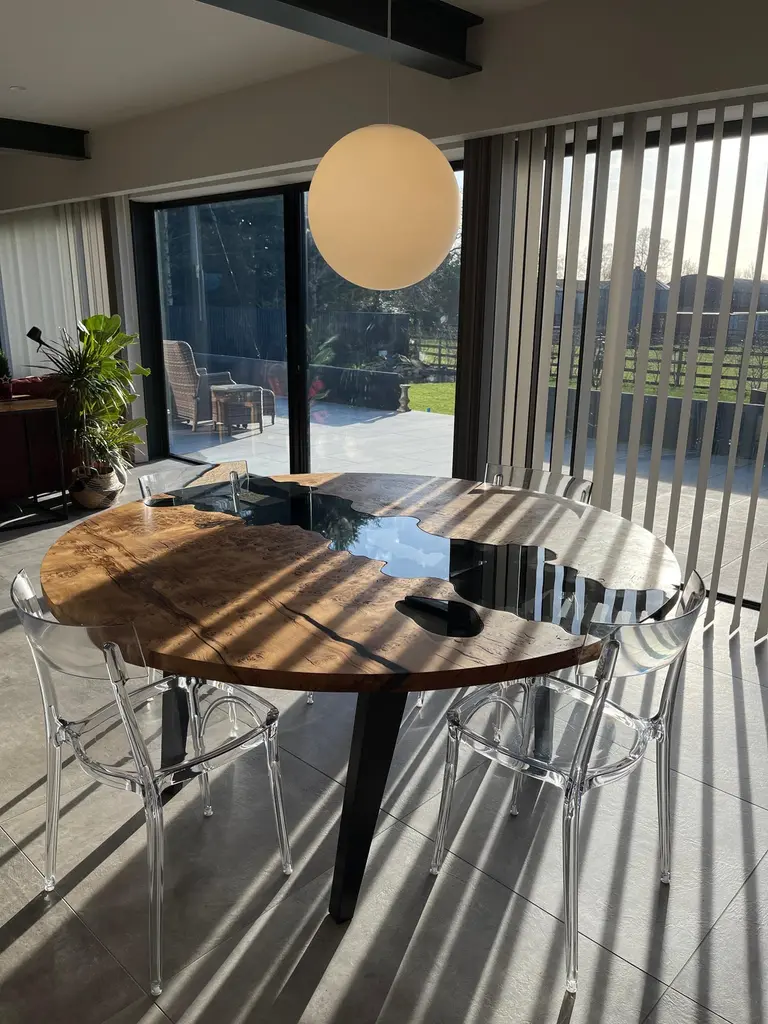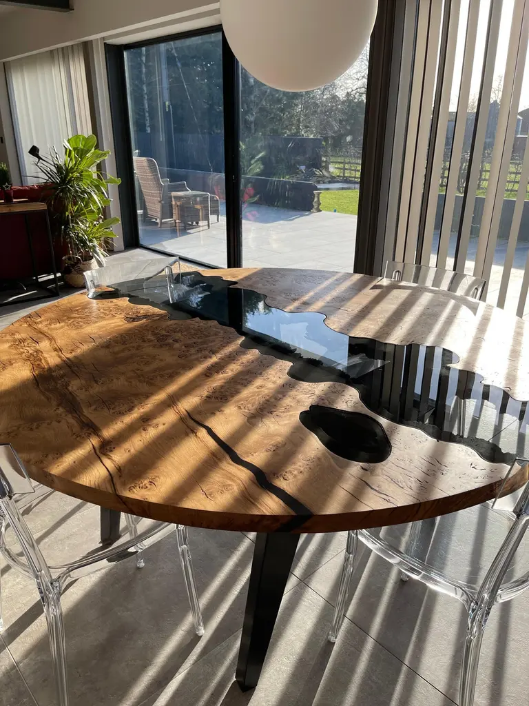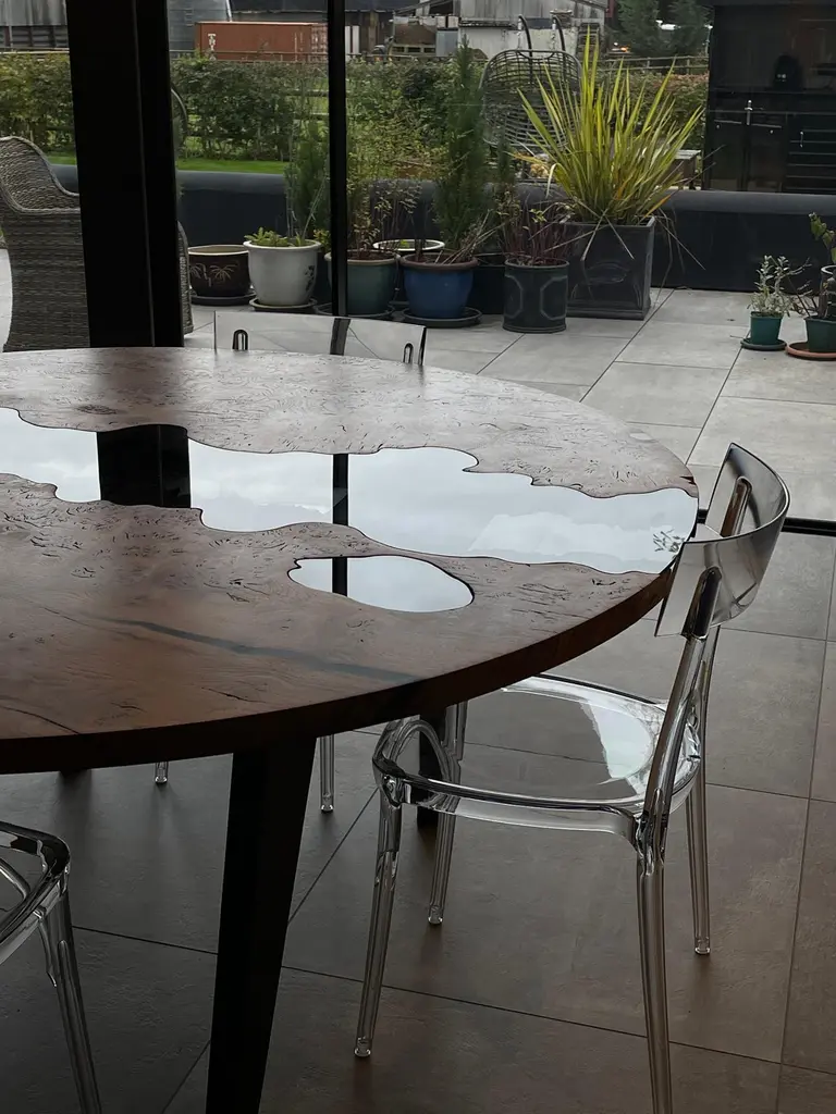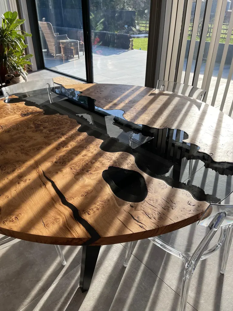 Circular dining table made from a rare sub species of oak; English pippy oak.The oak is cut into two semi-circles with a void left down the middle - the void is templated down to every single curve and movement of the natural waney edge of the particular piece of wood used. After this, the custom glass is cut in a choice of black, green, blue or clear, it is set into the rebated wood so that it sits level and completely flat to form part of the surface of the table.This listing is for pippy oak and custom glass in the same style, with the same black steel powder coated legs, although you can choose similar designs for the same price.Enquire for different dimensions, wood types and designs.Every item is made-to-order so is quality checked profusely prior to crating and shipping, therefore returns are only accepted under the circumstances something has gone seriously wrong and the material used by ourselves has somehow failed. Out of the sale price, we pay for professional crating and this has been successful every single time.