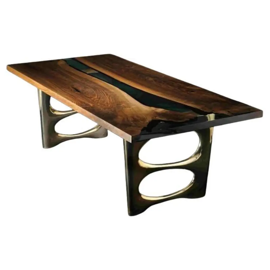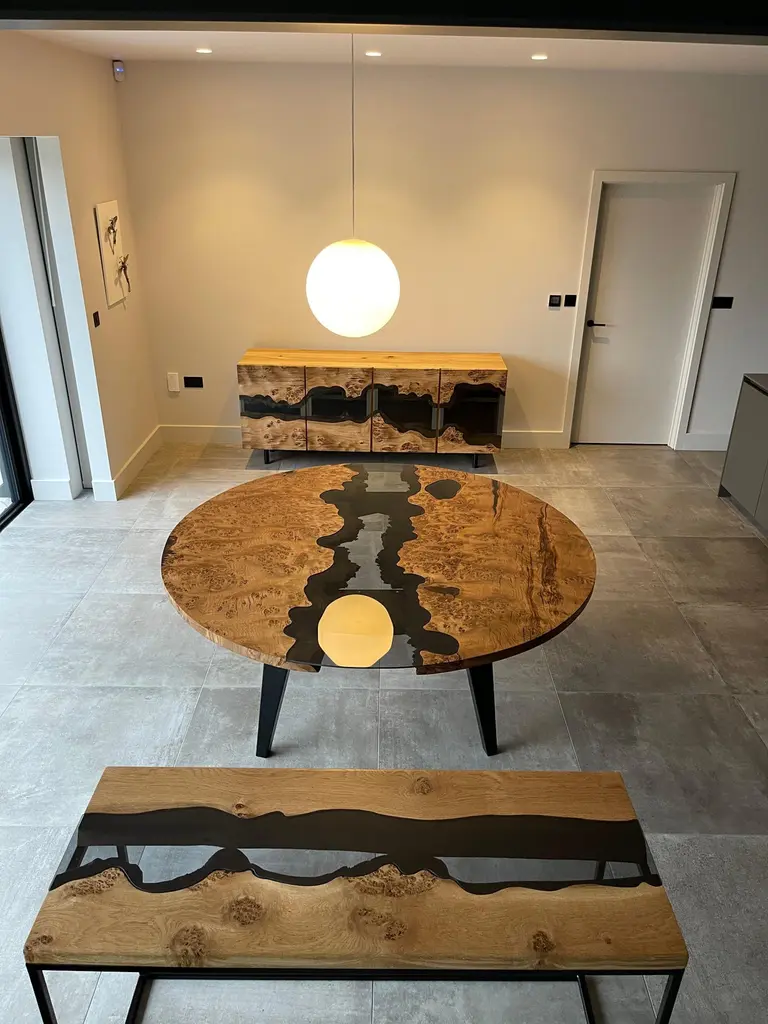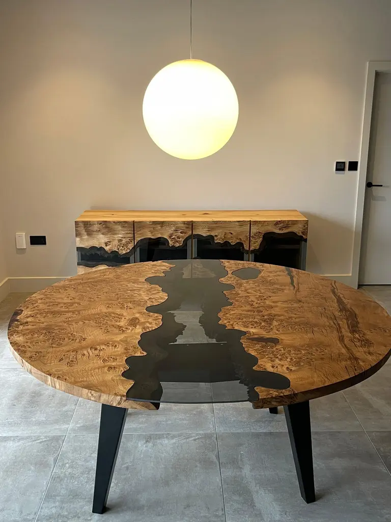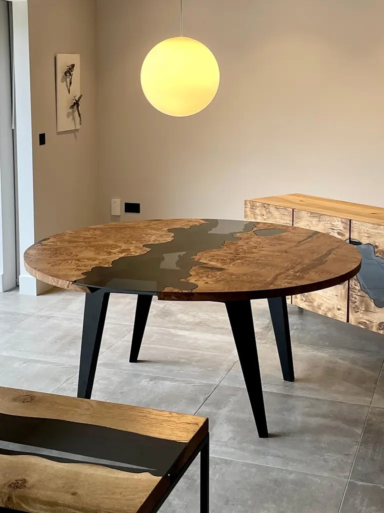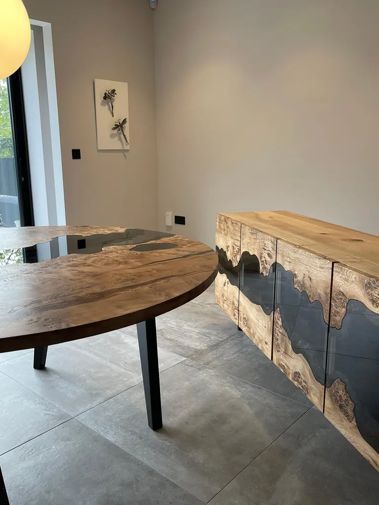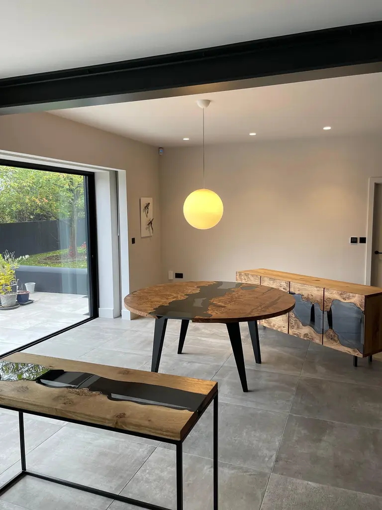 Circular dining table made from a rare sub species of oak; English pippy oak.The oak is cut into two semi-circles with a void left down the middle - the void is templated down to every single curve and movement of the natural waney edge of the particular piece of wood used. After this, the custom glass is cut in a choice of black, green, blue or clear, it is set into the rebated wood so that it sits level and completely flat to form part of the surface of the table.This listing is for pippy oak and custom glass in the same style, with the same black steel powder coated legs, although you can choose similar designs for the same price.Enquire for different dimensions, wood types and designs.Every item is made-to-order so is quality checked profusely prior to crating and shipping, therefore returns are only accepted under the circumstances something has gone seriously wrong and the material used by ourselves has somehow failed. Out of the sale price, we pay for professional crating and this has been successful every single time.