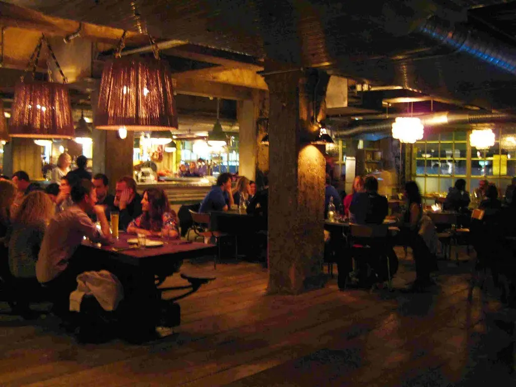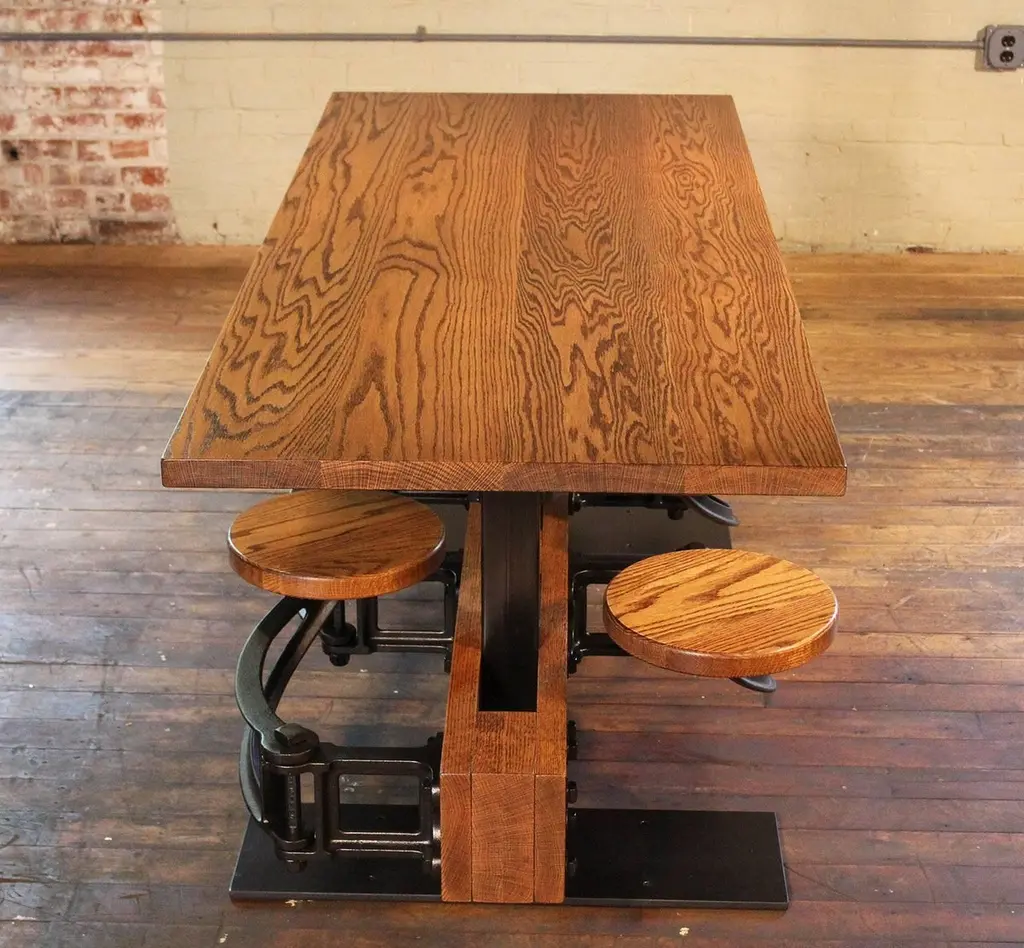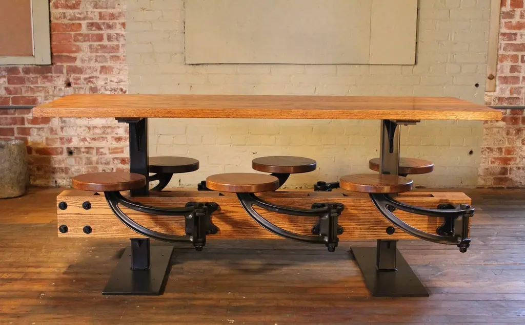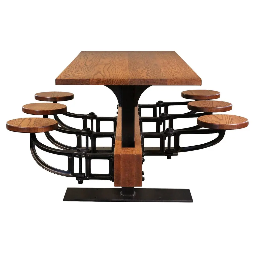 Industrial dining table in red oak with built in attached cast iron swing out seats. A great space saving option for use in the kitchen as a dinner or breakfast table, or in a cafe or restaurant. Tables can be linked together or built up to 24' in length. Seats are sold separately for use at bars and counters. Can be made with different types of wood, or metal, glass top, with different seat configurations. Seats are cast from ductile iron and are stress tested to over 1000 pounds. Can bolt to the floor for maximum stability. Hand-built in our Connecticut workshop.