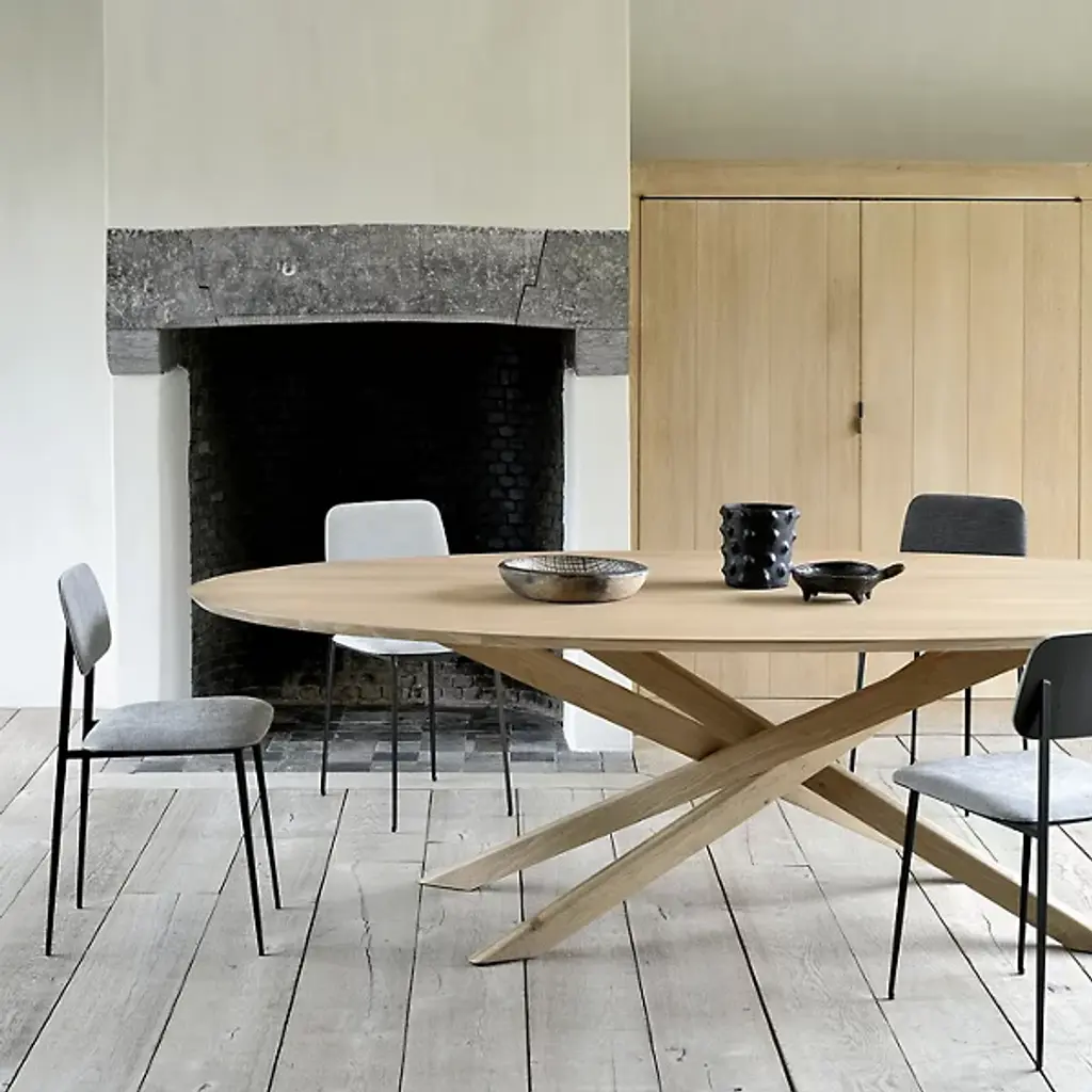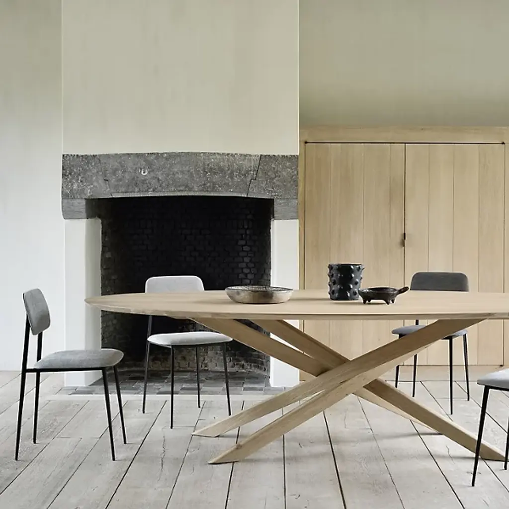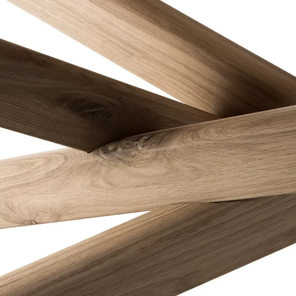 Make meals and gatherings a more intimate and unforgettable experience with the remarkable design of the Oak Mikado Oval Dining Table from Ethnicraft. An enduring creation of solid oak wood by Alain van Havre made in Serbia, the sculptural lines of its interlocking wood legs create an intriguing visual puzzle. An oval top provides for closer encounters than a disc shape, naturally drawing people closer to face each other and interact more easily.