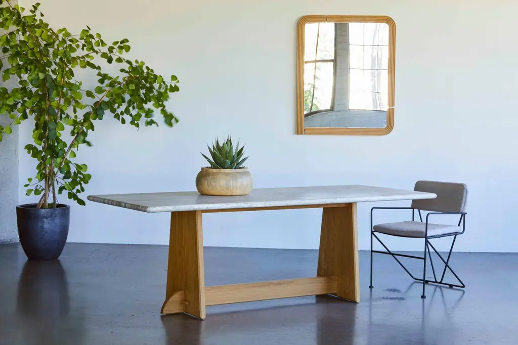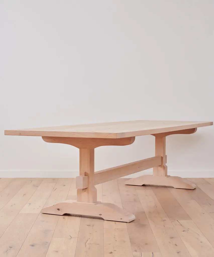 The Ojai dining table features a trestle base made of solid wood and the option of a stone or solid wood top. The Lawson-Fenning Collection is designed and handmade in Los Angeles, California. Reach out to discover what options are currently in stock.