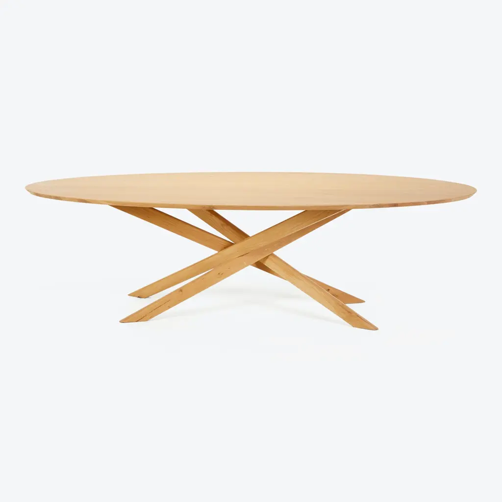 Crafted in solid oak, this dining table is an artful study of balance and symmetry. Its sculptural lines make this table a stunning centerpiece to ground your dining room.