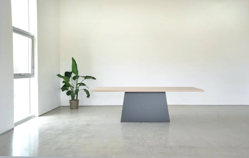 Oak small Brackton dining table by Hollis & MorrisDimensions: 84" x 36" x H 29.5"Materials: Solid wood. Cold rolled steel. Hardwax oil, powder-coated metal.Also available in natural oak, black oak, and walnut. And, white or black powder-coated finish.Designer Mischa Couvrette’s urban abstraction of a mountain offers a design object both Minimalist and powerful, the dramatic union of solid wood and metal. Brockton’s substantial base rises from the ground like a monolith, offering a dialogue with the angular silhouettes of the Toronto collection.Based out of Toronto, Hollis & Morris takes its name from an intersection in Halifax where the company started as a series of garage explorations in design. A steadfast commitment to function with a distinctive approach to design. Hollis & Morris creates handmade furniture and lighting which carefully balances modern and honest designs. Versatile, well crafted, and timeless. Pieces by Hollis & Morris easily complement residential, commercial, and hospitality spaces. Driven by respect towards natural and honest processes, trademark integrations of solid wood and metal celebrate the inherent strengths of each material, resulting in thoughtful, quality pieces made to last with you throughout the years.