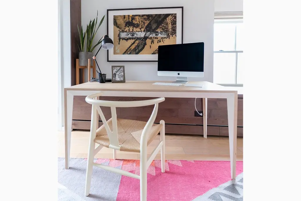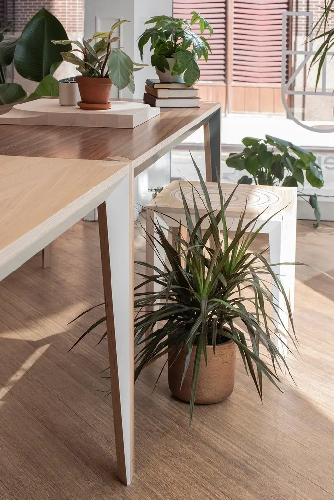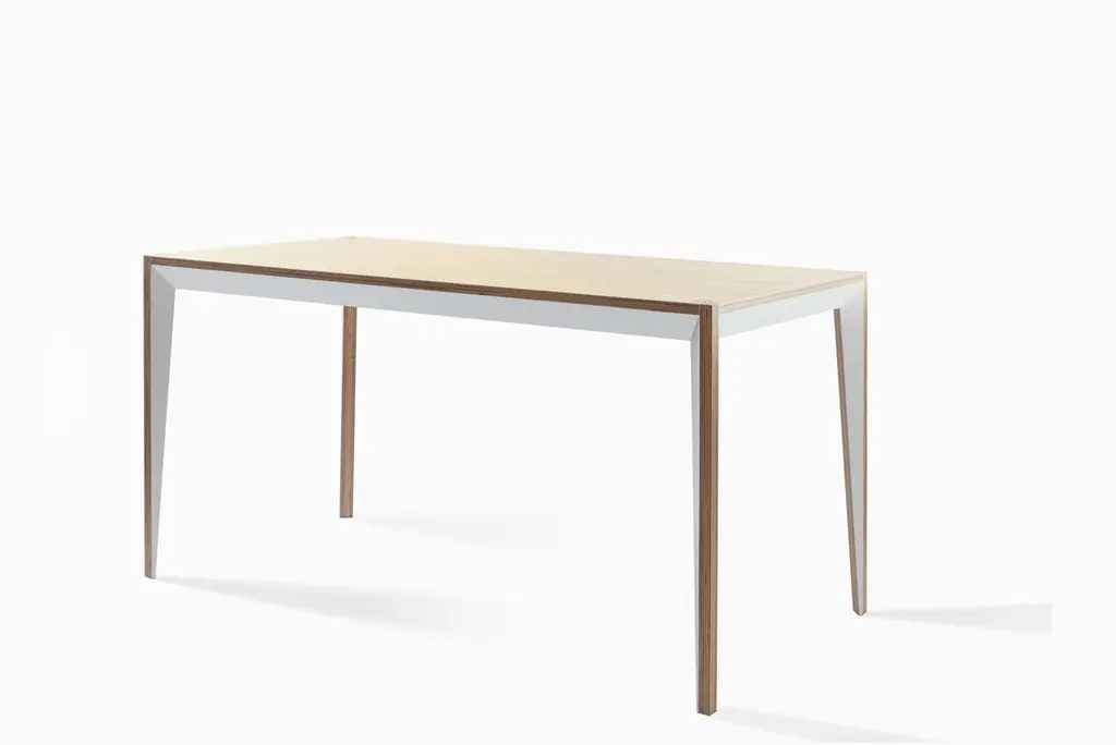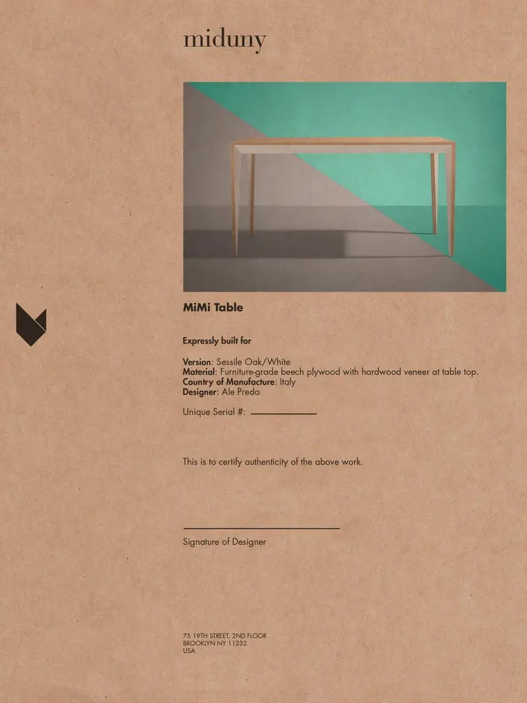 Merging clean lines with warm materials, the faceted geometry of the MiMi table creates a slender, elegant profile punctuated with painted surfaces that capture light. This modern and graceful design returns contemporary Italian craft to the office desk or compact dining table for urban living.NYCxDesign 2018 Honoree. German Design Award 2019 Nominee.Push two tables side-by-side and watch neighboring legs visibly become one. For office spaces, we encourage our clients to experiment with the system modularity to create multiple desk configurations and support their workplace productivity in sharp, Milanese style. Designed in Brooklyn by Italian-born architect Ale Preda for Miduny, this artisanal product is made in Italy by master craftsmen. The MiMi table oak white model features a solid 13-ply furniture-grade beech plywood structure, a Sessile-Oak veneer top, a white painted finish at the facets (RAL 9003) and is coated with a commercial grade natural feeling matte finish. Each MiMi table is hand-stamped with unique serial number (on the underside) and comes with a signed certificate of authenticity. As all our products, this item is efficiently packed for flat shipping inside a custom box and minimal assembly is required. Our custom joinery system allows legs to be pressure fitted in the notched top and secured with two bolts. Assembly takes few minutes.