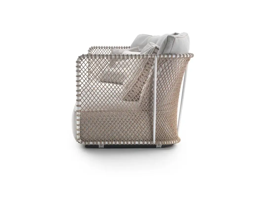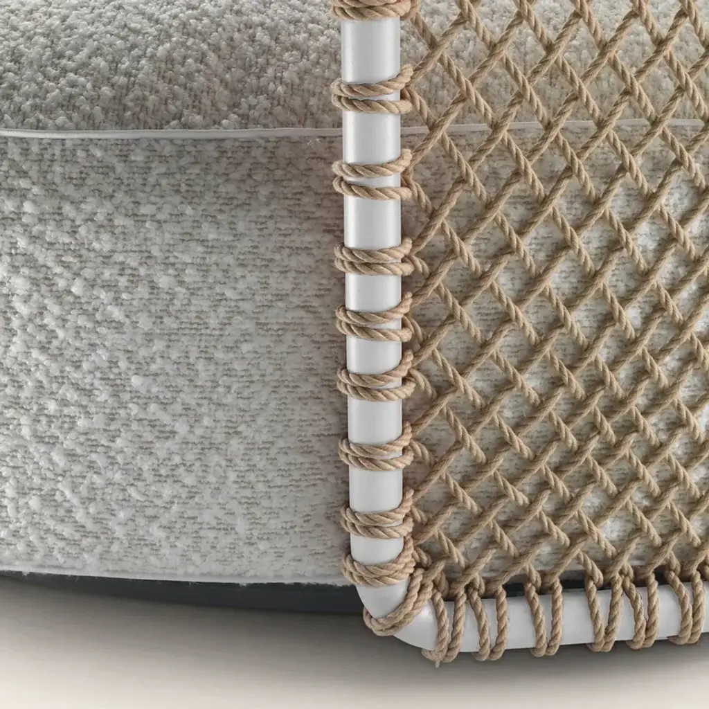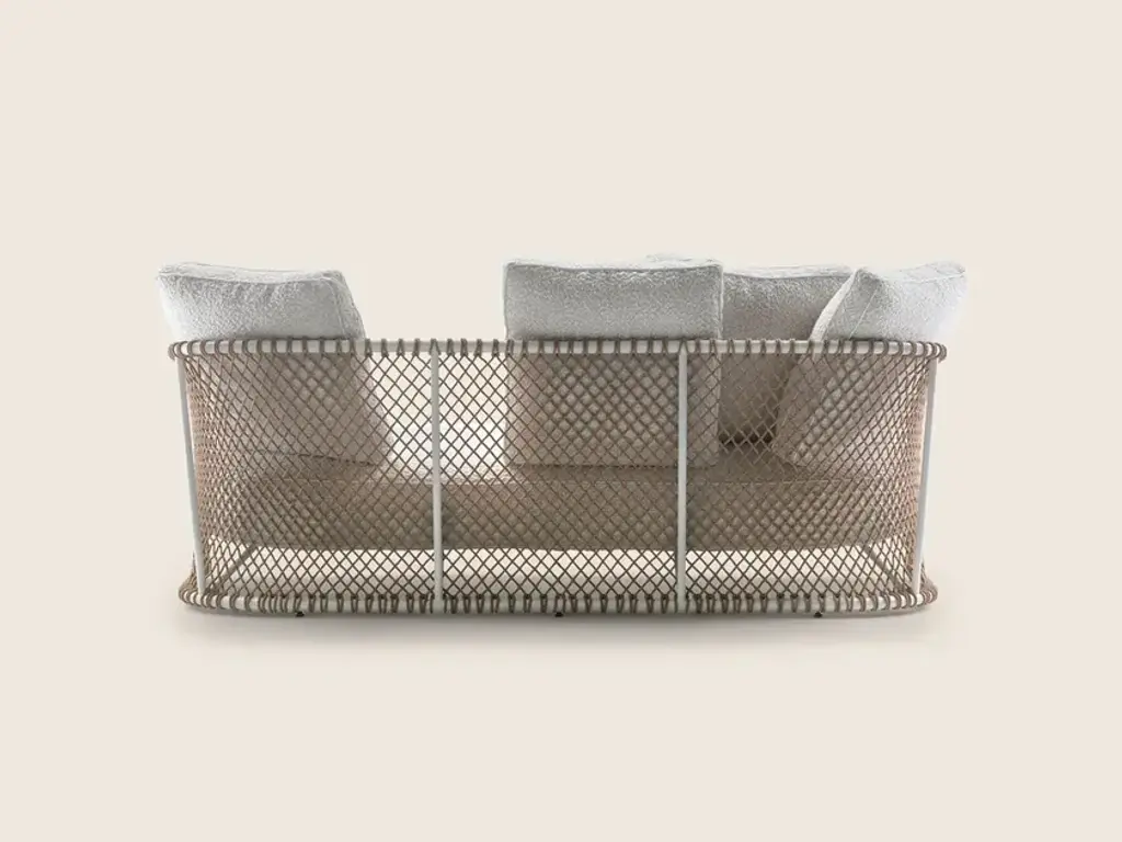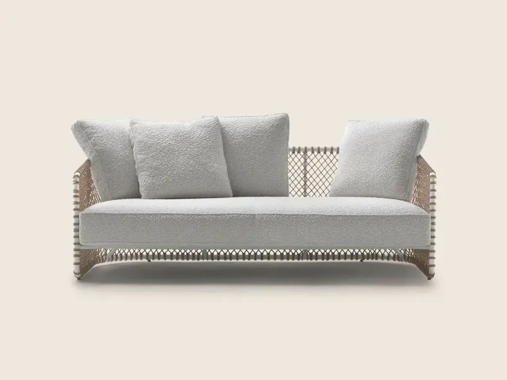 OASIS is a 4-seat linear sofa.FeaturesStructure: made of stainless steel tubing, oven-painted with epoxy powders in the following colors: white 100, wine red 405, khaki green 705, burnished, glossy gray 715, matte titanium 710, or in textured finishes: white 300, sand 310, brick 320, sage green 330, terracotta 325, forest green 335, charcoal 350.Seat panel made of compact laminated support.Weaving in polypropylene cord in the colors: sand 8001, anthracite 8005, bordeaux 8002, green 8006, white 8007, brown 8004; or in matte polypropylene cord in the colors: natural 8102, ice 8103, anthracite 8105, straw 8101.Floor support on adjustable thermoplastic material feet.Seat cushion: made of polyurethane foam and polyester fiber, covered in a hydrophobic protective fabric.Back cushion: made of polyester fiber with a hydrophobic cover.Additional cushions: made of polyester fiber with a hydrophobic cover, available upon request with an additional charge.Cover profile: the upholstery features a gros grain profile, available in all colors from the sample chart.Upholstery: removable fabric.Cover: made of waterproof material, available upon request with an additional charge.Oasis is a collection defined by its distinctive aesthetic, present both in the seating system and the eponymous family of tables.The unique feature is the base, made of powder-coated tubular metal with a handwoven polypropylene or rubber cord.The subtle net-like pattern of the weaving, the graceful metal structure, and the tempered glass top all contribute to the elegance and lightness of the design.The Oasis family includes both dining tables and side tables, available in various shapes, sizes, and finishes, designed to furnish outdoor spaces with meticulous attention to every detail.