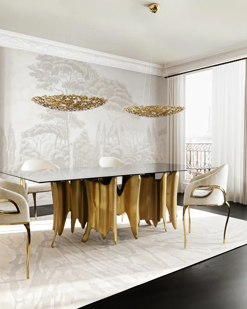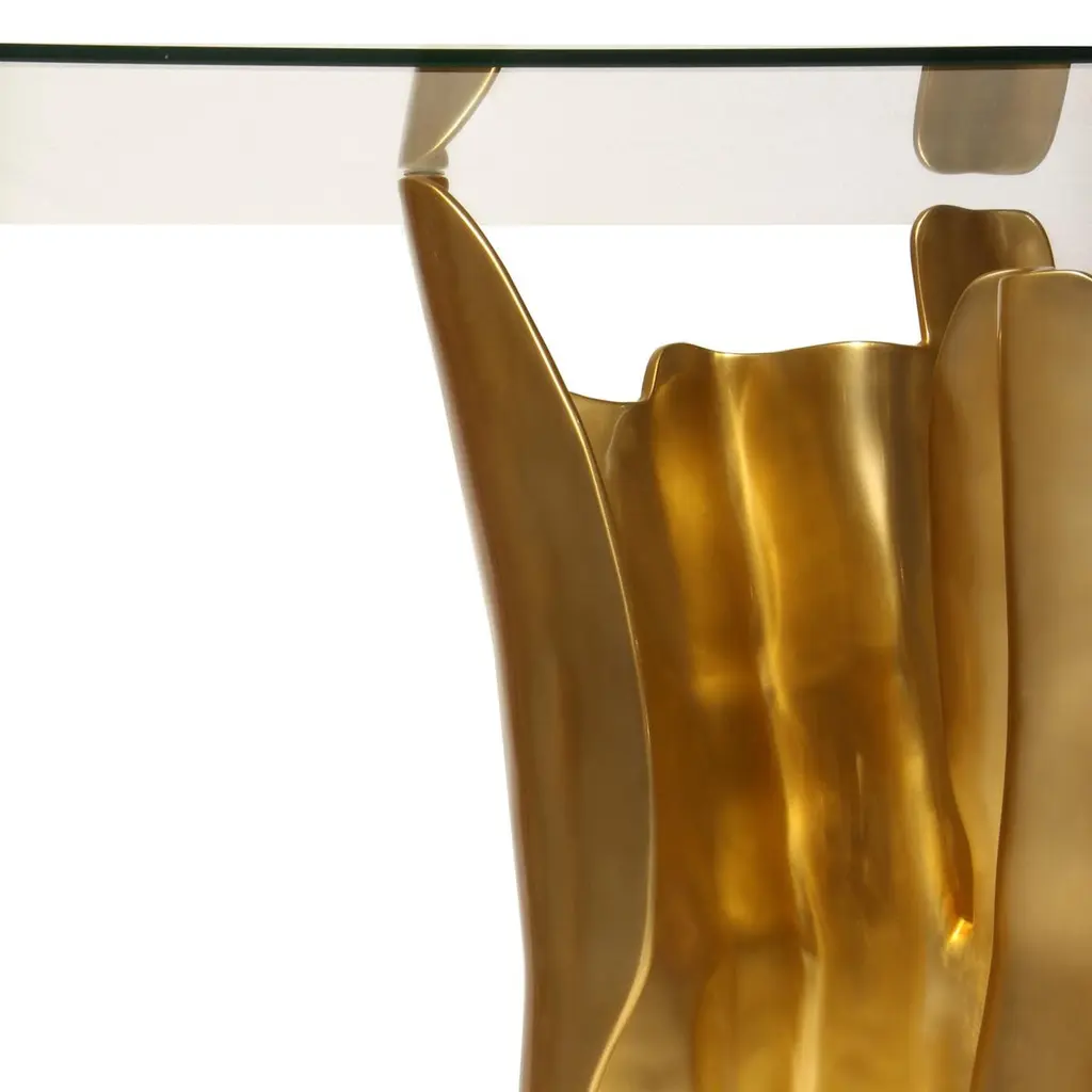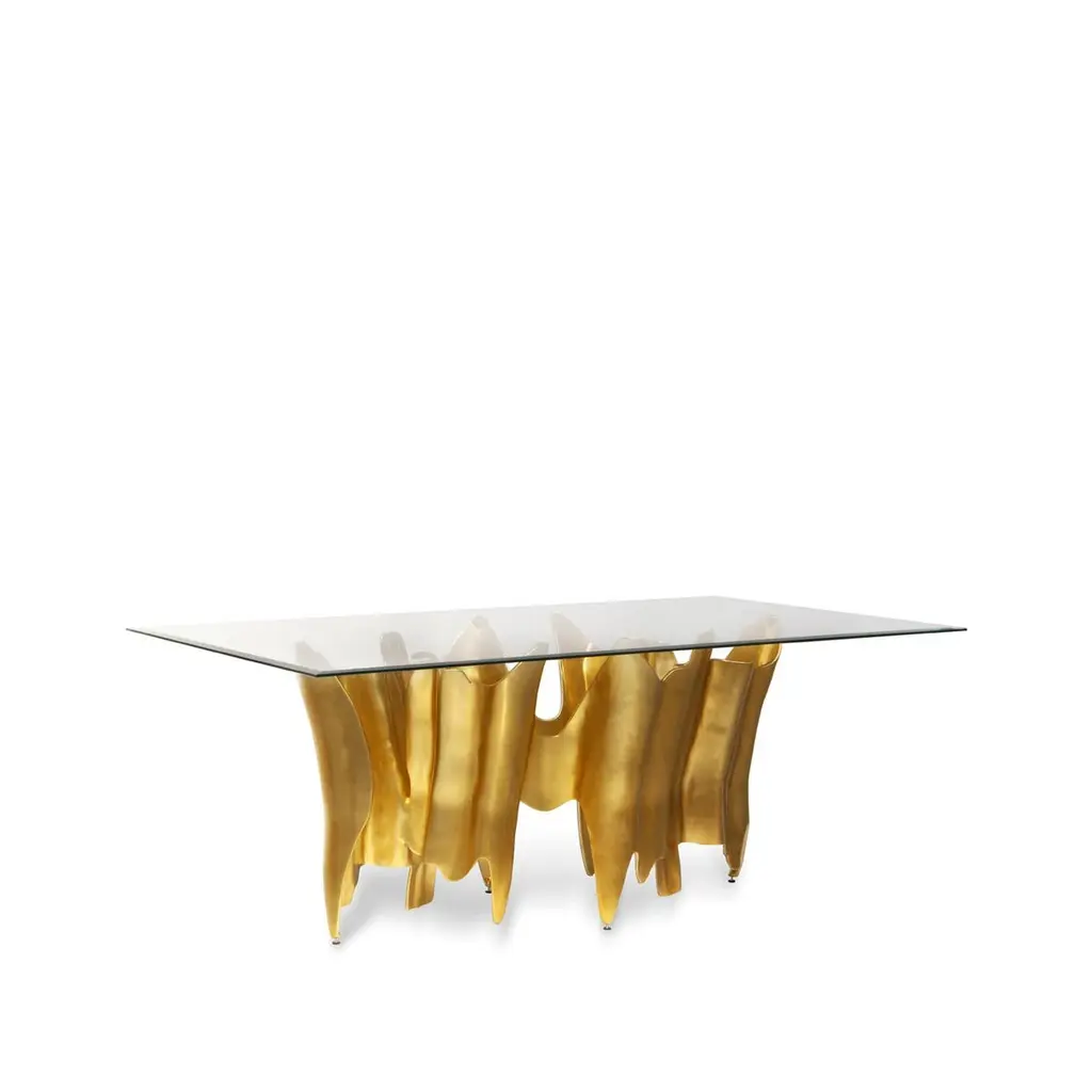 Initially it is a dining table. Then it becomes a dining table cut from clear glass. Your eyes begin to wander down, drinking in the rhythmic design of the aluminum base, following every crevice leading down only to head back up; compelling you to continue staring. Soon enough, the simplicity of the dining table disappears, leaving only an intoxicating illusion of art coming to life.