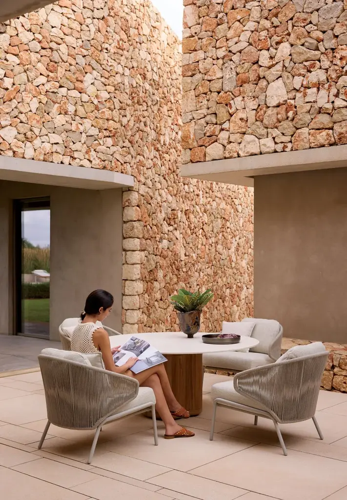The Ogado Round Dining Table Ø125 by Manutti blends natural elegance with timeless design. Designed by Brent De Meulenaere, it features a sculpted teak base and a round ceramic tabletop (Ø125 cm) for up to four guests. Weather-resistant with optional wheels and a protective cover.Inspired by the fusion of nature’s elegance and timeless design, the Ogado Collection invites you to enjoy the beauty of organic shapes and inviting textures. Crafted with high-end precision and careful attention to detail, each piece reflects the graceful lines found in nature, from the flowing tabletops in ceramic or teak to the unique, sculpted wooden bases inspired by natural forms. Find tranquility and balance in the blend of teak wood and ceramic, creating a calm, soothing atmosphere in any outdoor space.