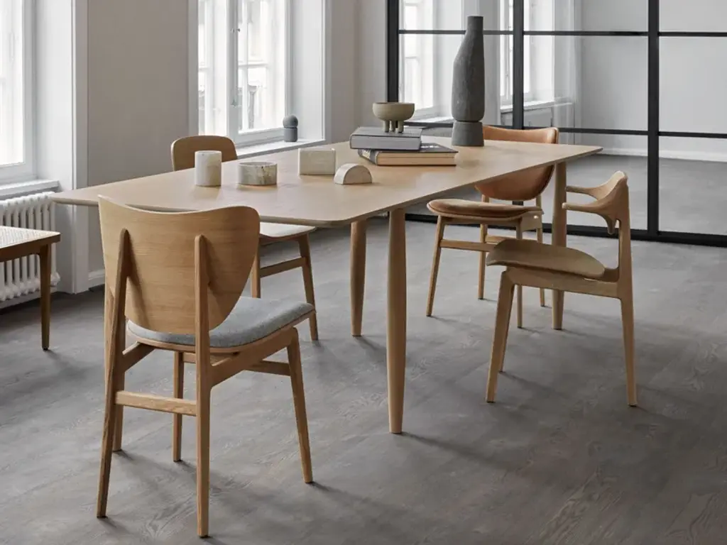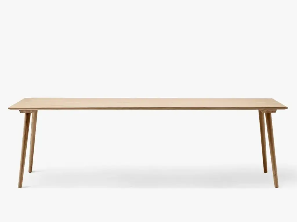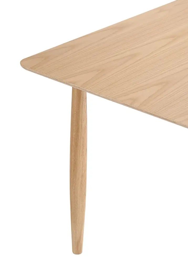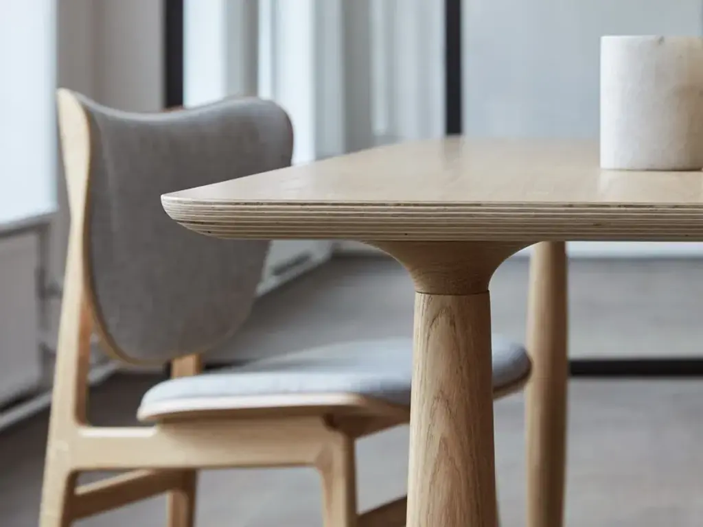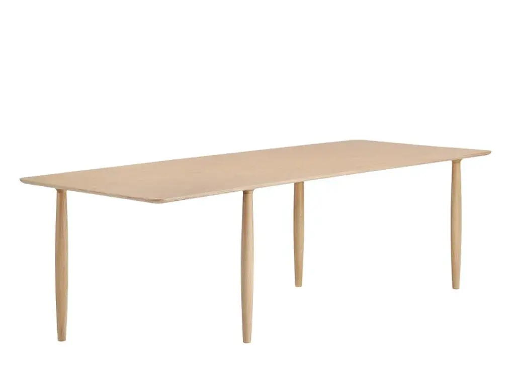 Oku is a rectangular oak dining table.Oku is an interpretation of the Japanese word for oak ‘Ōku’. Oku refers to the essence of the design - oak. Through experiments with the balance between lightness and heaviness, making it paper thin when seen from one angle and solid from others, the design emphasizes the natural material. The Oku table top is produced in oak veneer with round edges, adding a refined detail to the large surface. The legs of turned oak timber sections are positioned sporadically to create the illusion of a floating table top, while also adding a sculptural detail to the table. Oku comes in both rectangular and circular shapes, with several size options making it suitable for private homes as well as office settings. Table legs: Solid oakTabletop: Plywood & oak veneerAvailable finieshes: Natural, Dark Stained, Black, Smoked