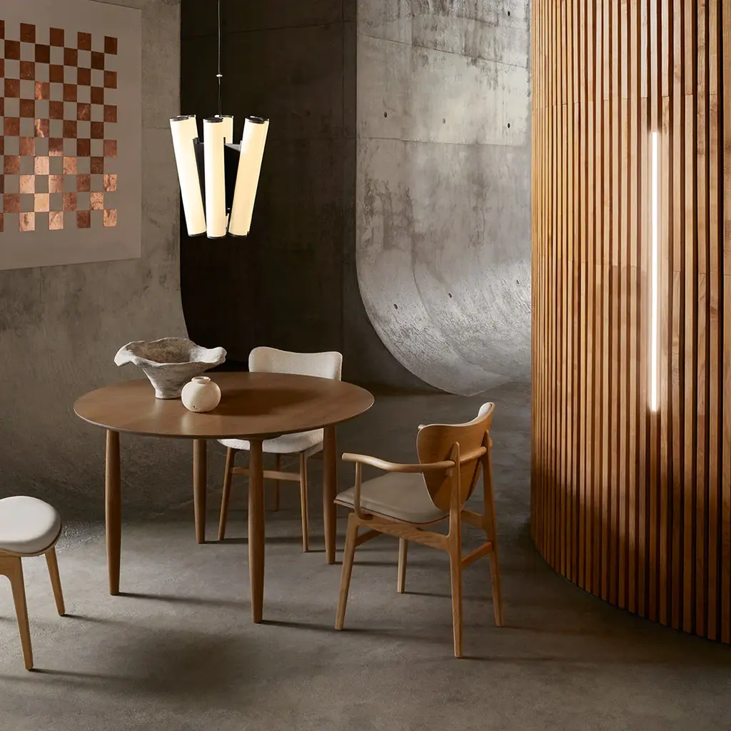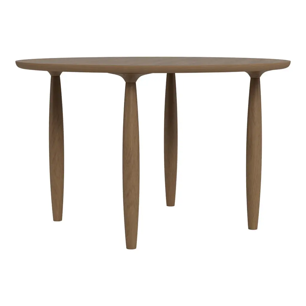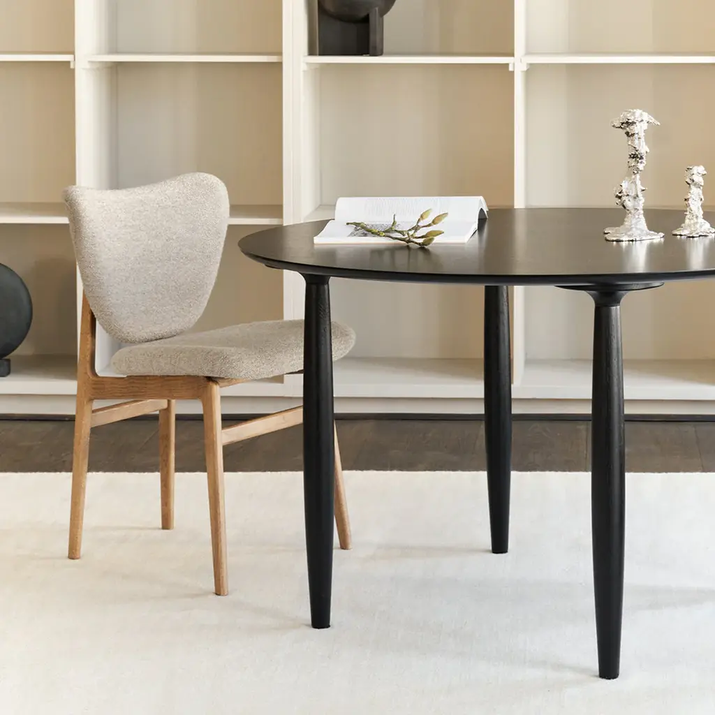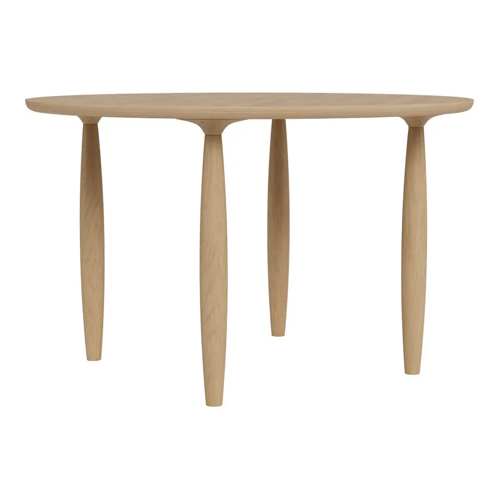 Oku is an interpretation of the Japanese word for oak ‘Ōku'. Oku refers to the essence of the design - oak. "Through experiments with the balance between lightness and heaviness, making it paper-thin when seen from one angle and solid from others, we've emphasised the material in a simple design." The Oku table top is produced in oak veneer with round edges, adding a refined detail to the large surface. The legs of turned oak timber sections are positioned sporadically to create the illusion of a floating tabletop while adding sculptural detail to the table. Oku comes in both rectangular and circular shapes. Available in several sizes, which makes it a well fit for every room.