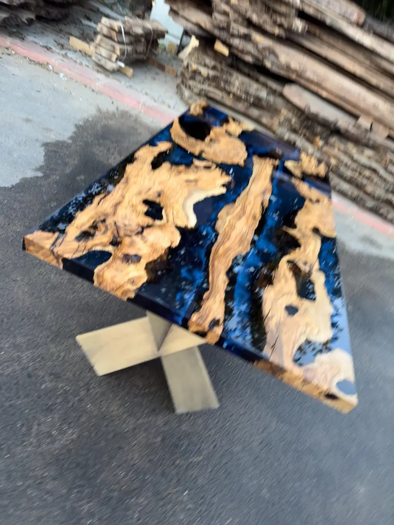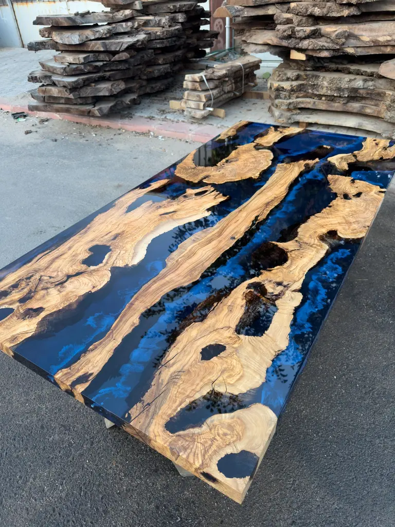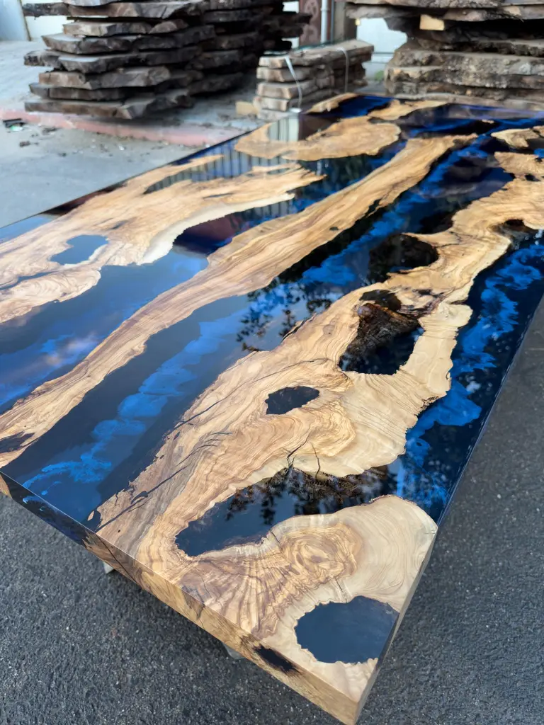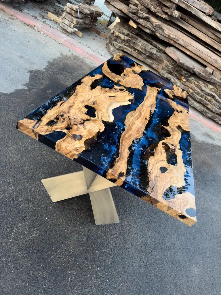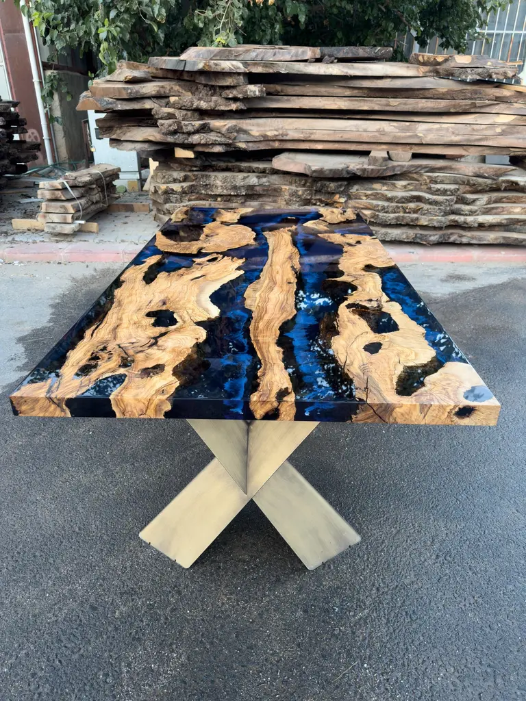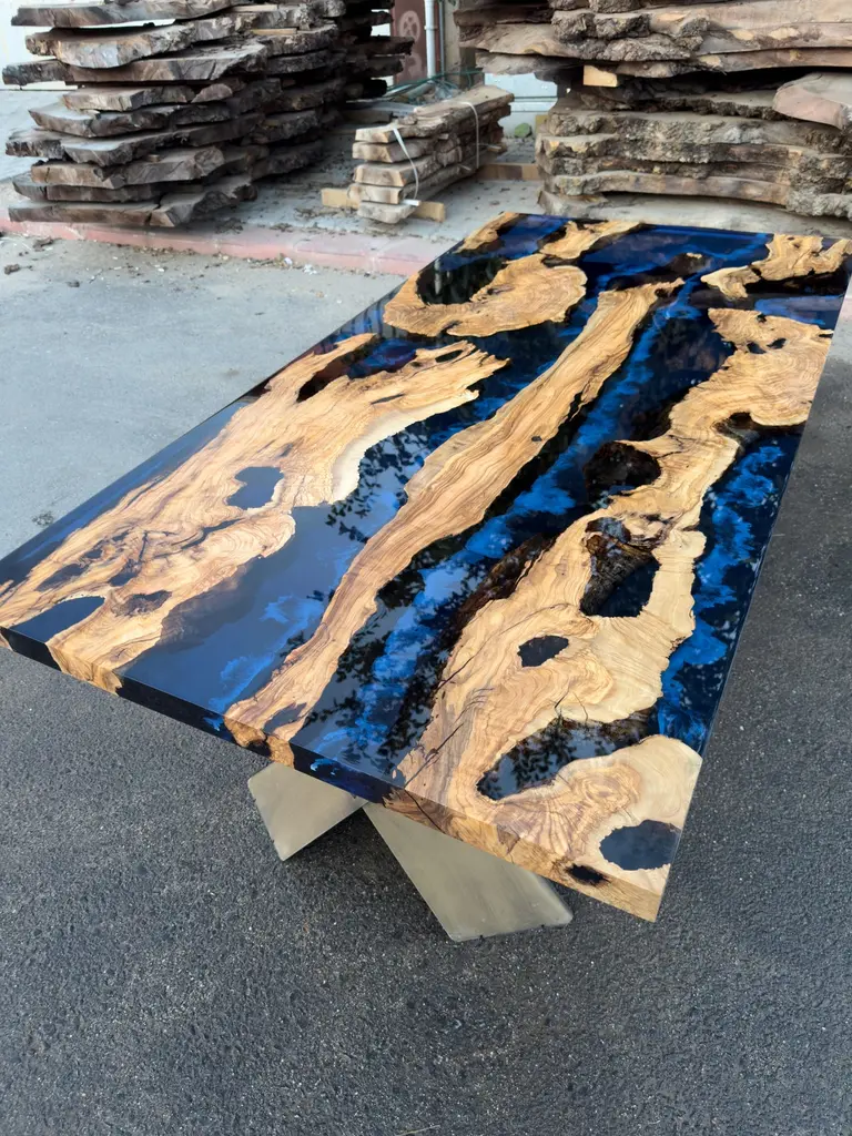 Custom Olive Epoxy Resin Dining Table - Live Edge Wood TableThis stunning table is made of Mediterranean Olive wood. The unique beauty of the natural curves of olive wood combined with blue epoxy is seen in this table.All woods have its own natural shape. Therefore, each one has its own natural textures. Custom sizes, colours and finishes are available for this product.