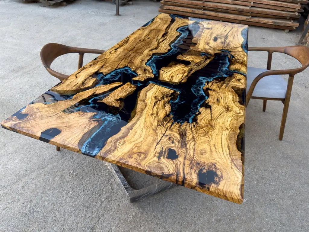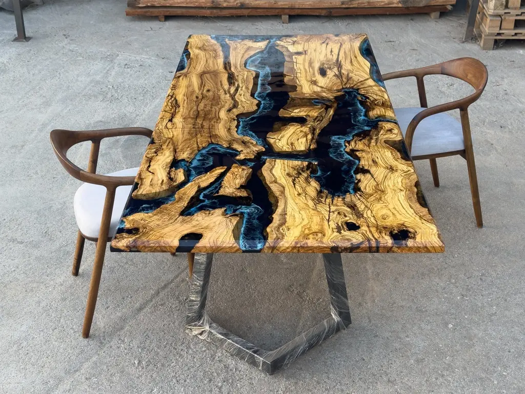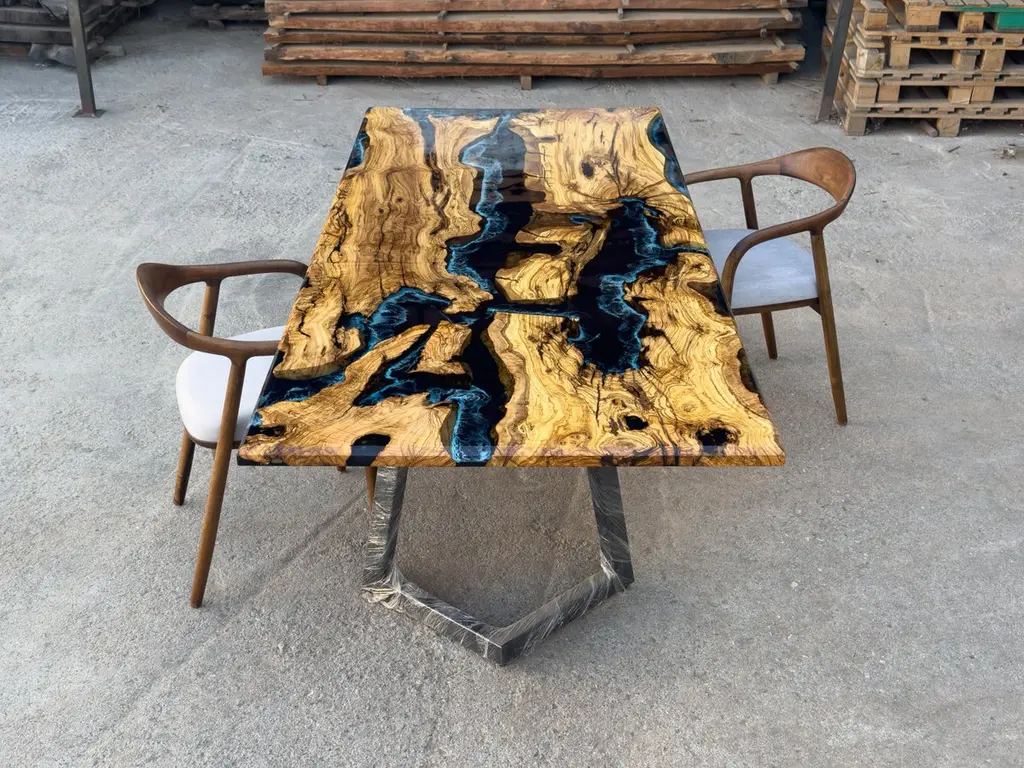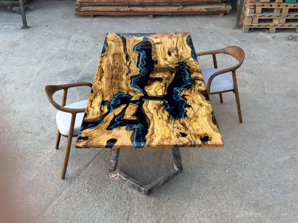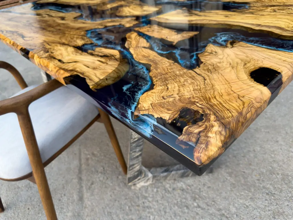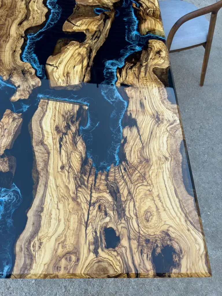 Olive Epoxy Resin Table - Custom Olive Epoxy TableThis stunning table is made of Mediterranean Olive wood. The unique beauty of the natural curves of olive wood combined with blue epoxy is seen in this table.All woods have its own natural shape. Therefore, each one has its own natural textures. Custom sizes, colours and finishes are available for this product.