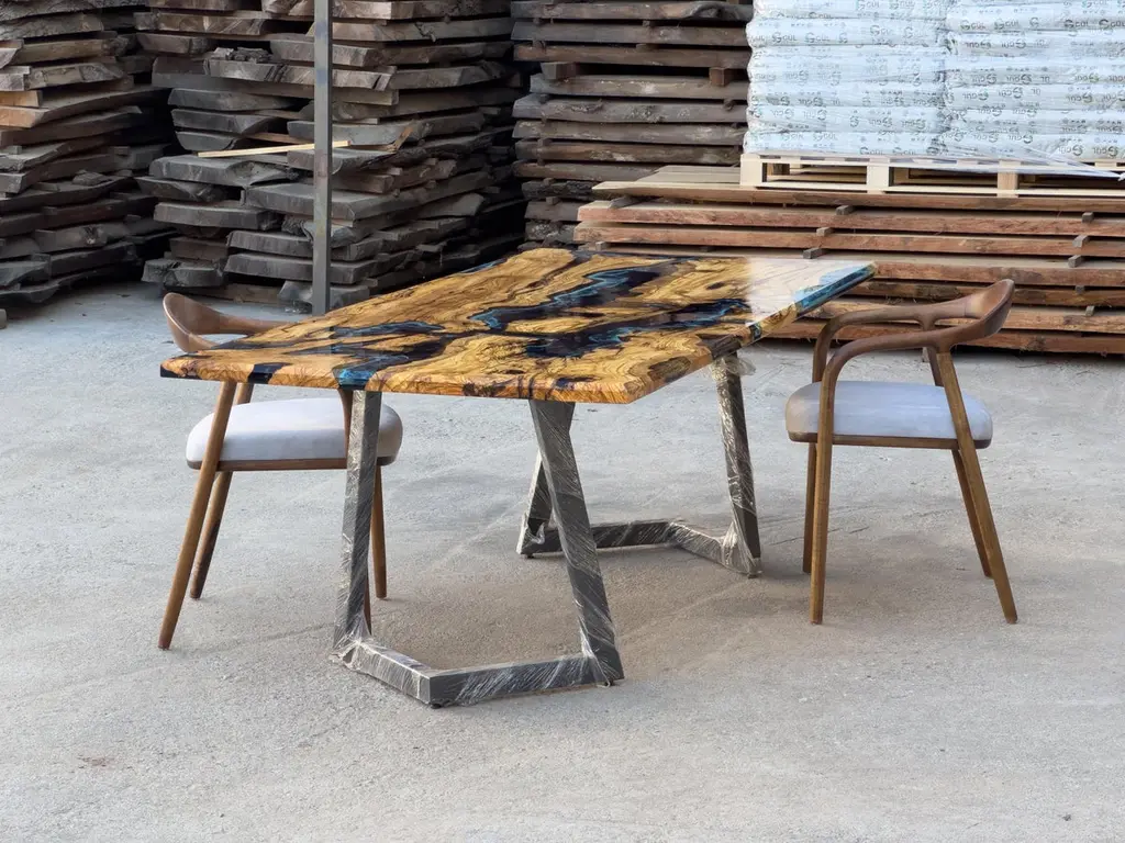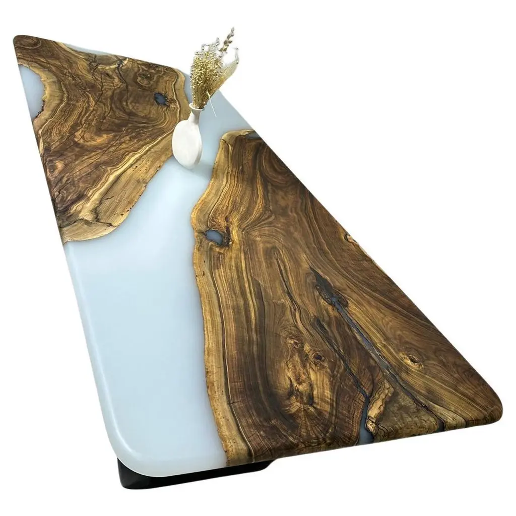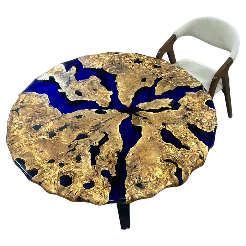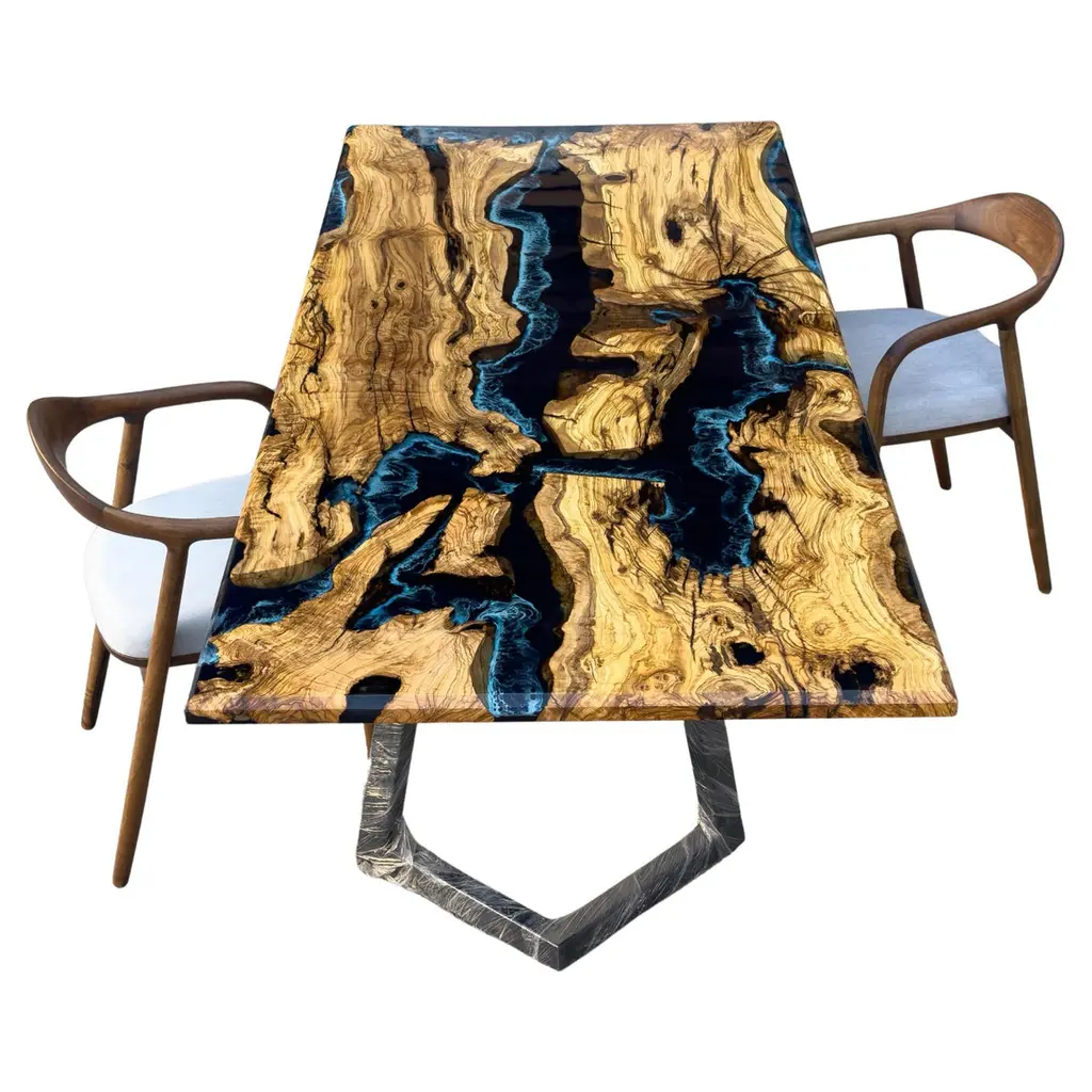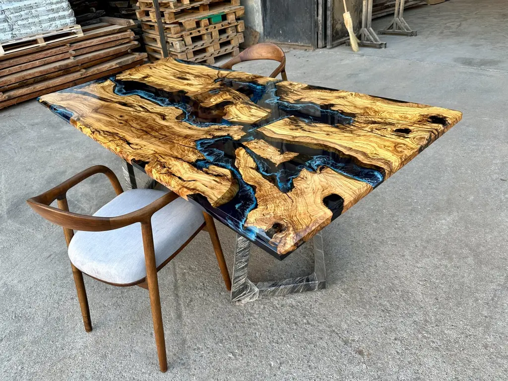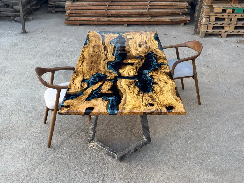 Olive Epoxy Resin Table - Custom Olive Epoxy TableThis stunning table is made of Mediterranean Olive wood. The unique beauty of the natural curves of olive wood combined with blue epoxy is seen in this table.All woods have its own natural shape. Therefore, each one has its own natural textures. Custom sizes, colours and finishes are available for this product.