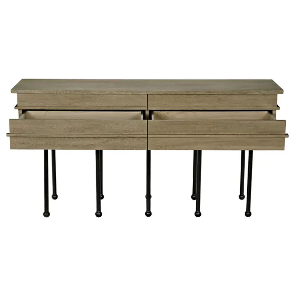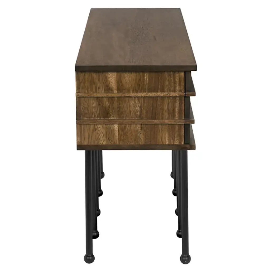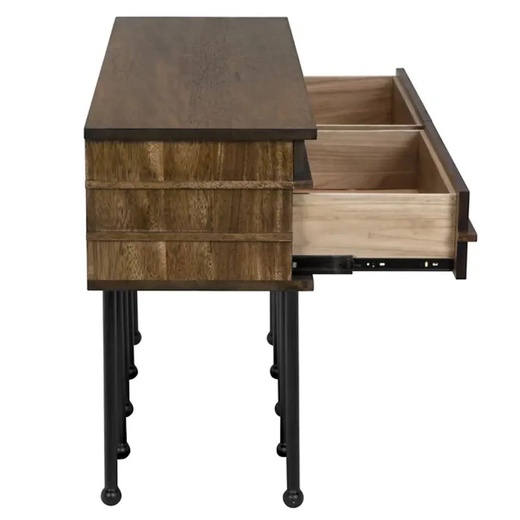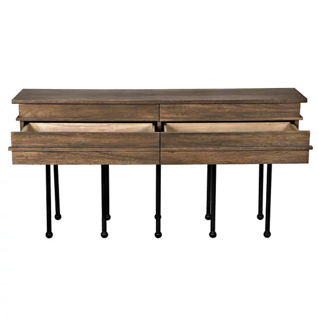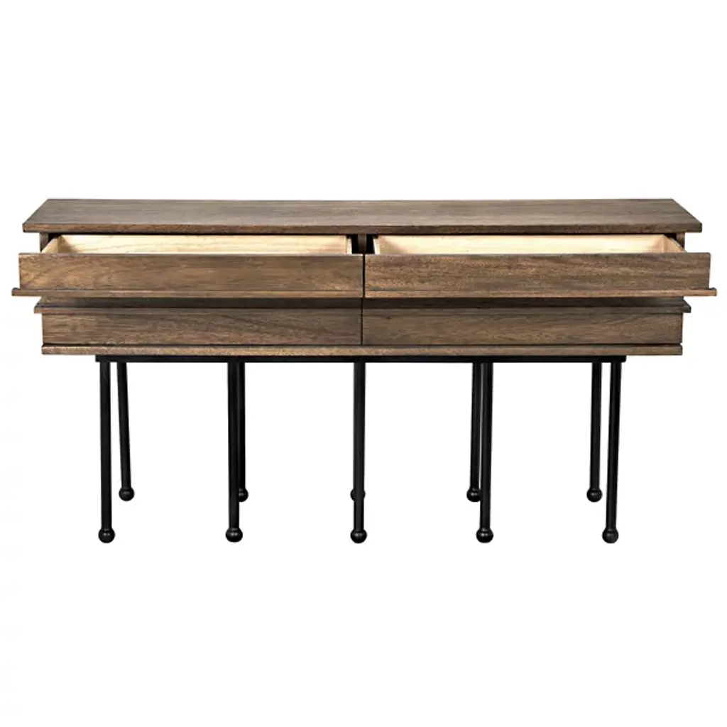 The Oliver Console Table from Noir combines walnut veneer surfaces with an industrial steel framework to create storage furniture that bridges traditional and contemporary design approaches. Multiple drawers provide organized storage for household items while keeping surfaces clear and uncluttered. The metal base structure elevates the wooden cabinet, creating visual lightness despite the table's generous proportions. Walnut veneer showcases beautiful grain patterns that vary naturally across the surface. This console works particularly well in entryways, behind sofas, or against dining room walls where you need both surface space and hidden storage for everyday items.
