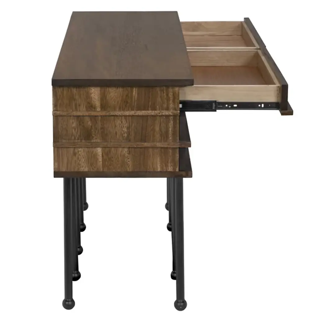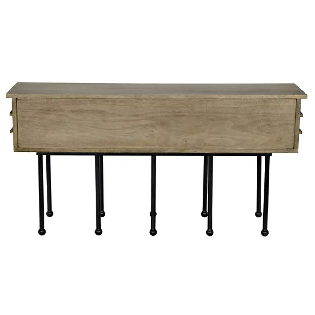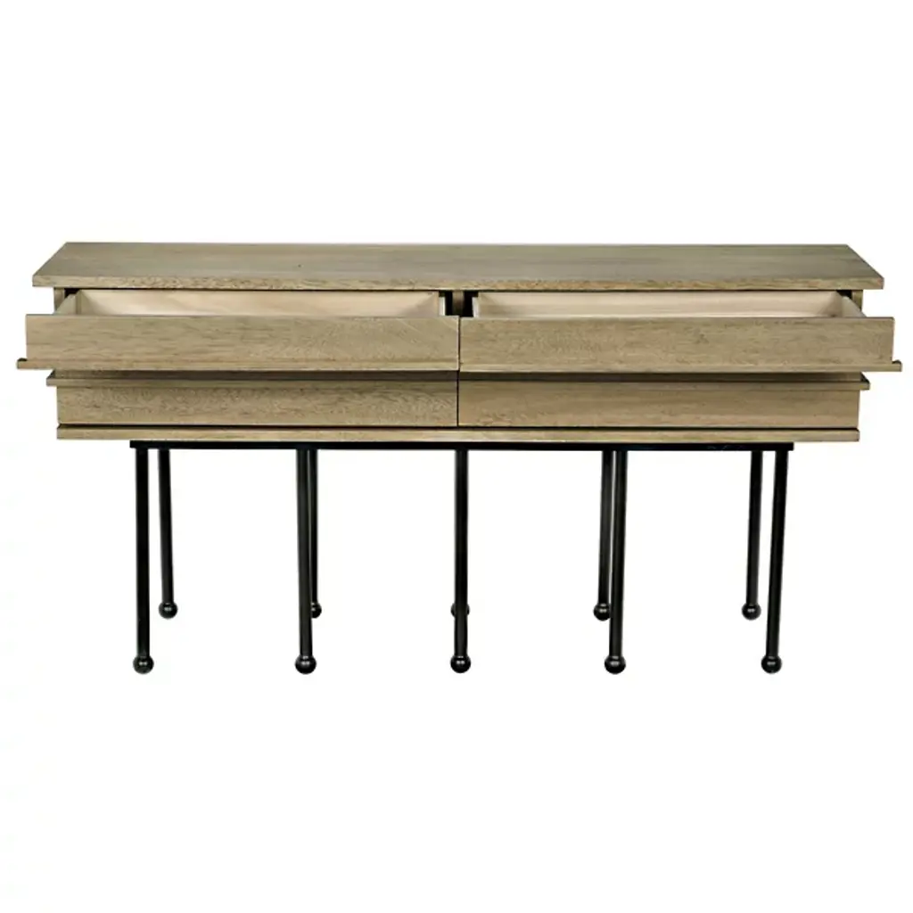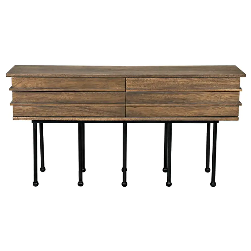 The Oliver Console Table from Noir combines walnut veneer surfaces with an industrial steel framework to create storage furniture that bridges traditional and contemporary design approaches. Multiple drawers provide organized storage for household items while keeping surfaces clear and uncluttered. The metal base structure elevates the wooden cabinet, creating visual lightness despite the table's generous proportions. Walnut veneer showcases beautiful grain patterns that vary naturally across the surface. This console works particularly well in entryways, behind sofas, or against dining room walls where you need both surface space and hidden storage for everyday items.