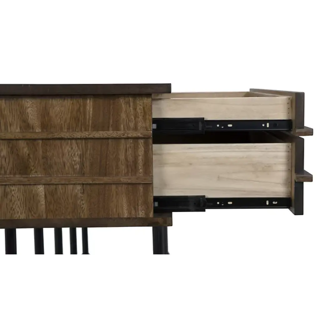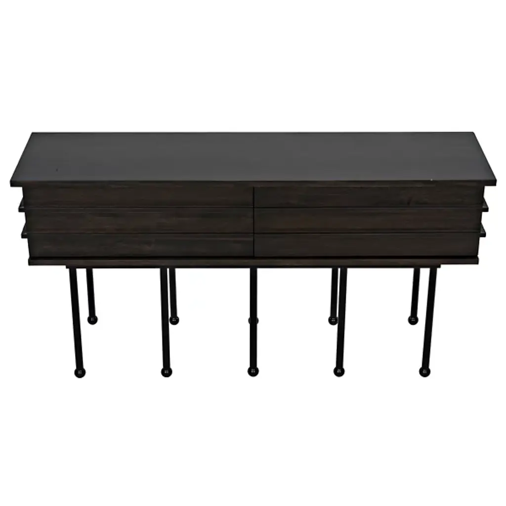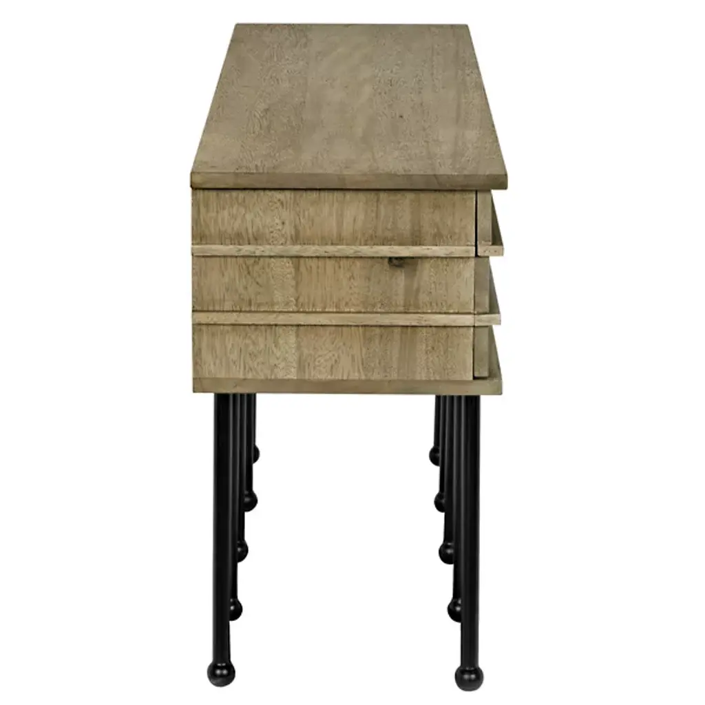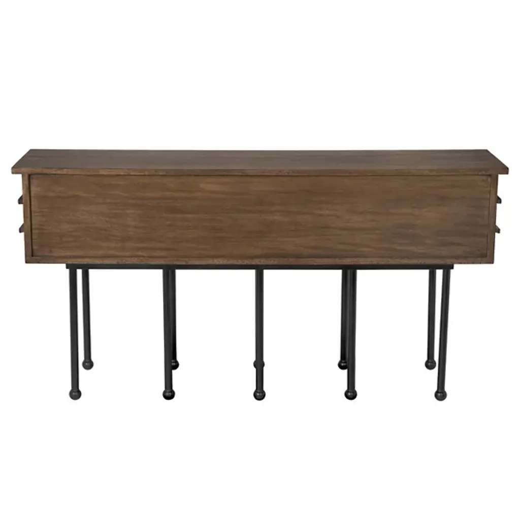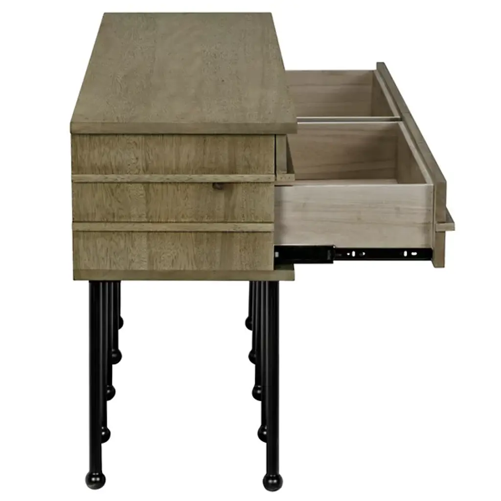The Oliver Console Table from Noir combines walnut veneer surfaces with an industrial steel framework to create storage furniture that bridges traditional and contemporary design approaches. Multiple drawers provide organized storage for household items while keeping surfaces clear and uncluttered. The metal base structure elevates the wooden cabinet, creating visual lightness despite the table's generous proportions. Walnut veneer showcases beautiful grain patterns that vary naturally across the surface. This console works particularly well in entryways, behind sofas, or against dining room walls where you need both surface space and hidden storage for everyday items.