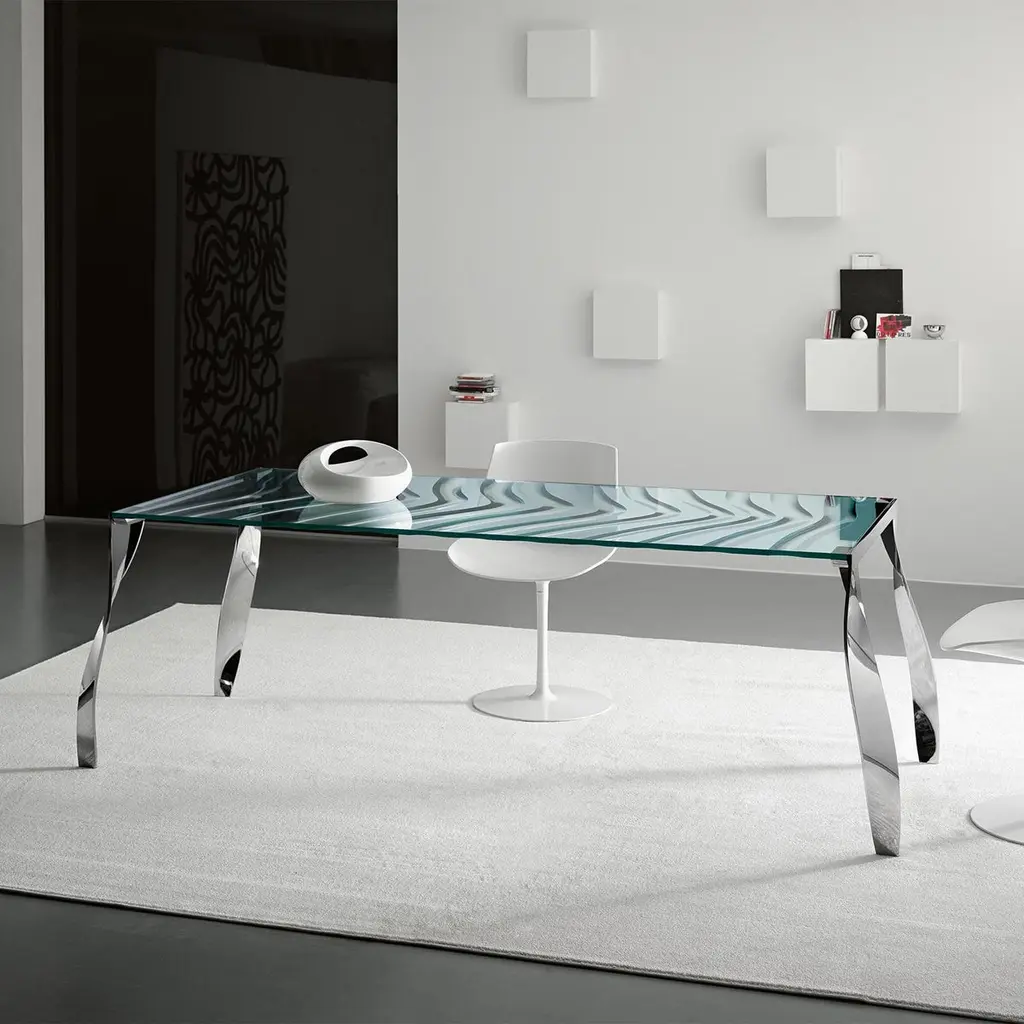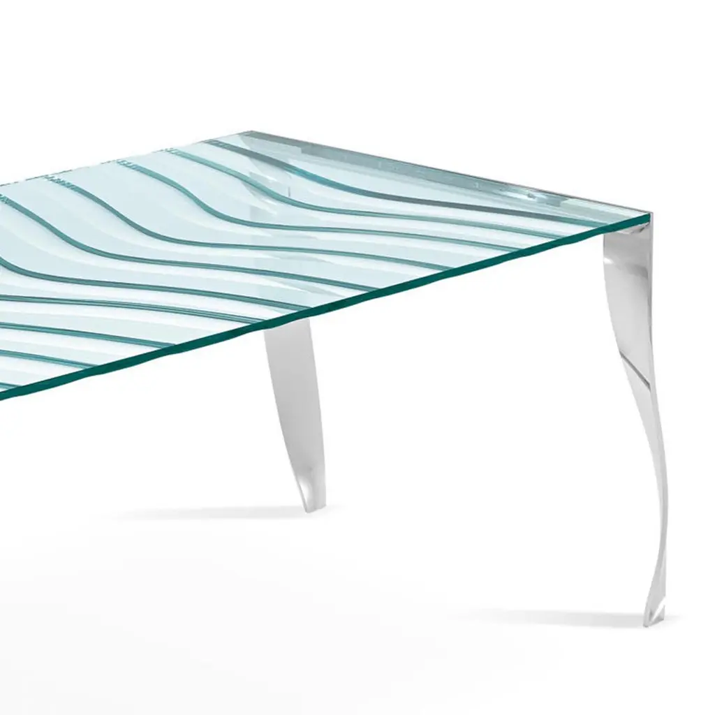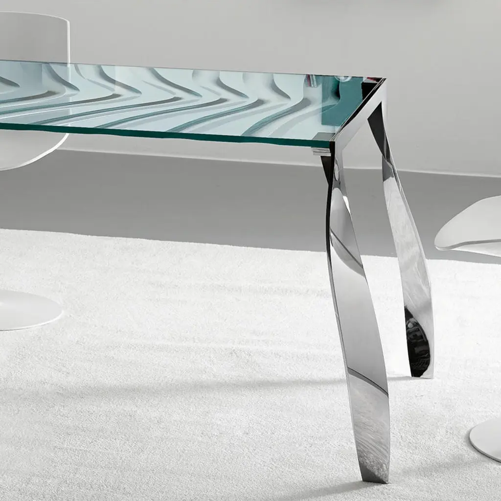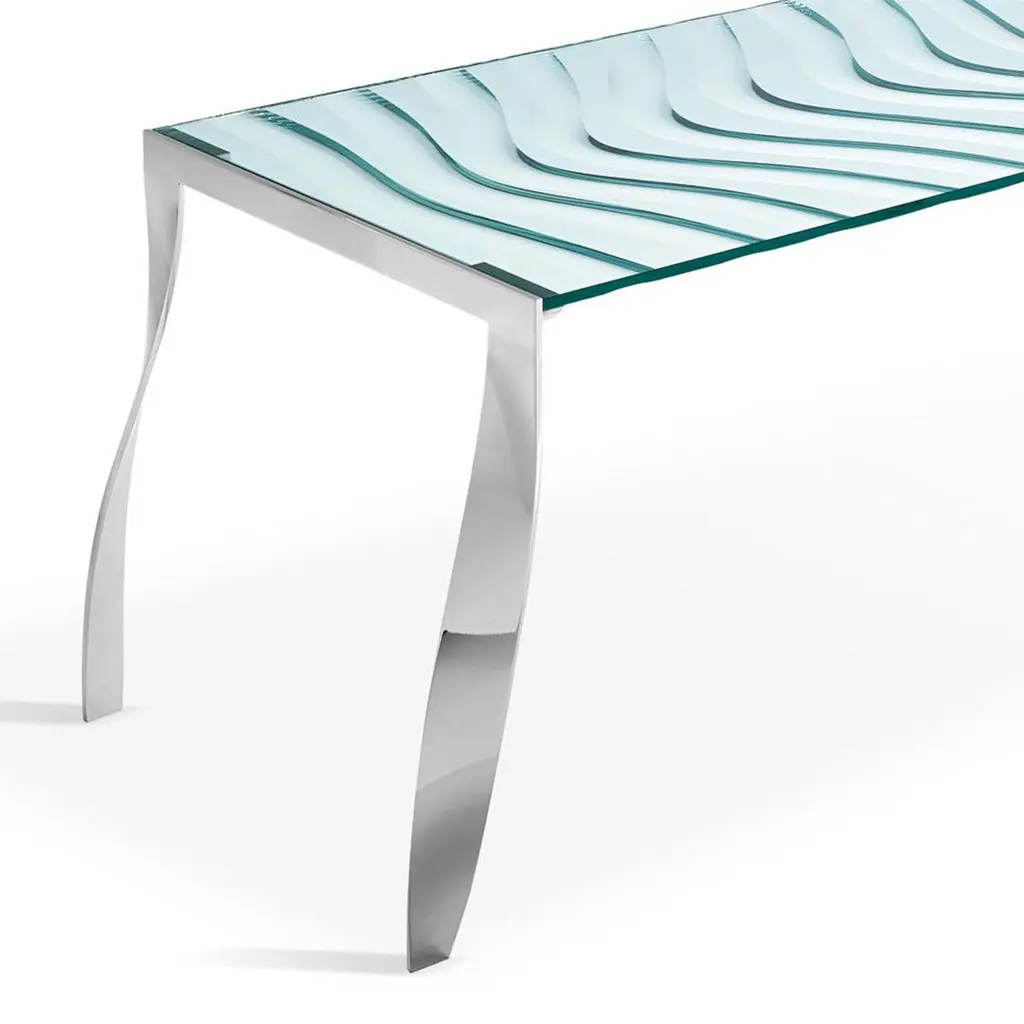 Dining table Ondulate Glass with flat clear glass top with waved lower surface. With 4 steel feet in polished chrome finish.Also available on request in:L180xD95xH74cm, price: 12300,00€.