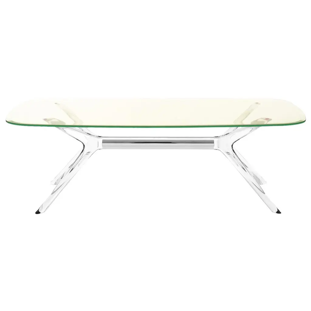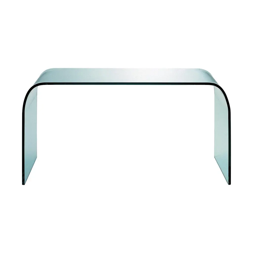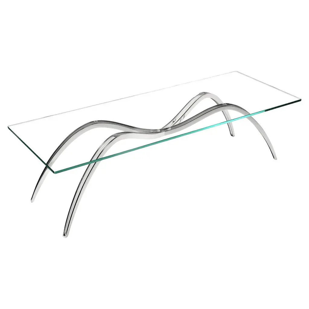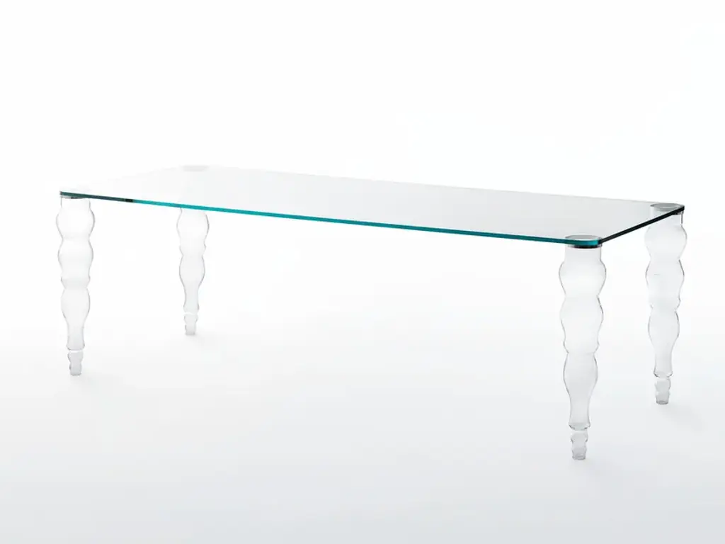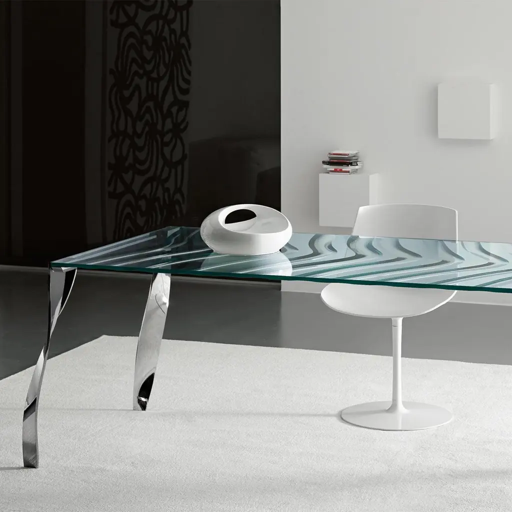 Dining table Ondulate Glass with flat clear glass top with waved lower surface. With 4 steel feet in polished chrome finish.Also available on request in:L180xD95xH74cm, price: 12300,00€.