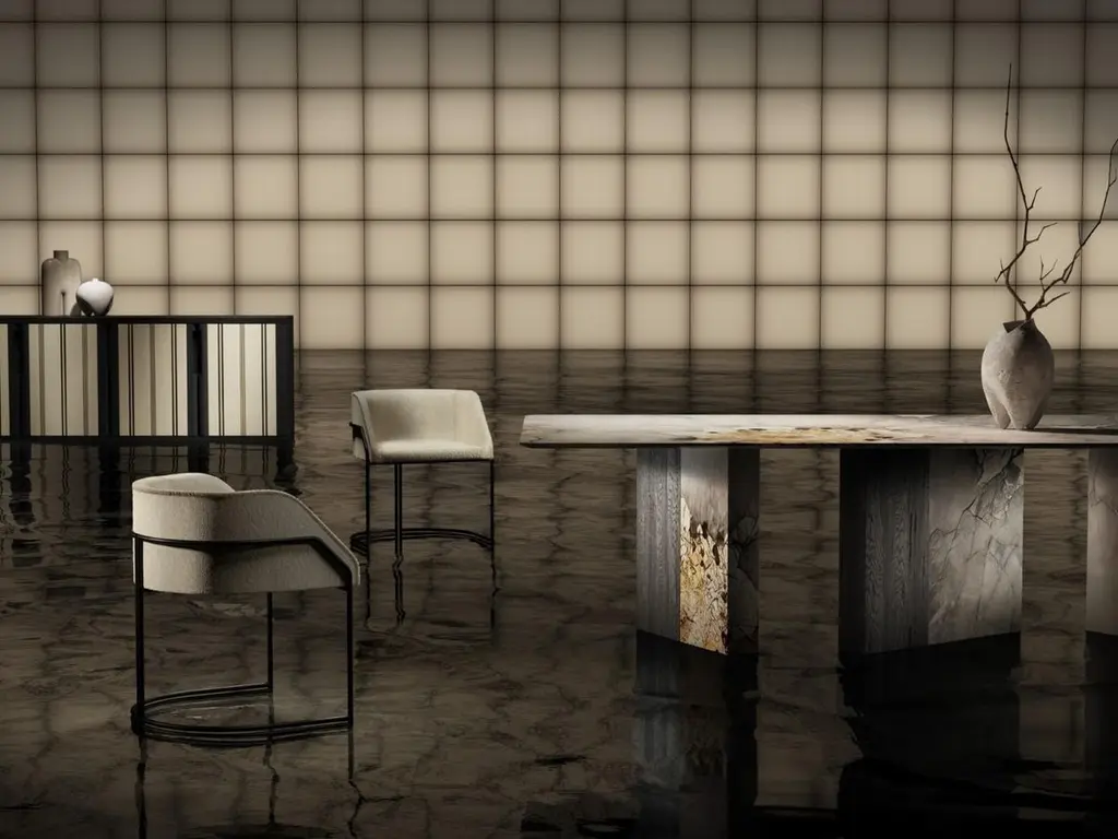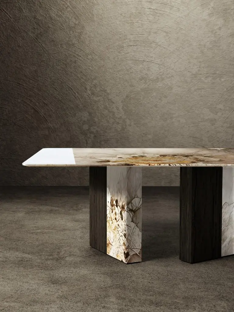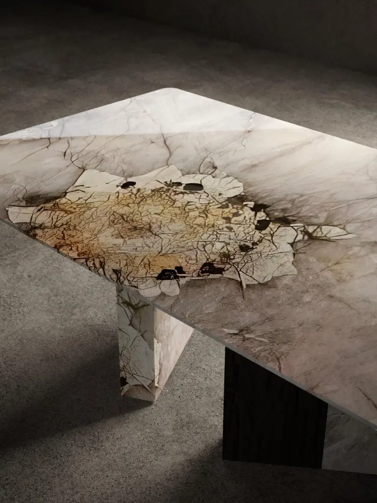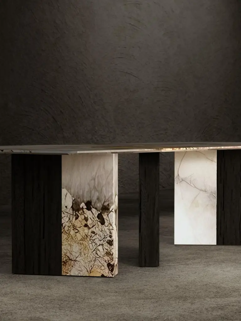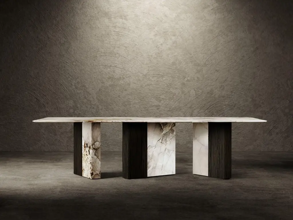 One Way Or Another dining table is composed of a top in Patagonia marble with diamond-cut on the lower edge, reinforced by a metal support fixed to three asymmetrical legs. Each leg is covered with a different combination of Patagonia marble slabs and a casing in brushed brass or black fir wood.DIMENSIONSL280xW120xH74 cm