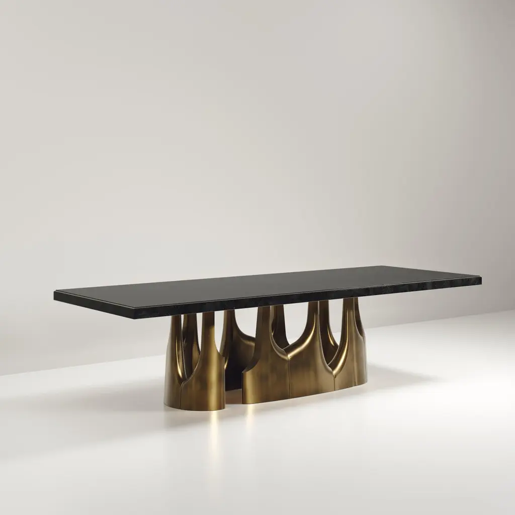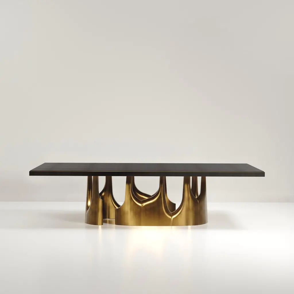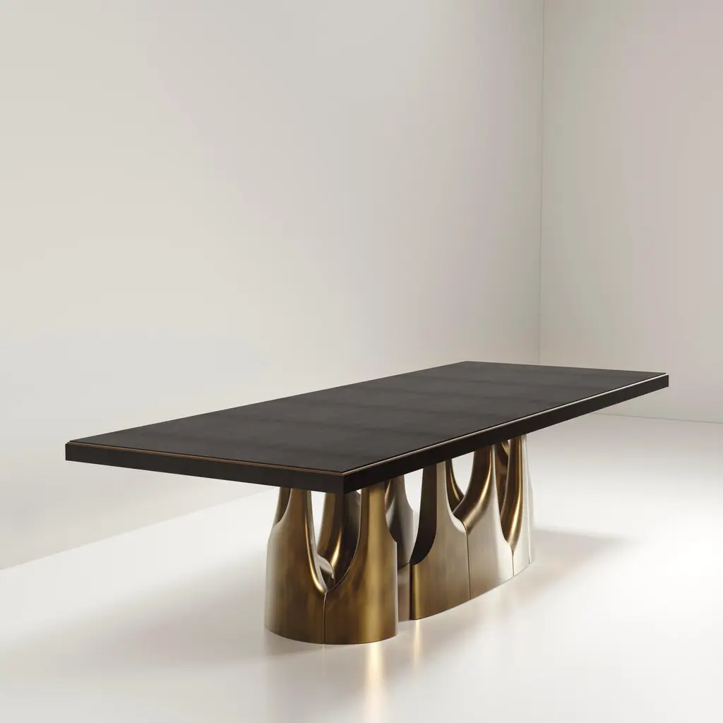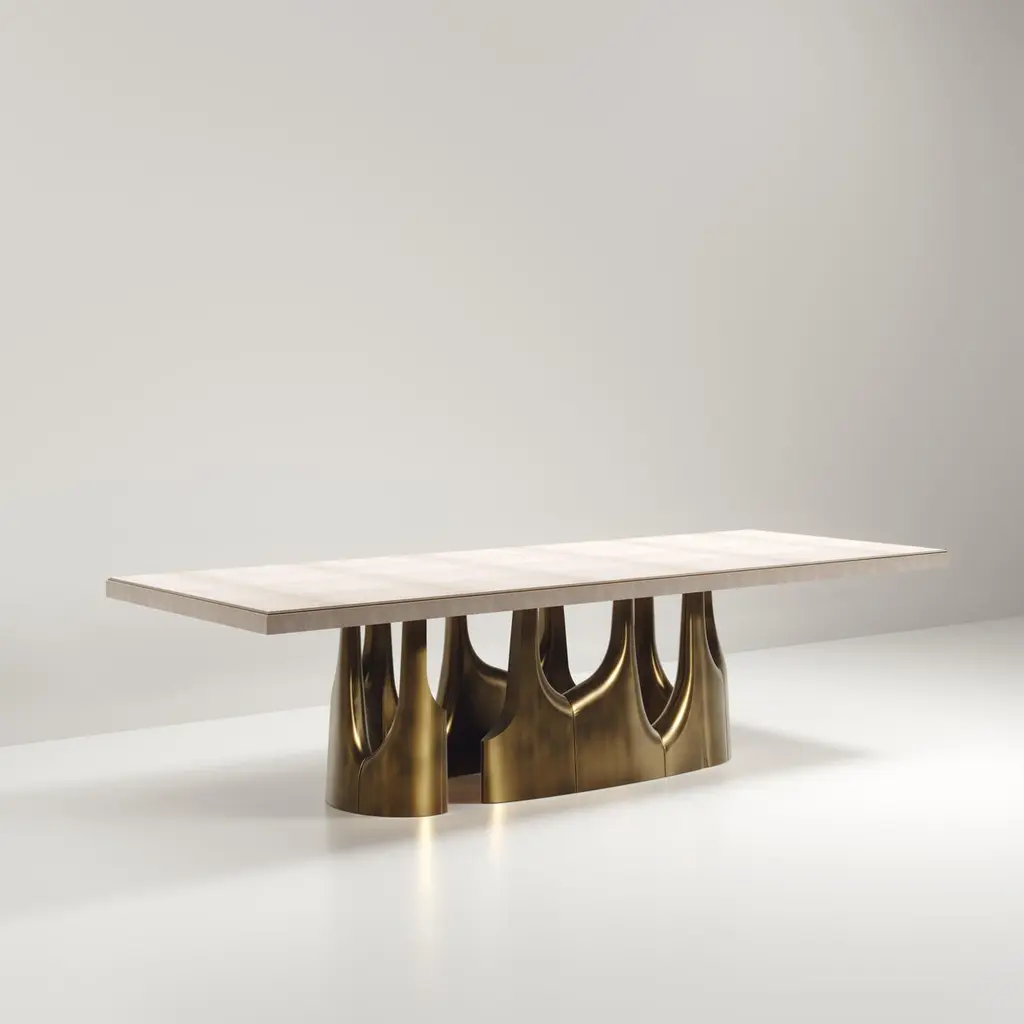 The Paris based label has distinguished themselves since their launch, with their iconic use of shagreen mixed with brass and other exotic materials. All furniture is handcrafted by skilled artisans, ultimately making each piece unique, designed in Paris and produced in the Philippines.The Triptych II dining table by R&Y Augousti is a stunning multi-faceted sculptural piece. The beautiful hand craved details on the long clustered bronze-patina base demonstrate the incredible artisan work of Augousti. The top is a rich cream onyx. Available in other finishes and other variations The dimensions of this piece are118.11 x 43.31 x 29.53 inchesAll R&Y Augousti pieces are handmade by artisans, ultimately making each piece unique. Custom color or sizing available on request. Wipe clean with soft dry cloth.Acclaimed design duo Ria & Yiouri Augousti have established themselves since the 1990s as pioneers of modern-vintage style through their luxurious Art Deco inspired collections.The Paris based label has distinguished themselves since their launch, with their iconic use of shagreen mixed with brass and other exotic materials. All furniture is handcrafted by skilled artisans, ultimately making each piece unique. All shagreen-covered items should be kept out of direct sunlight, color variants may occur on the stingray and other exotic finishes, but this showcases the Parisian label's commitment to creating authentic luxurious products using natural components.