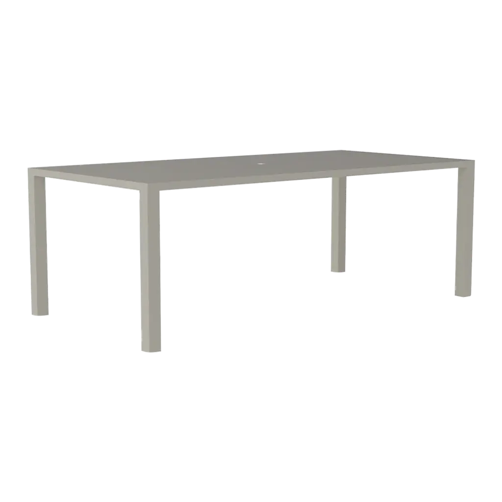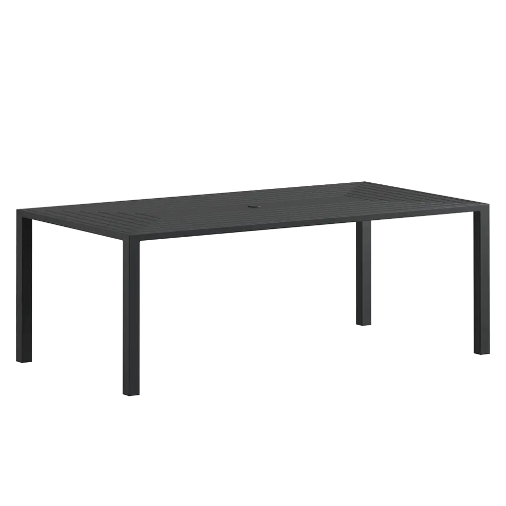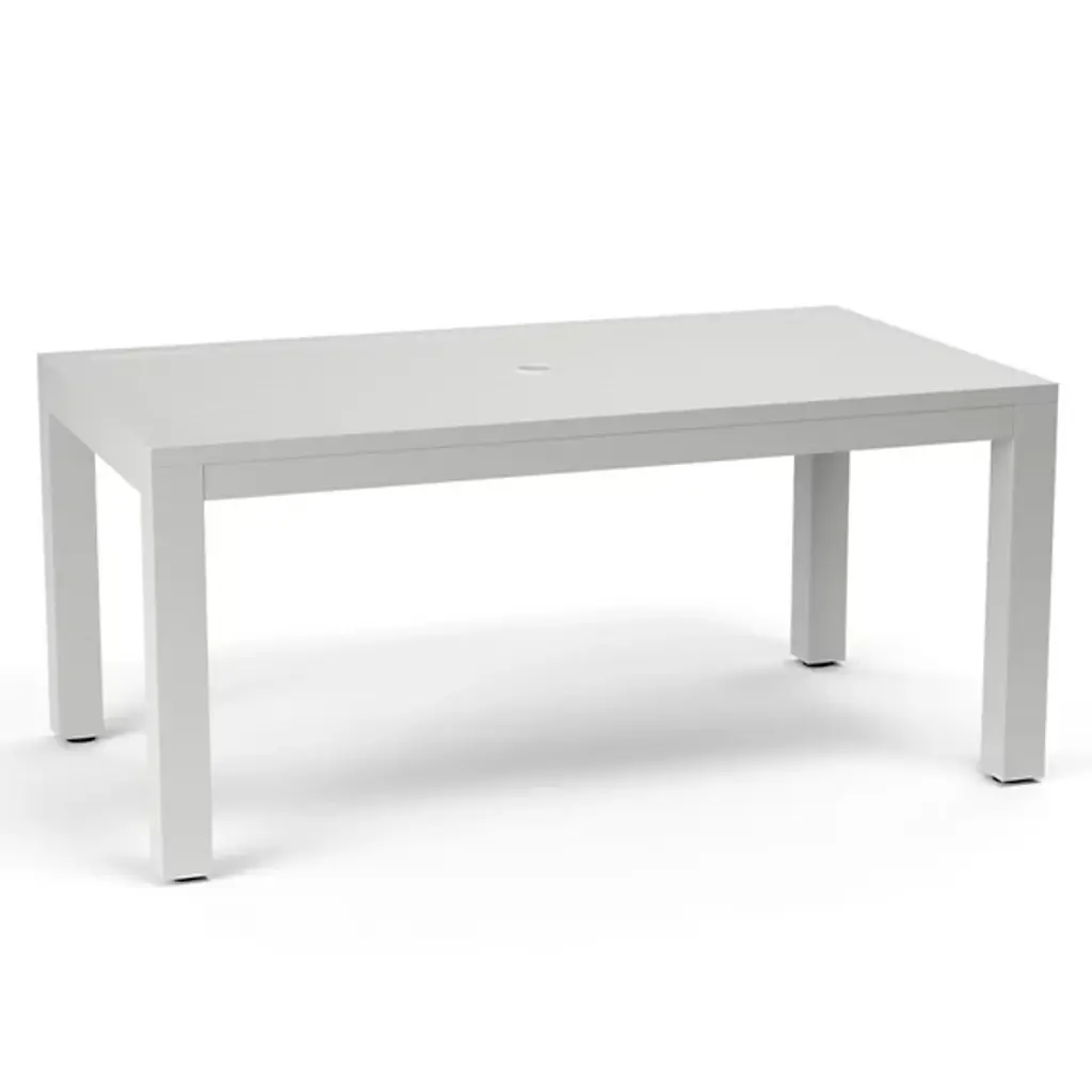 Dimensions: 84W x 44D x 30H A versatile new outdoor collection that features everything you need to create an outdoor oasis! The oomph Outdoor Dining Table is the work horse of the collection. Anchor your space with this perfect piece and the rest is easy! The only question is - what color! Frame: Weather-resistant, premium powder coated aluminum Features: Fully-welded and assembled. 360 degree welds for maximum strength and longevity. Solid billet aluminum tops milled in modern, geometric patterns. Center hole to accommodate an umbrella. Made in America
