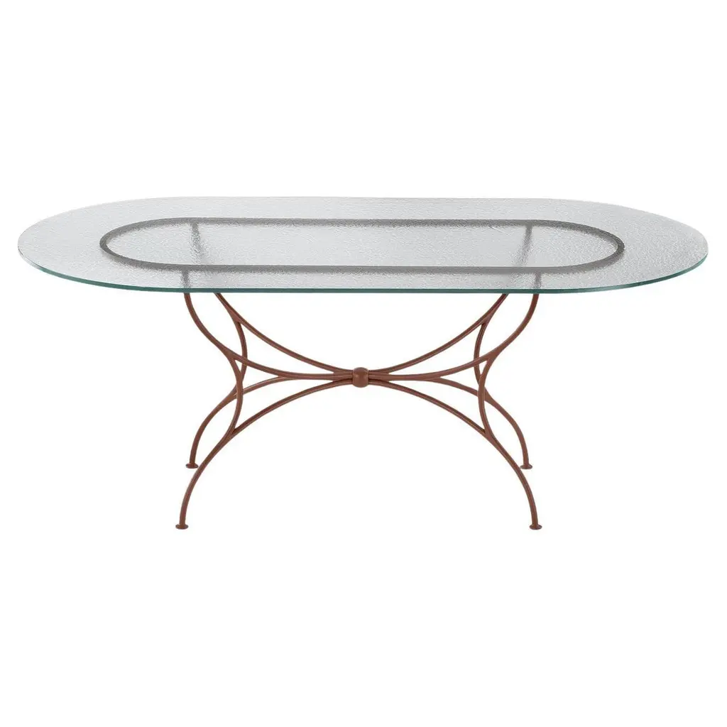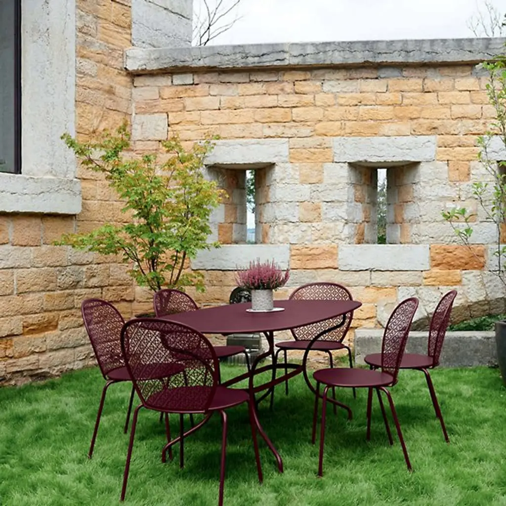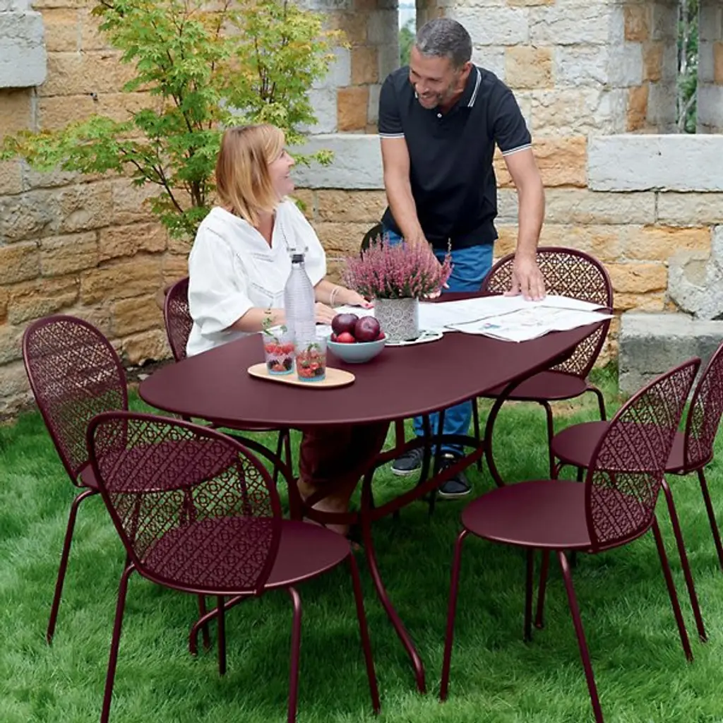 Sleek, sophisticated design for elegant outdoor dining spaces. With the Opera+ Oval Dining Table by Fermob, the plus refers to what’s been added to keep it strong and beautiful even with heavy outdoor use. It is made entirely of steel, with a thicker than normal steel sheet top and tubular steel legs. Fastening systems between the top and base and between the base and central steel band help to keep the whole dining table firmly connected and super-stable.
