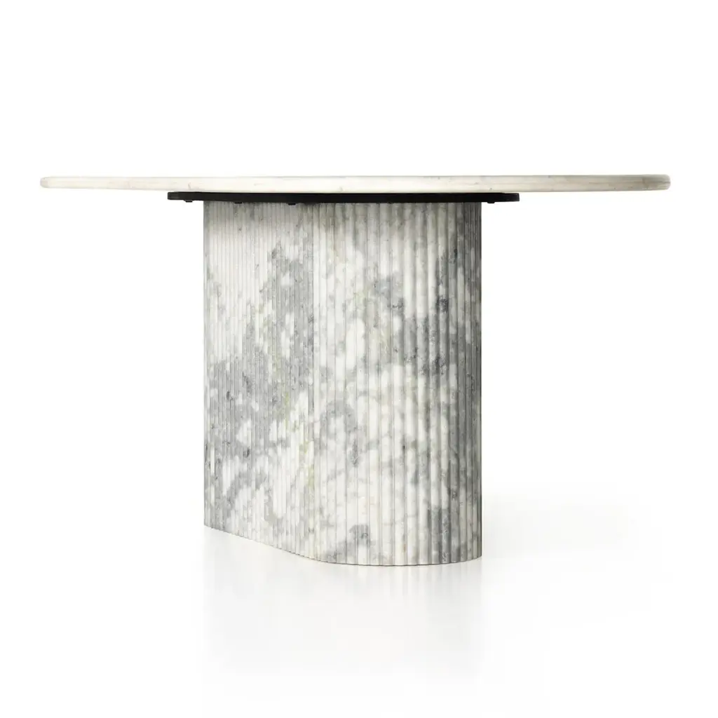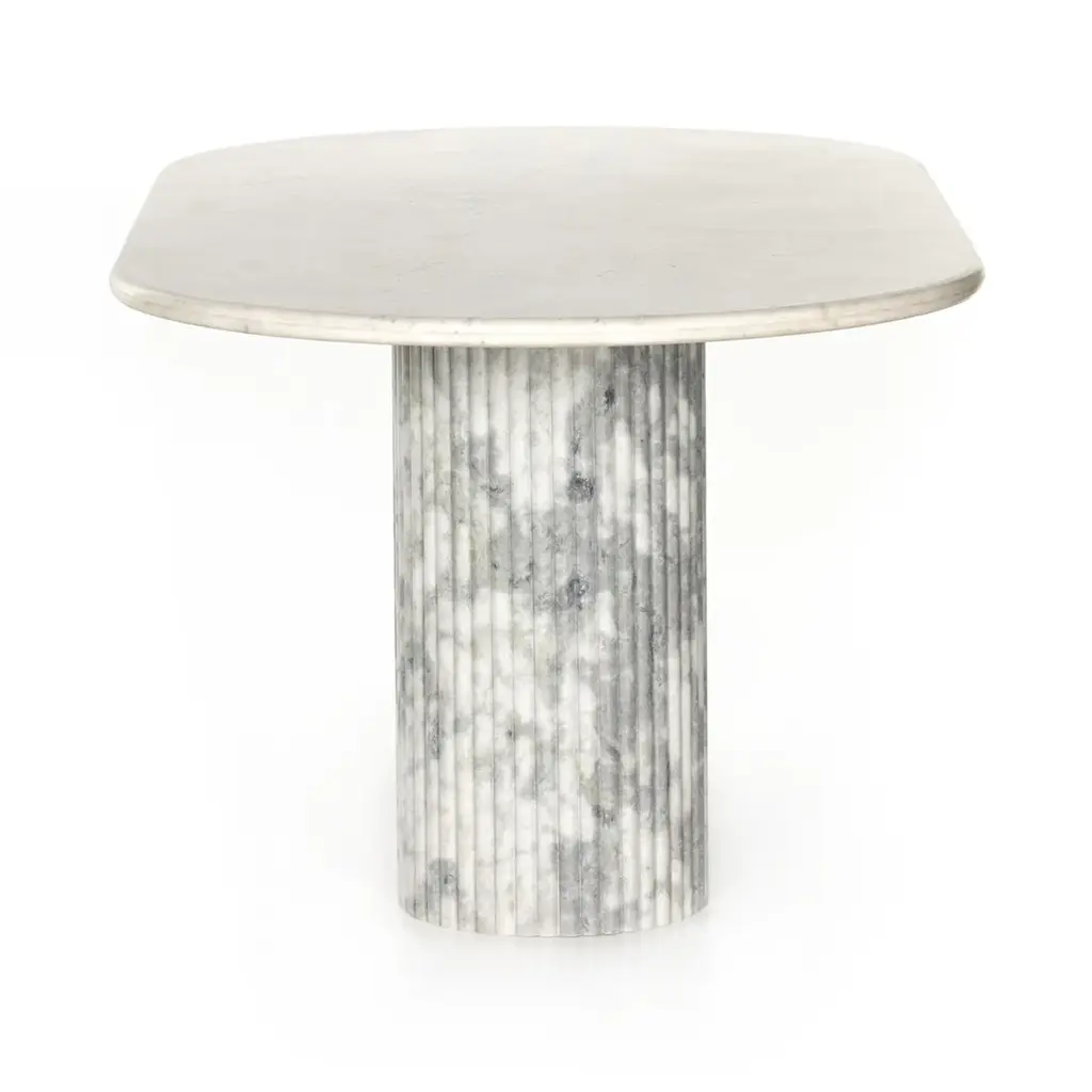 Italian-inspired for effortless sophistication. A swirling marble base is scalloped for a linear look with heavy texture. An oval-shaped tabletop of polished white marble seats six comfortably. In Stock Early January 2026 Matching marble base Polished marble top This image is for illustrative purposes only. The colors shown are accurate within the constraints of lighting, photography, and the color accuracy of your screen.