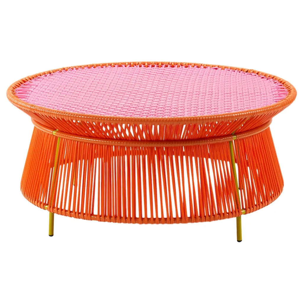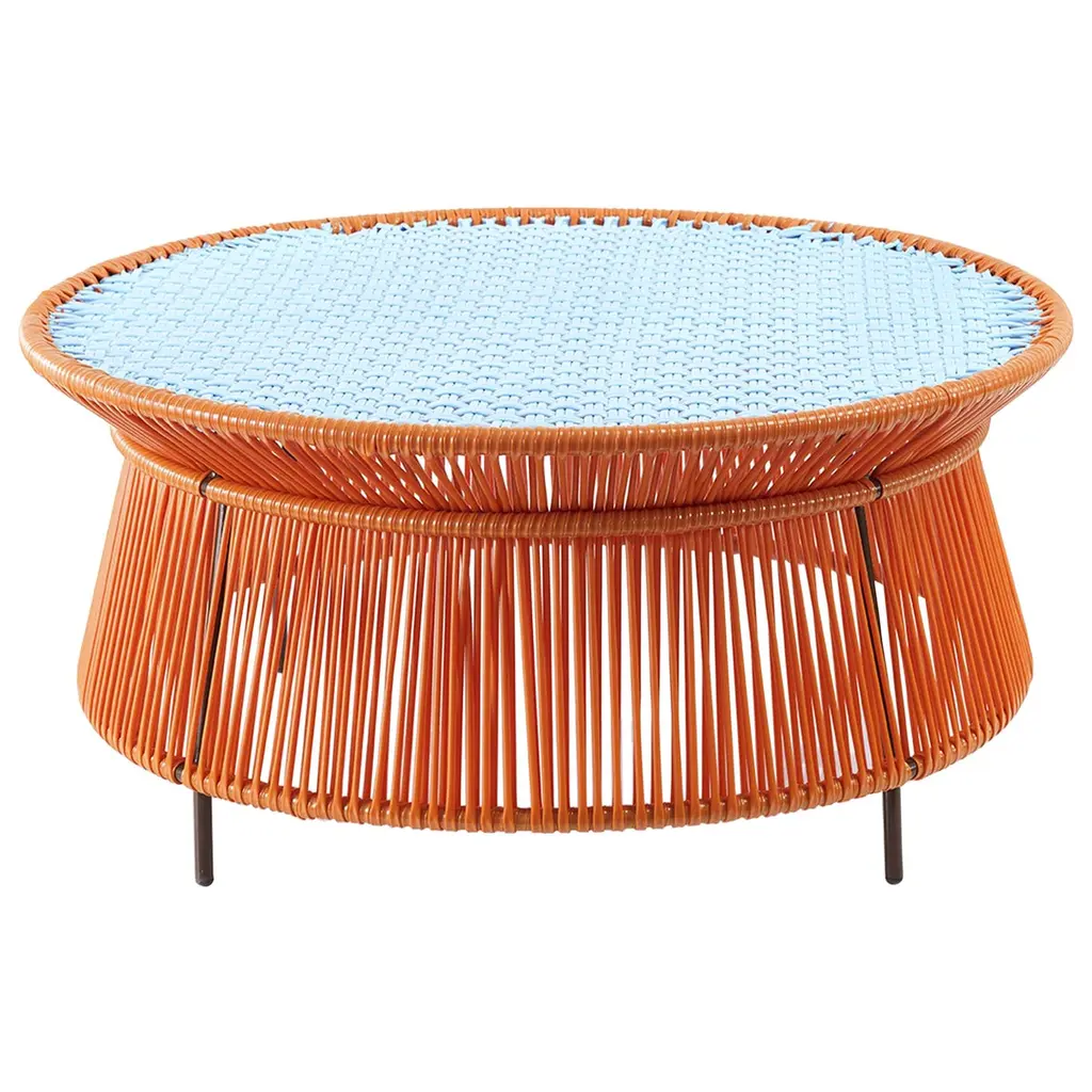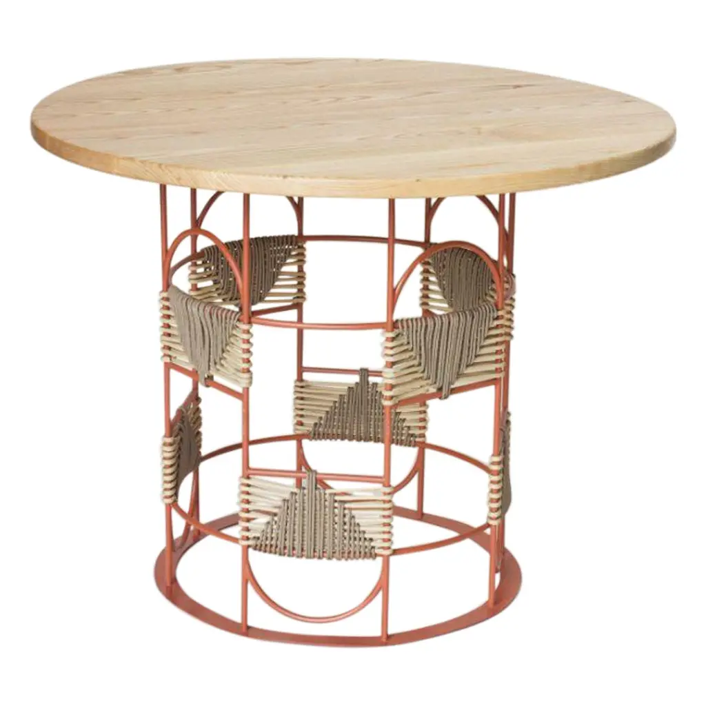 Orange caribe dining table by Sebastian HerknerMaterials: Galvanized and powder-coated tubular steel. PVC strings are made from recycled plastic.Technique: Made from recycled plastic and weaved by local craftspeople in Colombia. Dimensions: Top diameter 135 cm Base diameter 59 x height 75Also available colors: blue/ black, mint/ grey white, orange/ curry. The elegant Caribe Dining Table is an elegant design for in- and outdoor seating arrangements, featuring a base with hard-wearing PVC strings and a metal tabletop. It’s part of the Caribe collection, designed by Sebastian Herkner for ames. The German designer visited Colombia together with Ames founder Ana Maria Calderon-Kayser and translated the vibrancy and spirit of the country’s people and traditions into joyful, modern furniture pieces defined by clean lines, strong colors, and the hand-woven webbing.Each table is made in Santa Marta, a city on the Caribbean coast of Colombia, by local craftspeople. They weave the PVC strings, which are made from recycled plastic, around the tubular steel frame of the base. The weaving technique the artesanos and artesanas use are called Momposino, a traditional method known for intricate patterns. Just the preparation of all the materials takes ten days, while the production of each table takes three daysGerman designer Sebastian Herkner is a long-term collaborator of Ames and has visited Colombia multiple times to experience the country’s cities, nature and people first hand. He also visited many of the ateliers that Ames has partnered with to learn about the unique traditional crafts of Colombia's regions. A sought-after contemporary designer and recipient of many industry awards, he has worked with many international design brands, creating intriguing pieces that showcase his intuition for interesting material, color, and texture combinations