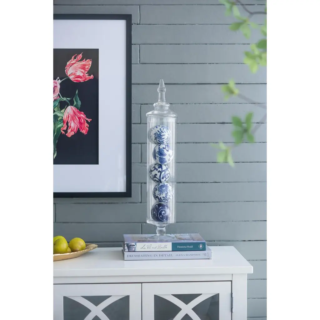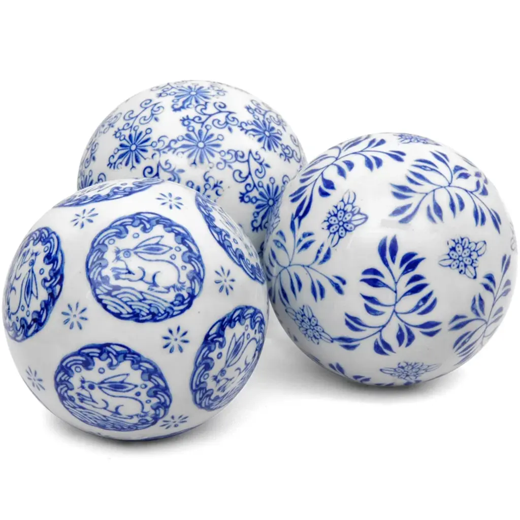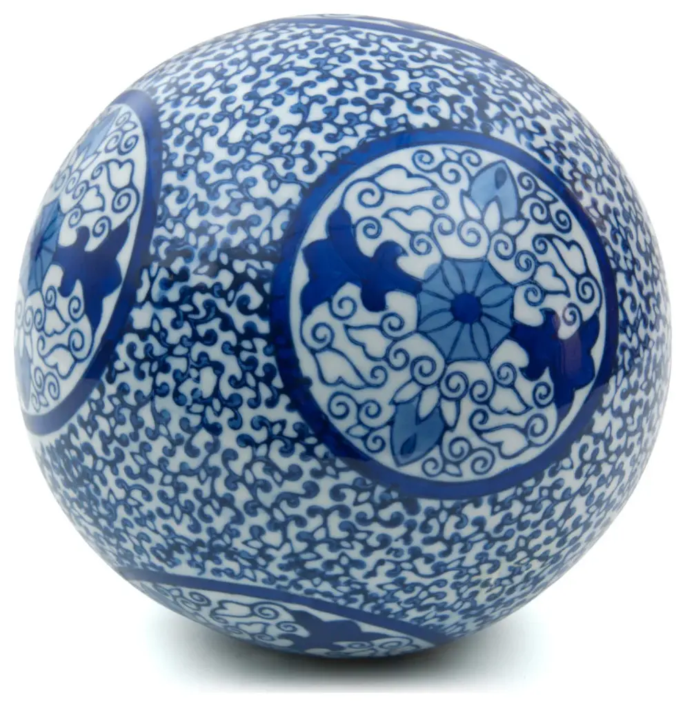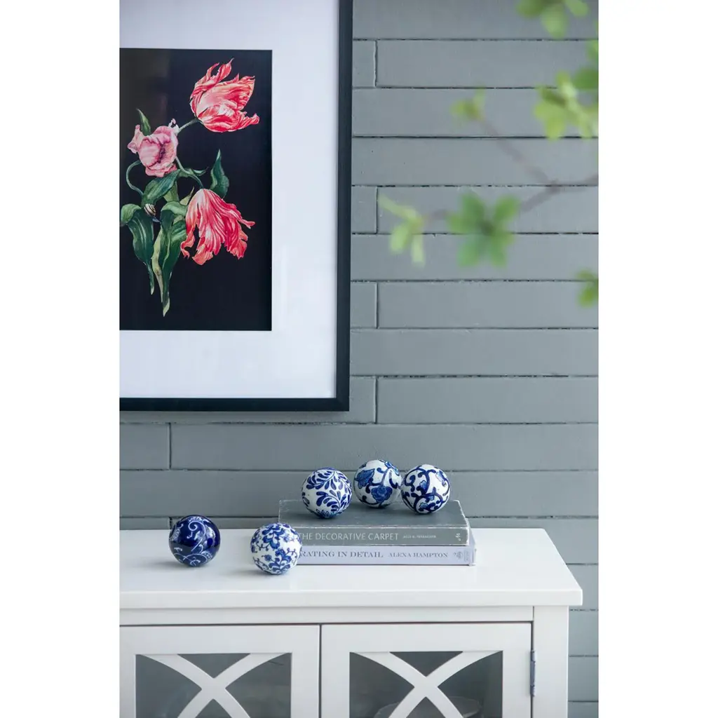 This set of six Decorative Orbs features a bold yet traditional color combination, elegant flourishes, and an eye-catching shine. Display these orbs in a decorative bowl on an entryway table, dining room centerpiece, or in a classic white kitchen. The pop of blue against a bright, white background give these orbs a stunning effect in any space.