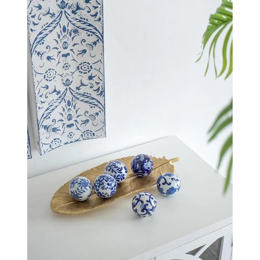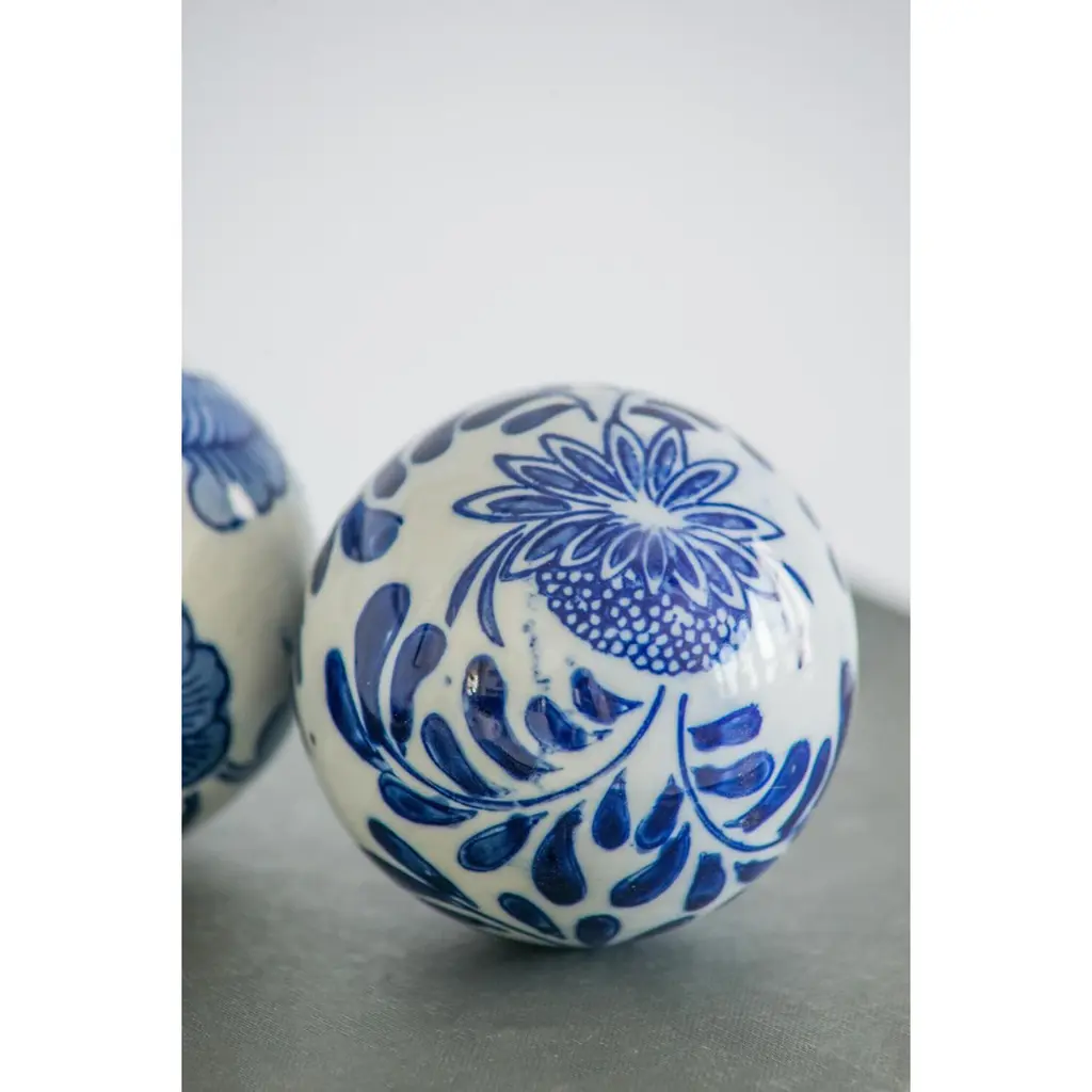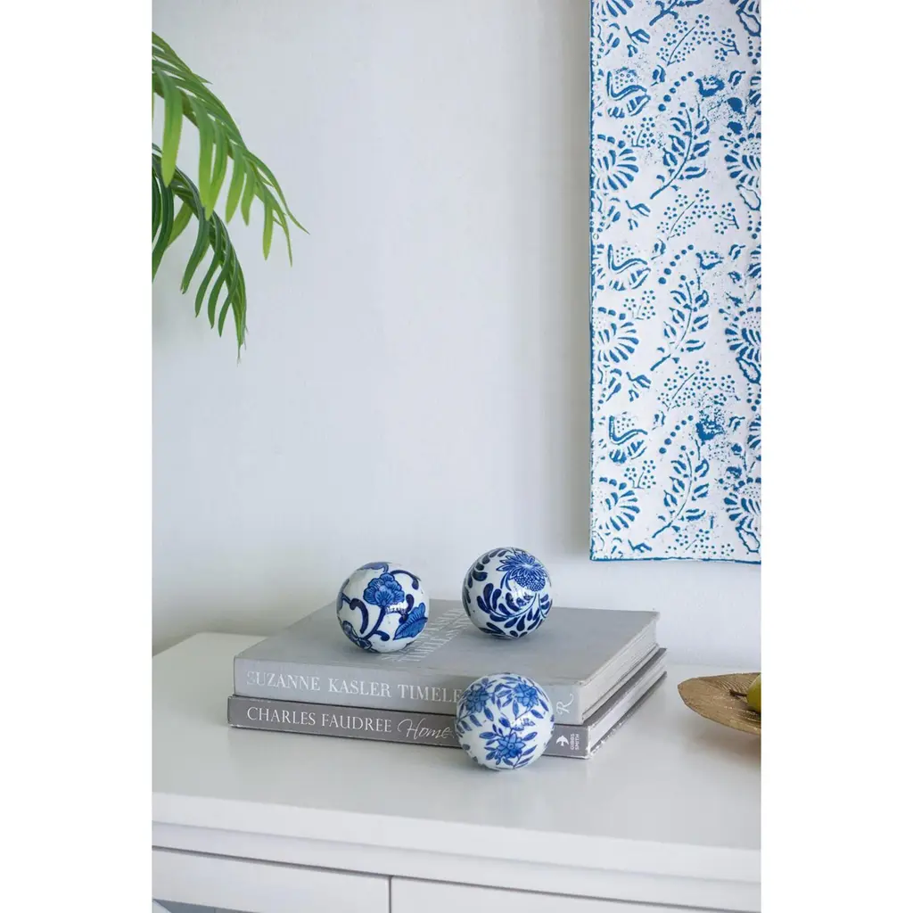 This set of six Decorative Orbs features a bold yet traditional color combination, elegant flourishes, and an eye-catching shine. Display these orbs in a decorative bowl on an entryway table, dining room centerpiece, or in a classic white kitchen. The pop of blue against a bright, white background give these orbs a stunning effect in any space.