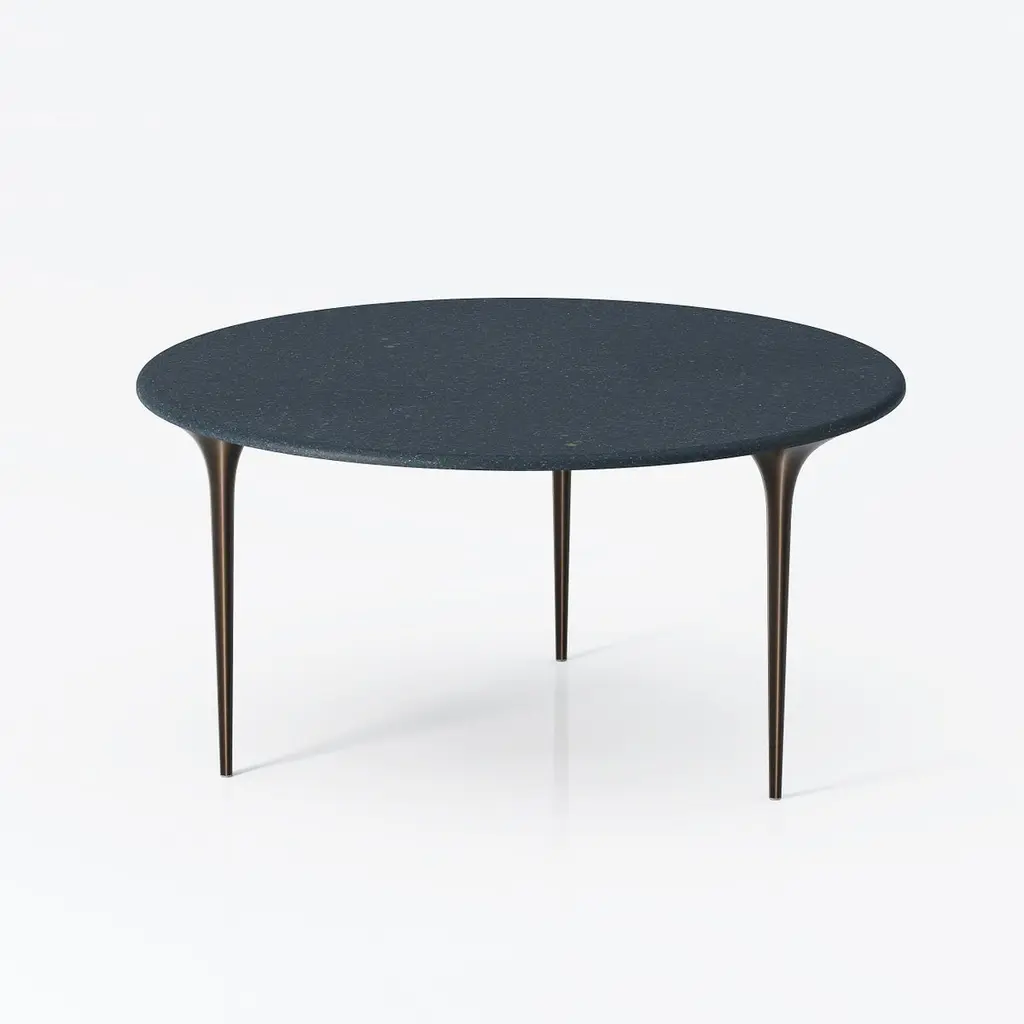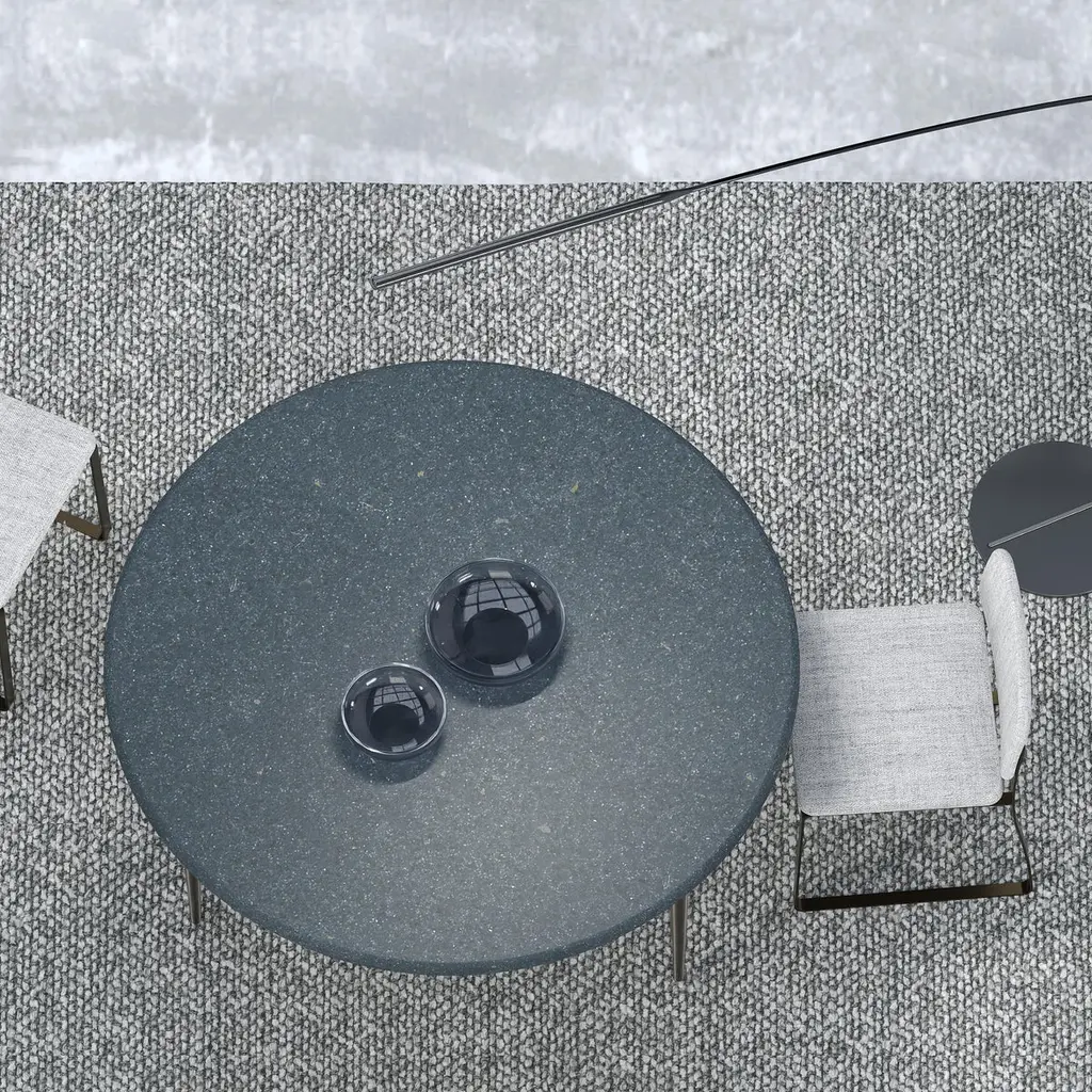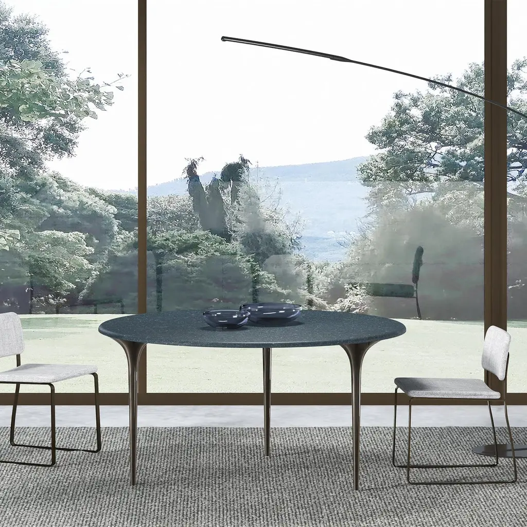 Organic 150 Round Dining Table by spHausDesigned by Filippo Dell'OrtoDimensions: D 150 x H 73 cm.Materials: MDF, aluminum, steel, lapis lazuli.Organic is a family of indoor dining tables with a 25 mm thick MDF, aluminum laminated top, lightened by a rounded 20 mm upper edge. The table legs are made of turned steel sheets. The Organic comes in oval, rectangular, round, elliptic, and even triangular versions. Customized sizes are also available upon request. The special “Material” version offers a range of luxurious hand-made finishes: a mixture of precious marble powders or river sands is applied to the table tops with a meticulous rebuilding technique.spHaus is an Italian company producing high-end contemporary indoor and outdoor design furniture.