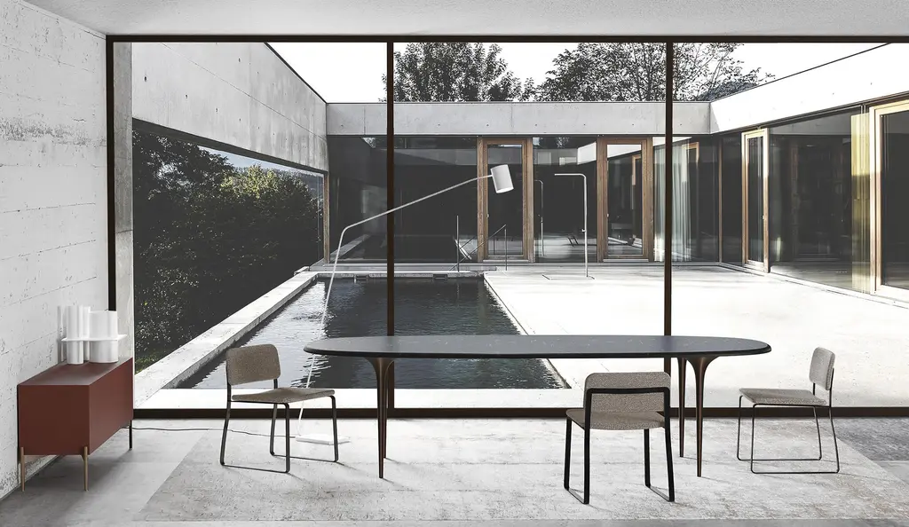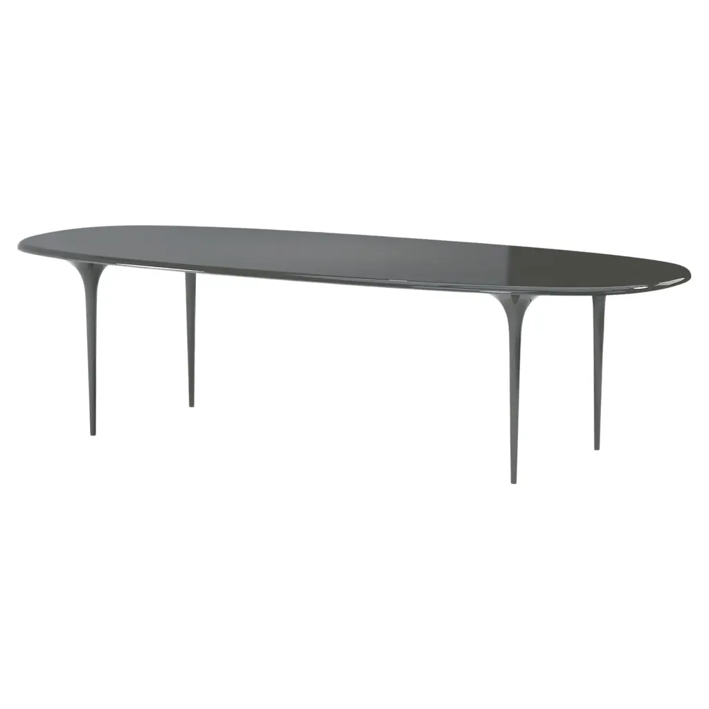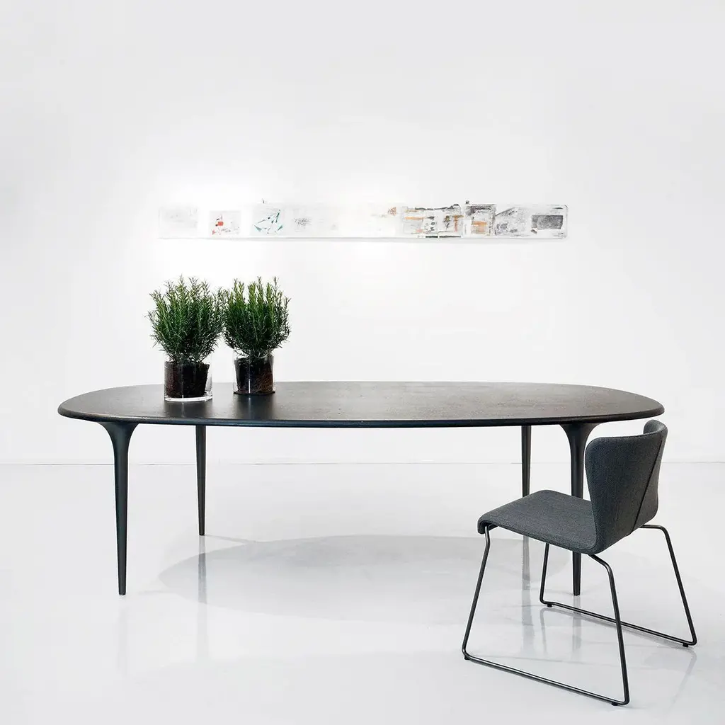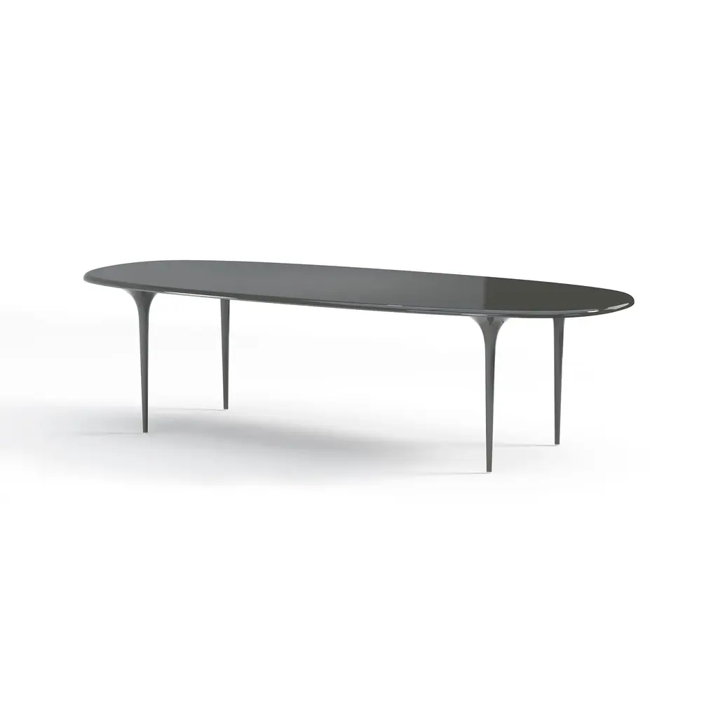 Organic 280 oval dining table by sphaus designed by filippo dell'orto dimensions: d 118.5 x w 284.6 x h 73 cm. Materials: mdf, aluminum, steel, belgian blue stone. Organic is a family of indoor dining tables with a 25 mm thick mdf, aluminum laminated top, lightened by a rounded 20 mm upper edge. The table legs are made of turned steel sheets. The organic comes in oval, rectangular, round, elliptic, and even triangular versions.