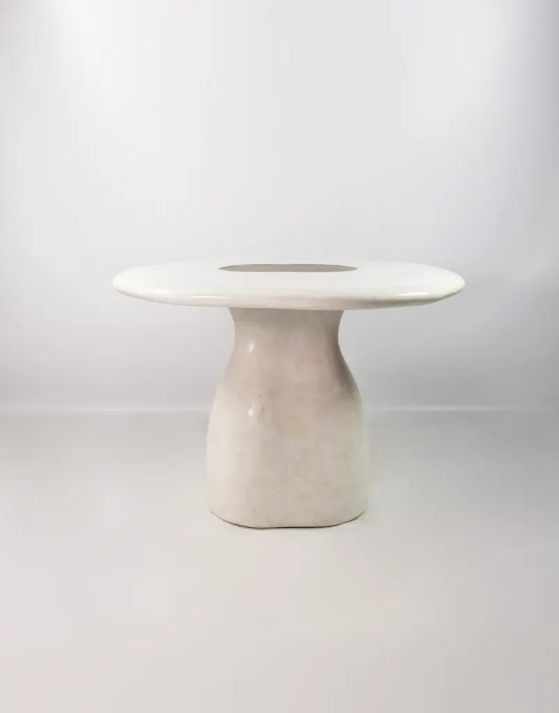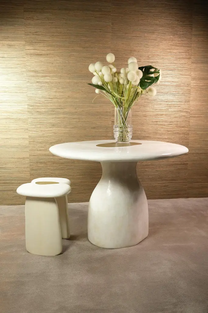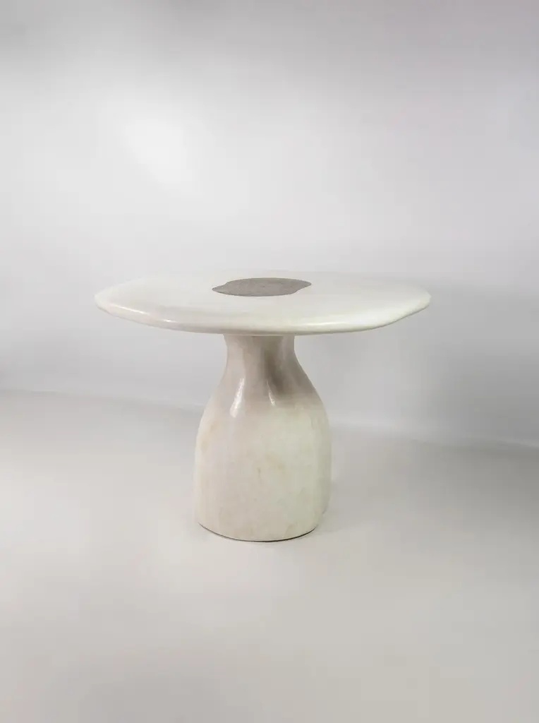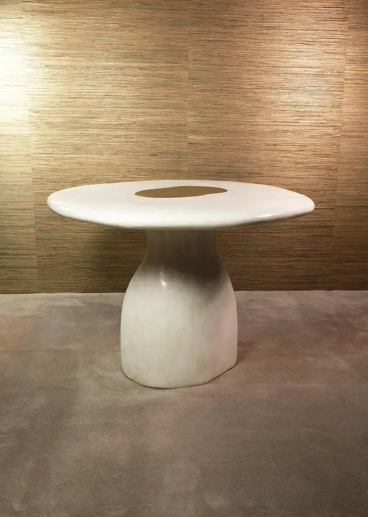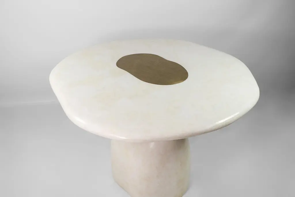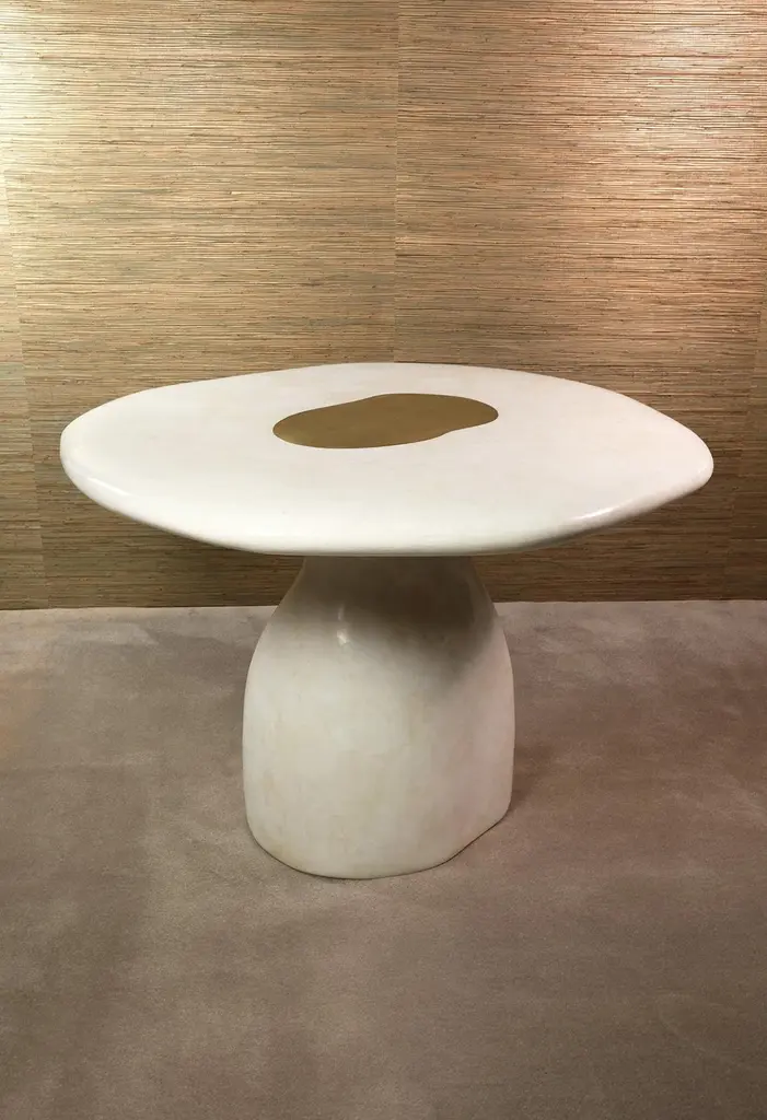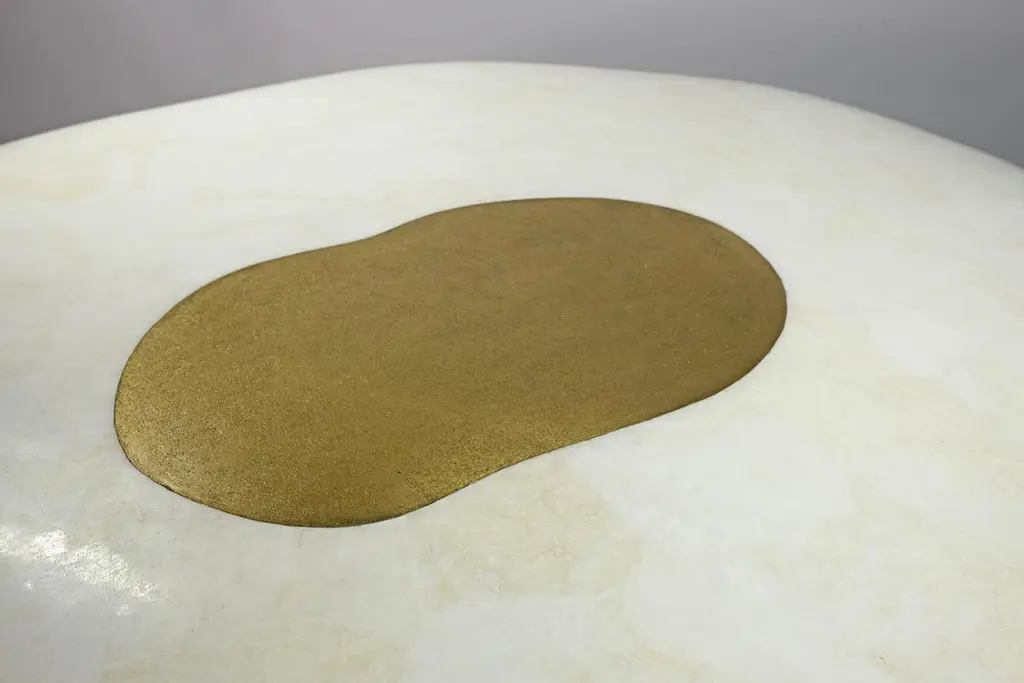 This organic shaped center table is made of white rock crystal marquetry top with a textured brass decor (hammered).The base is made of white rock crystal marquetry.This piece can be used as a center table in a entry hall or as a dining table.Dimensions:42.5" x 39.4" x H29.9" (108x100x76cm)Care instructions:To clean, simply wipe with a dry clean clothDo not use any cleaning agent on the surfaceThis piece is 100% handmade by our talented team of master craftsmen.