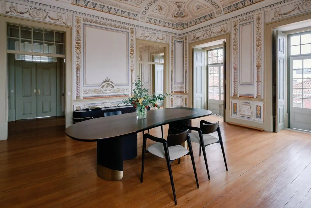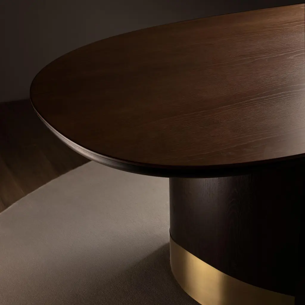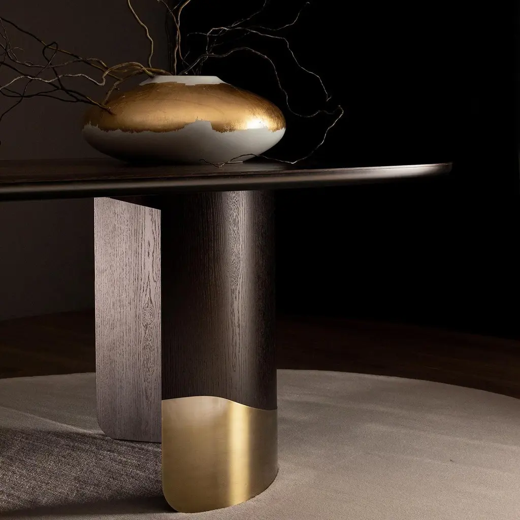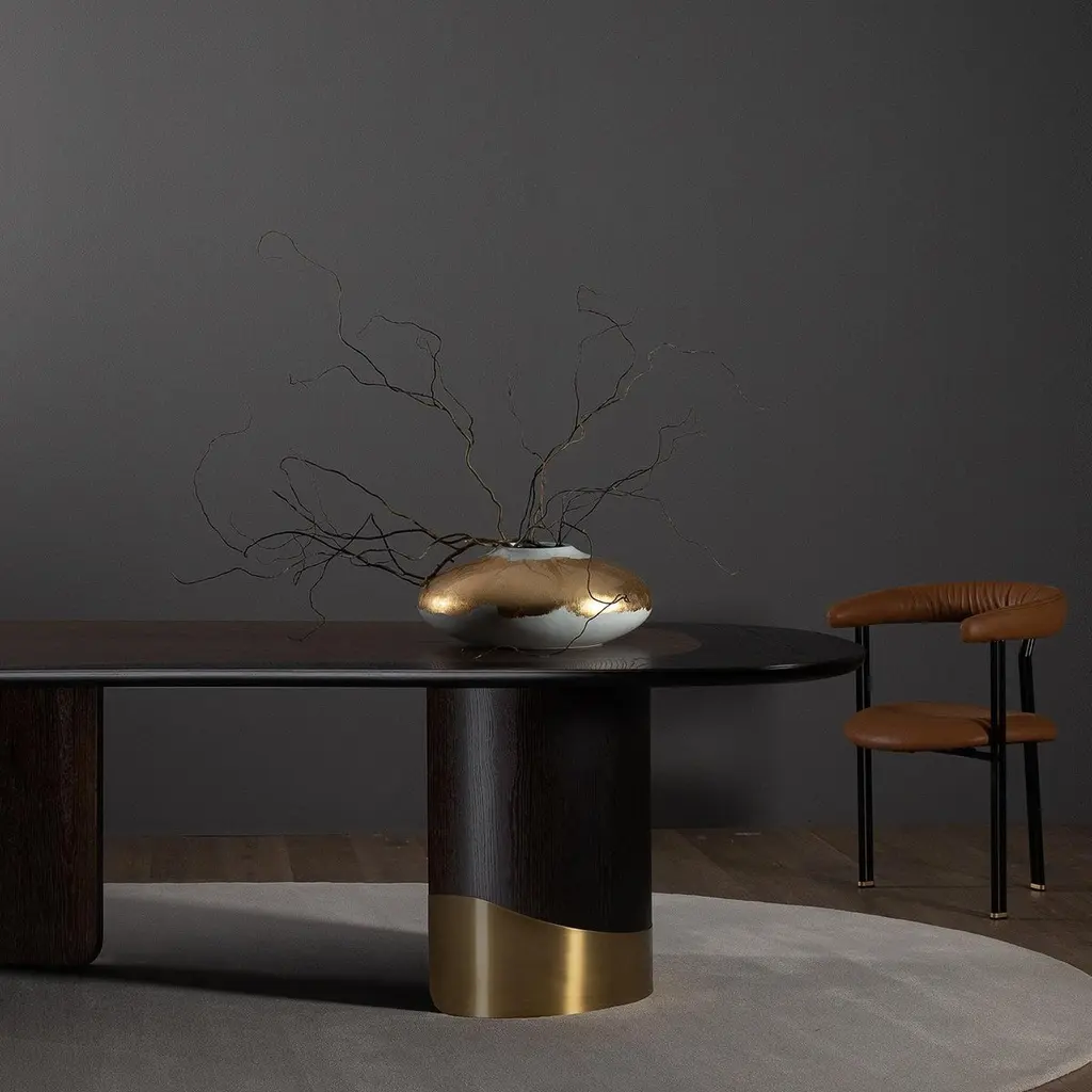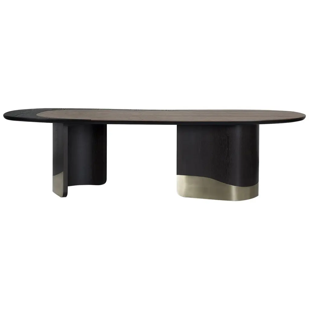 Organic Modern Armona Dining Table, Contemporary Collection, Handcrafted in Portugal - Europe by Greenapple.The Armona dining table draws inspiration from the serene landscape of Armona Island, embodying a sense organic beauty and effortless sophistication. Its flowing tabletop reflects the gentle curves of the coastline, creating a harmonious balance between nature and contemporary design. Meticulously crafted with precision and care, the Armona dining table stands as a statement of refined artistry, destined to be the heart of any dining space.The Armona dining table features a bean-shaped top in American oak veneer, showcasing a dual finish: open-pore stained dark brown and open-pore stained brown walnut, both sealed with a matte varnish. The round-edged table top is lacquered in satin black. Supporting the top are two semicircular bases in American oak veneer, stained in dark brown with an open-pore and a matte varnish. The veneer is anti-fungal and vermin-free, ensuring durability and preservation.Inlaid metal details are in brushed and burnished antique brass, finished with a high-gloss varnish.The Armona dining table can be customized in terms of dimensions, materials and finishes. Armona 10-Seat Dining Table Material CodesWD026 American oak; open-pore dark brown stained; matt finishME007 Oxidised brass; high-gloss finishWD123 American oak; open-pore tobacco colour stained; eggshell finishFI007 Black lacquer; satin finishHandcrafted in Portugal - Europe by GreenappleUnique by design, Crafted by peopleGreenapple transforms contemporary spaces into exclusive narratives of design and craftsmanship. From custom-made furniture to bespoke interiors, each creation is a timeless work of art, shaped by master artisans who honor centuries-old techniques.Founded in 2005 by Sérgio Rebola and Rute Martins, Greenapple has earned global recognition among high-end clientele and leading design firms. While Rute designs each unique piece, Sérgio ensures uncompromising quality from design to production and from production to your home. We provide a seamless experience, offering short production lead times, worldwide delivery within 7 to 10 days, and white-glove service upon request.For U.S. clients, we can handle all customs clearance, cover duties, and offer white-glove service as well upon request.Table