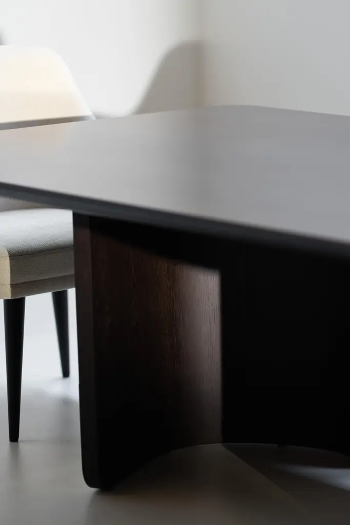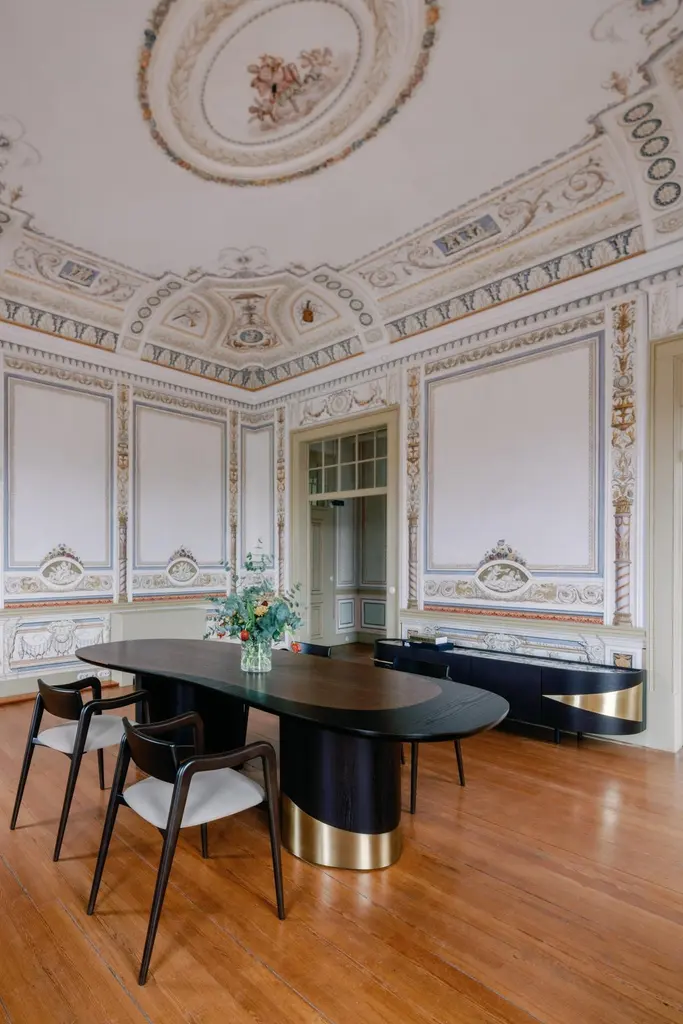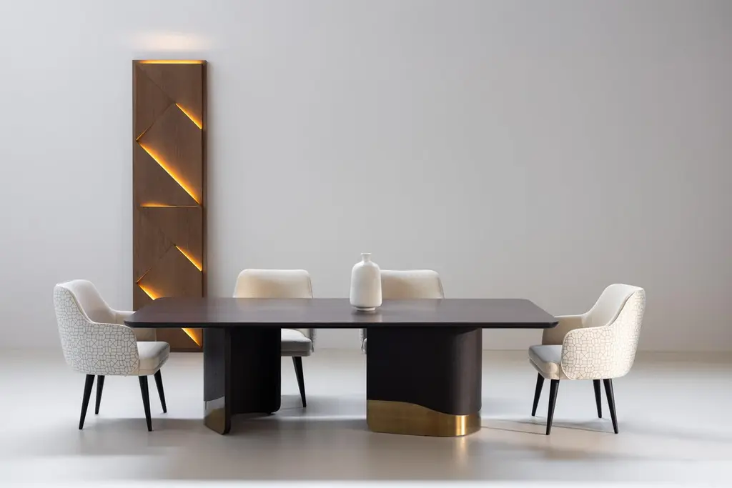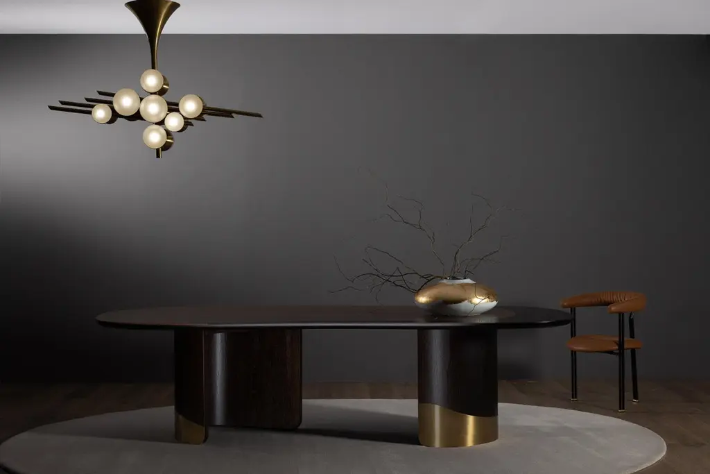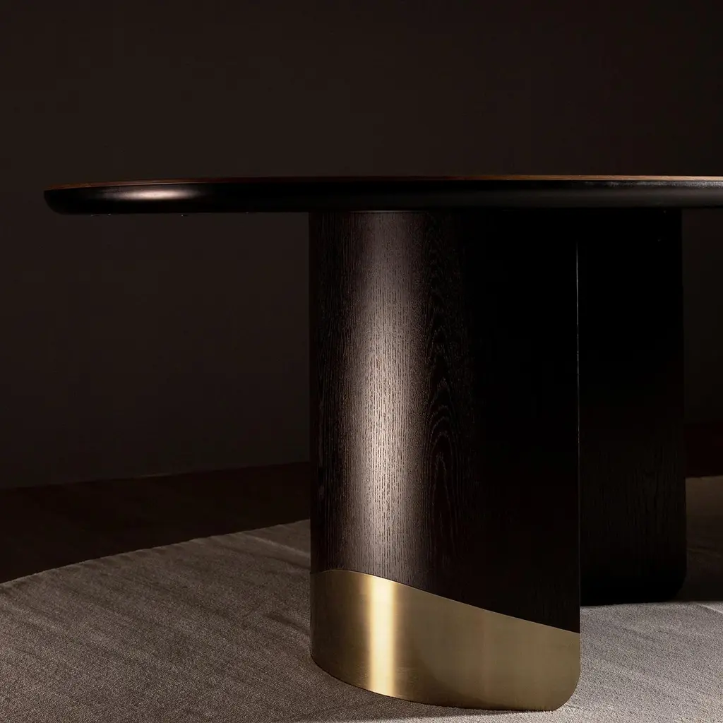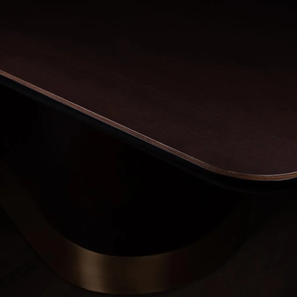 Organic Modern Armona Dining Table, Contemporary Collection, Handcrafted in Portugal - Europe by Greenapple.The Armona dining table draws inspiration from the serene landscape of Armona Island, embodying a sense organic beauty and effortless sophistication. Its flowing tabletop reflects the gentle curves of the coastline, creating a harmonious balance between nature and contemporary design. Meticulously crafted with precision and care, the Armona dining table stands as a statement of refined artistry, destined to be the heart of any dining space.The Armona dining table features a bean-shaped top in American oak veneer, stained in brown walnut with open-pore and a satin varnish. The round-edged table top is lacquered in satin black. Supporting the top are two semicircular bases in American oak veneer, stained in dark brown with an open-pore and a matte varnish. The veneer is anti-fungal and vermin-free, ensuring durability and preservation.Inlaid metal details are in brushed and burnished antique brass, finished with a high-gloss varnish.The Armona dining table can be customized in terms of dimensions, materials and finishes. Armona 10-Seat Dining Table Material CodesFI007 Lacquered, Black, SatinWD026 American Oak, Stained Open-pore, Varnished, Dark Brown, MatteWD138 American Oak, Stained closed-pore, Varnished, Brown Walnut, SatinME007 Brass, Brushed, Burnished, Varnished, Antique-Brass, High-GlossHandcrafted in Portugal - Europe by GreenappleUnique by design, Crafted by peopleGreenapple transforms contemporary spaces into exclusive narratives of design and craftsmanship. From custom-made furniture to bespoke interiors, each creation is a timeless work of art, shaped by master artisans who honor centuries-old techniques.Founded in 2005 by Sérgio Rebola and Rute Martins, Greenapple has earned global recognition among high-end clientele and leading design firms. While Rute designs each unique piece, Sérgio ensures uncompromising quality from design to production and from production to your home. We provide a seamless experience, offering short production lead times, worldwide delivery within 7 to 10 days, and white-glove service upon request.For U.S. clients, we can handle all customs clearance, cover duties, and offer white-glove service as well upon request.Table