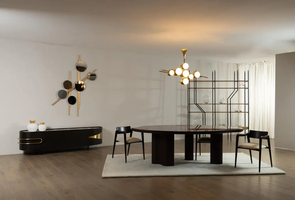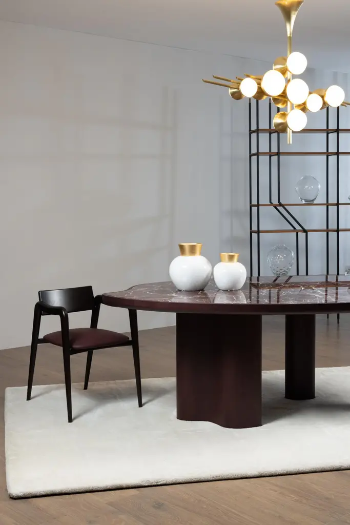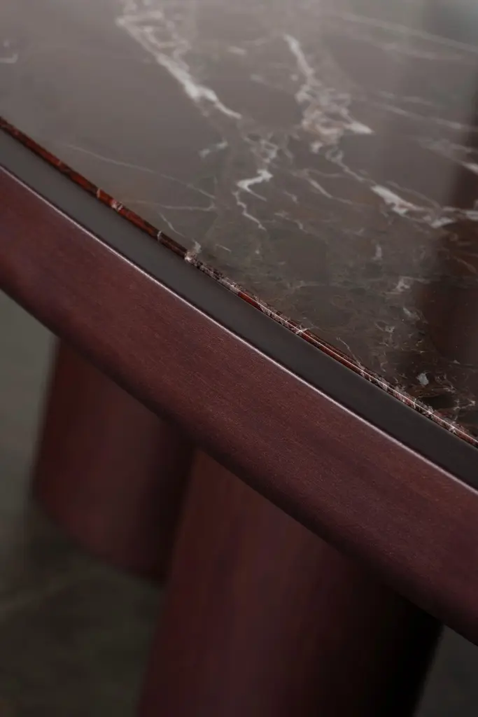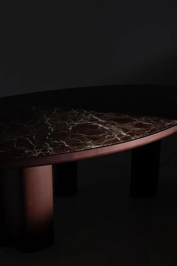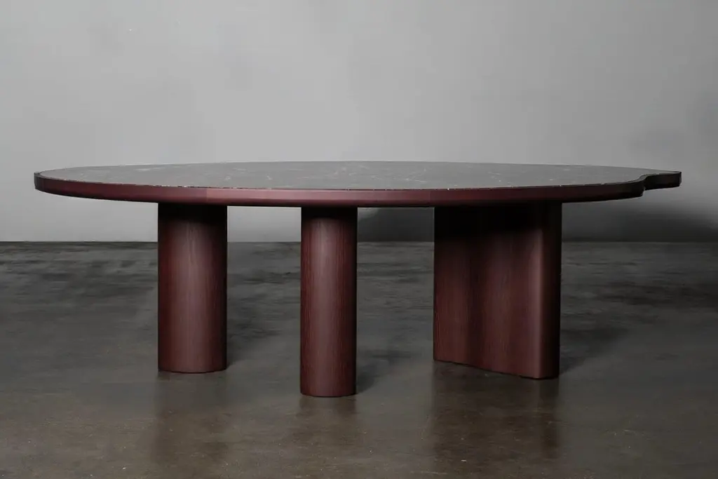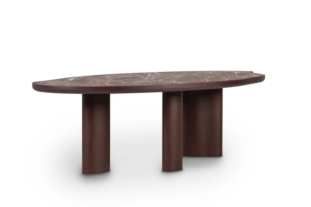 Organic Modern Cerdeira Dining Table, Contemporary Collection, Handcrafted in Portugal - Europe by Greenapple.The Cerdeira marble dining table captures the raw beauty and organic essence of Cerdeira Beach, translating nature’s fluidity into artistic expression. Its sculptural form defies convention, featuring an asymmetrical marble top that reflects a sense of creative freedom and movement. More than a marble dining table, Cerdeira is an artistic statement—where form, texture, and innovation come together in perfect harmony.The Cerdeira dining table features a top crafted from American oak veneer, stained in burgundy, finished with open-pore and a matte varnish. The surface is accented with an inlaid section of polished Rosso Levanto marble, in dark red tones with white veins. Supporting the top are three solid wooden legs. Brushed blackened brass components, sealed with a matte varnish, connect the table top to the bases. Additionally, both the solid wood and veneer are treated to be anti-fungal and vermin-free, ensuring exceptional longevity and preservation.The Cerdeira dining table can be customized in terms of dimensions, materials and finishes. Cerdeira 8-Seat Dining Table Material CodesWD183 American Oak, Stained Open-pore, Varnished, Burgundy, MatteST039 Rosso Levanto Marble, Polished, Dark Red-White, GlossME031 Brass, Brushed, Blackened, Varnished, Black-Brass, MatteHandcrafted in Portugal - Europe by GreenappleUnique by design, Crafted by peopleGreenapple transforms contemporary spaces into exclusive narratives of design and craftsmanship. From custom-made furniture to bespoke interiors, each creation is a timeless work of art, shaped by master artisans who honor centuries-old techniques.Founded in 2005 by Sérgio Rebola and Rute Martins, Greenapple has earned global recognition among high-end clientele and leading design firms. While Rute designs each unique piece, Sérgio ensures uncompromising quality from design to production and from production to your home. We provide a seamless experience, offering short production lead times, worldwide delivery within 7 to 10 days, and white-glove service upon request.For U.S. clients, we can handle all customs clearance, cover duties, and offer white-glove service as well upon request.Table