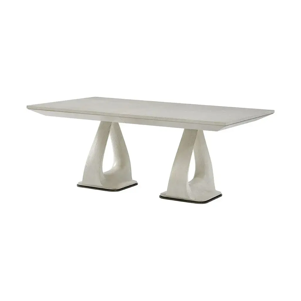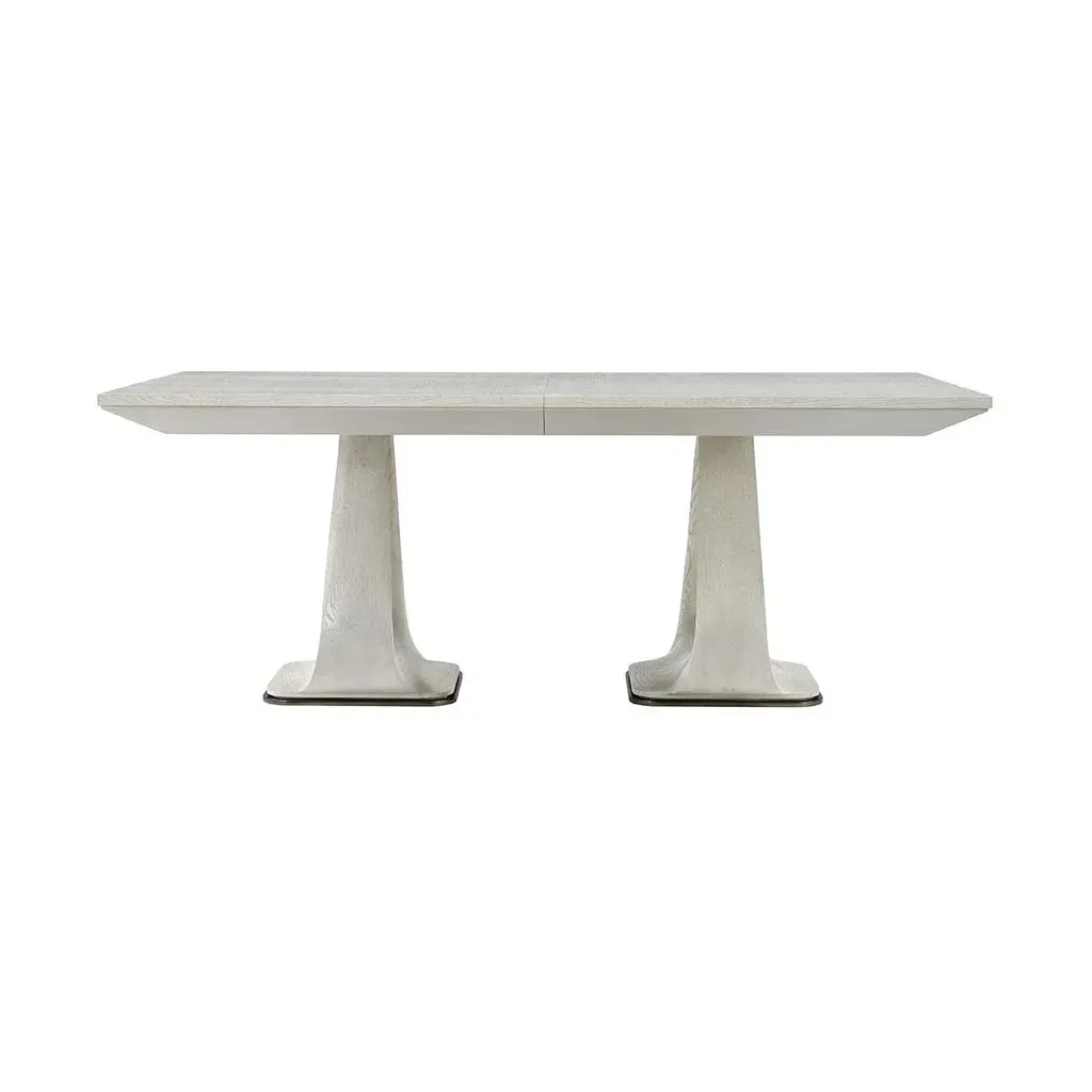 Masterfully crafted from oak, and finished in opal white finish, this table showcases the natural beauty of the wood through its gentle, soft lines and a knife-edge top, creating a sophisticated and inviting atmosphere. Featuring a unique shaped frame that rests upon a sturdy metal base, blending organic wood elements with modern design for a striking look. The opal finish enhances the clean, contemporary feel, making it a versatile addition to any dining room. Open Dimensions: 116" W x 42" D x 30" H Closed Dimensions: 76" W x 42" D x 30" H With 2 20" leaves.