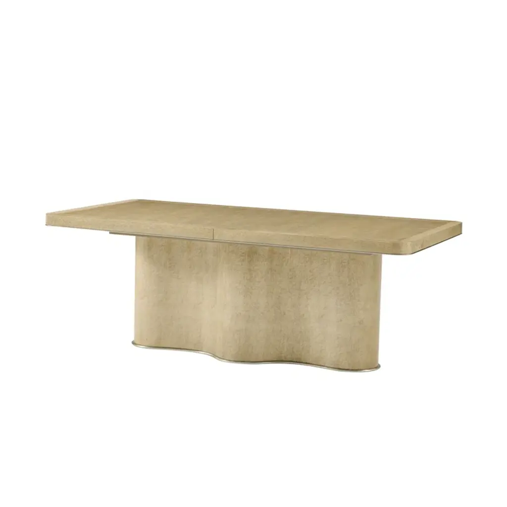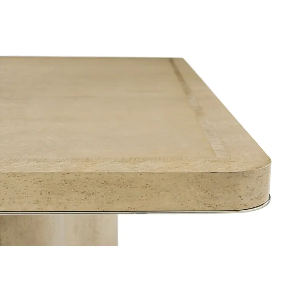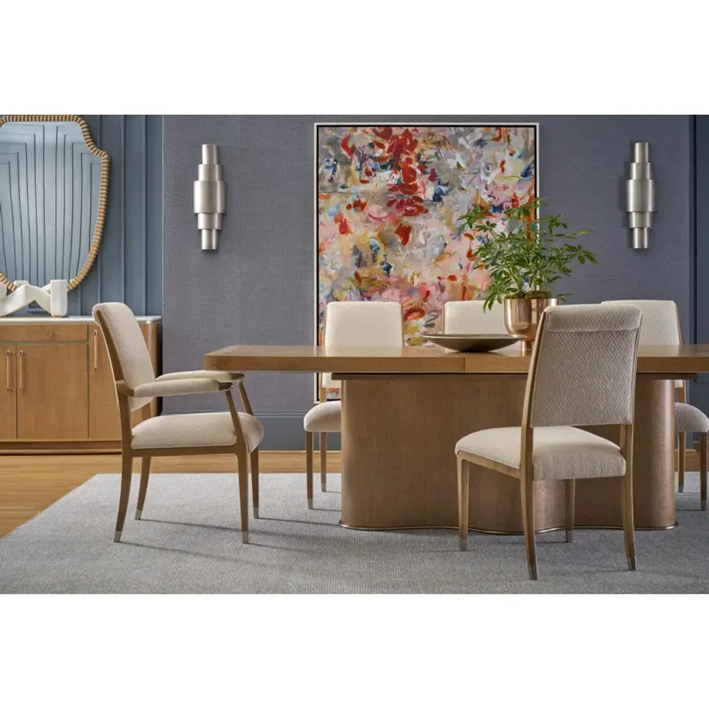 The Origins Rectangular Dining Table is an elegant nod to 1920s design with contrasting materials and attenuated forms. The surface is composed of figured sycamore inlay and beautifully accented with brass trim. Extends with two 18" leaves. Handcrafted in birdseye maple.